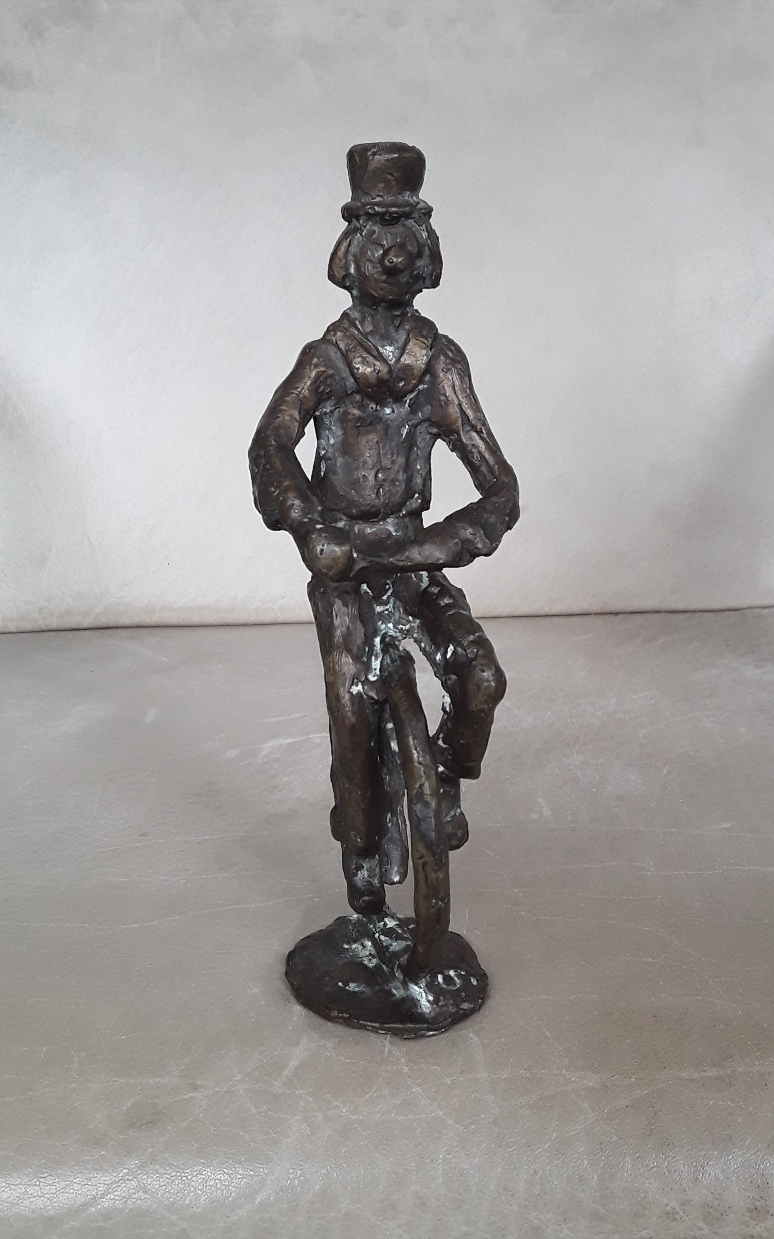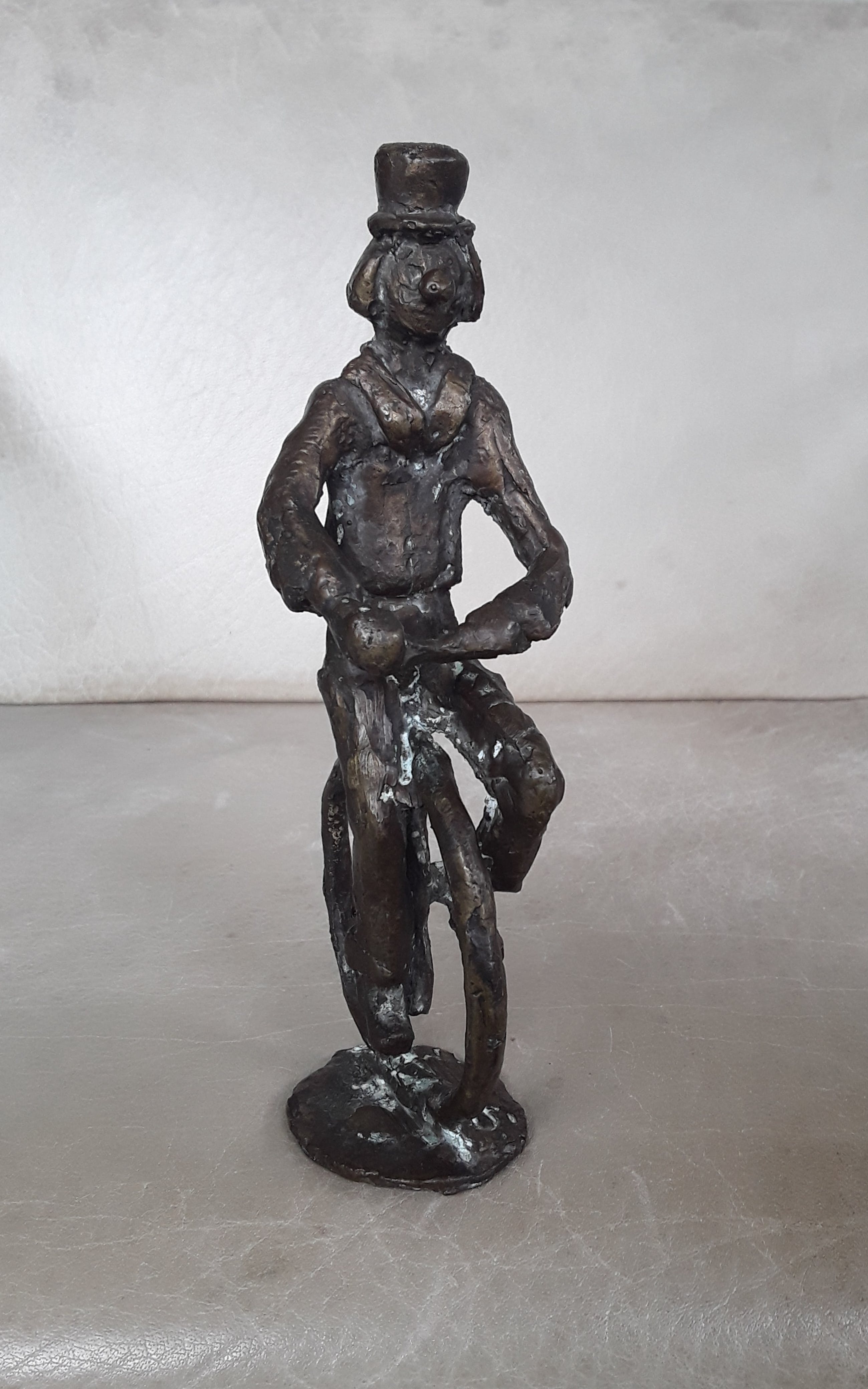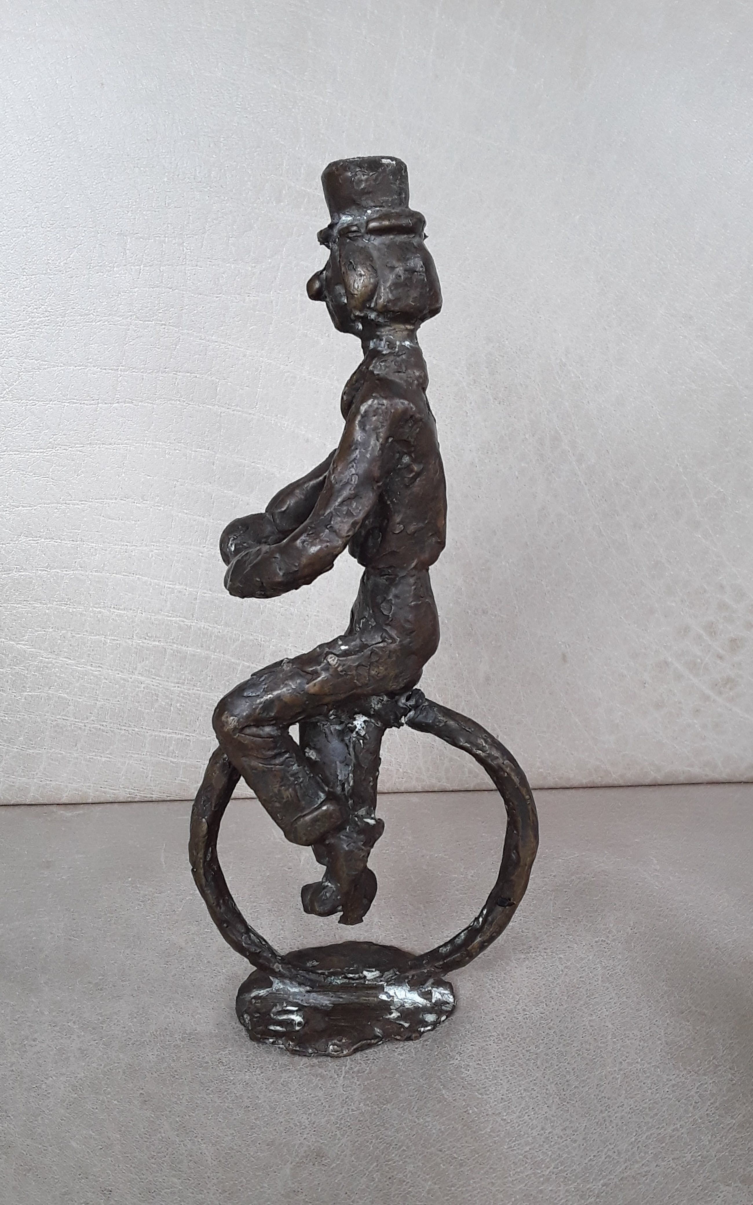 Een bronzen beeld clown op een eenwieler gemaakt door kunstenaar Siem Wardenaar.