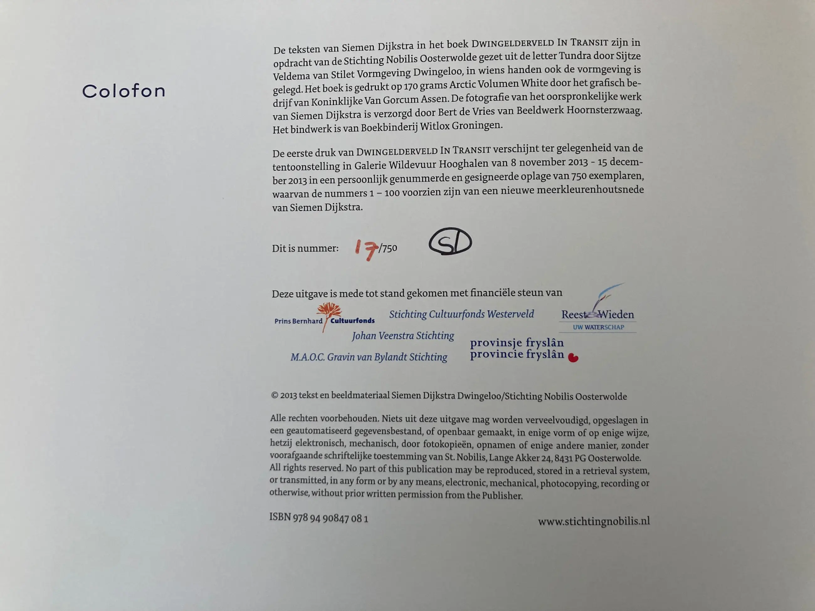 Een prachtig uitgevoerd boek in een gelimiteerde uitgave, gesigneerd door Siemen Dijkstra. Het boek is een weergave in woord en beeld van het gebied, van de natuurontwikkeling van het Dwingelderveld en van de liefde van de kunstenaar voor dit gebied. De tekst is beperkt; er staan vooral heel veel afbeeldingen in van houtsneden en tekeningen.