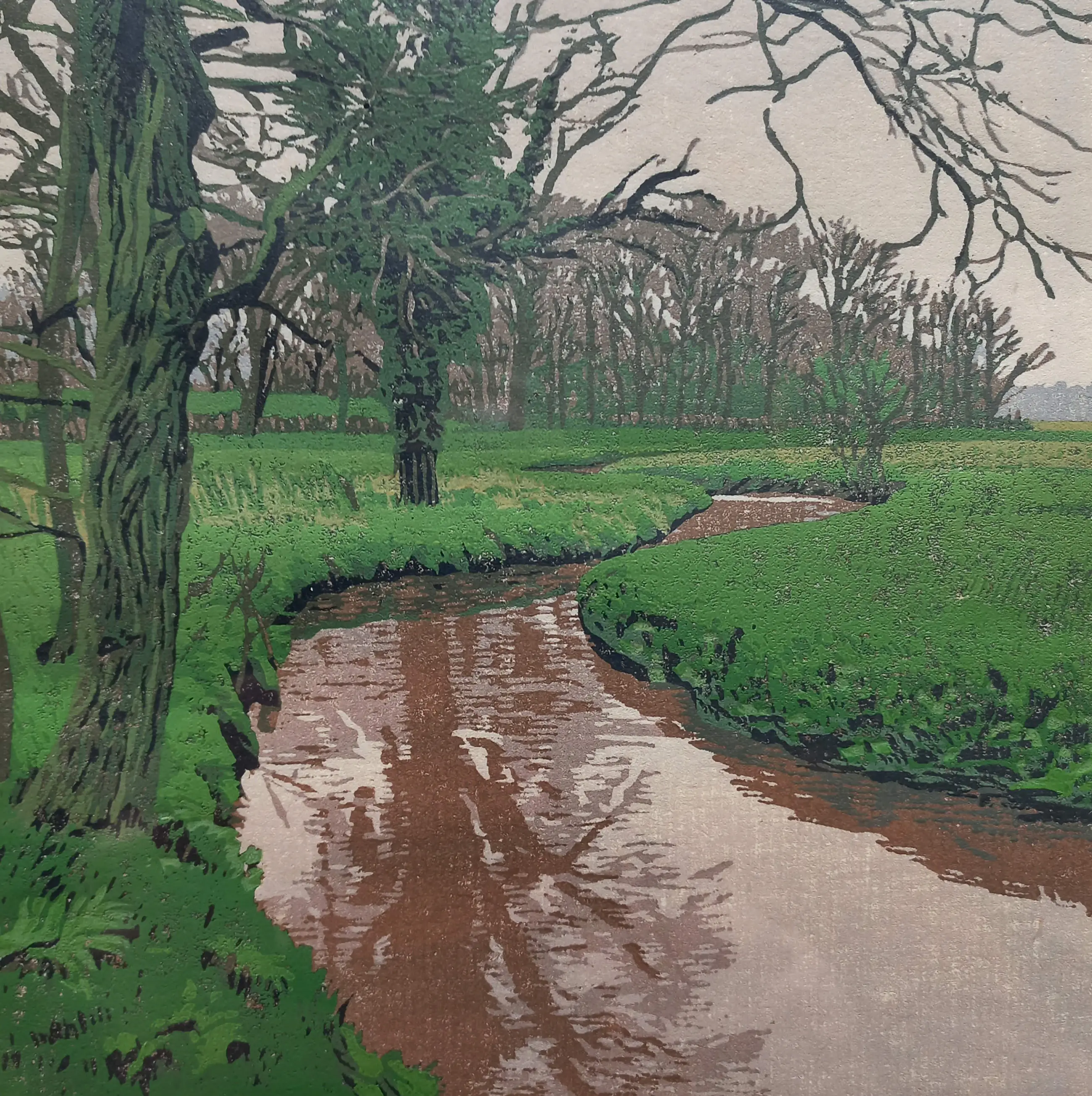 Zeer mooi Drents landschap van Siemen Dijkstra uit 2005. Houtsnede op papier, met potlood gesigneerd, voluit getiteld, gedateerd en genummerd (14/50). In nette houten lijst, achter glas en met smetteloos, zuurvrij passe-partout. Alles in zeer goede conditie.