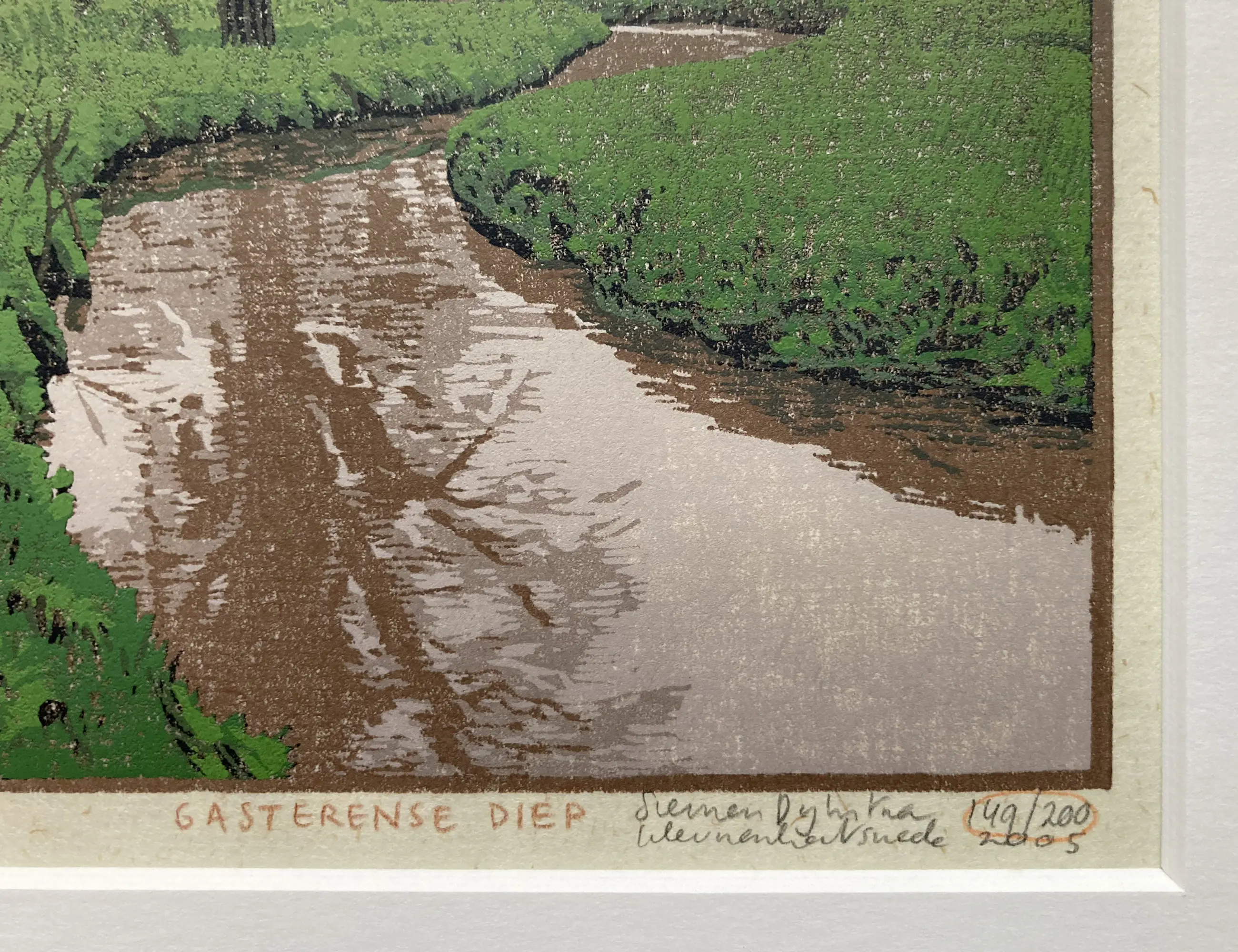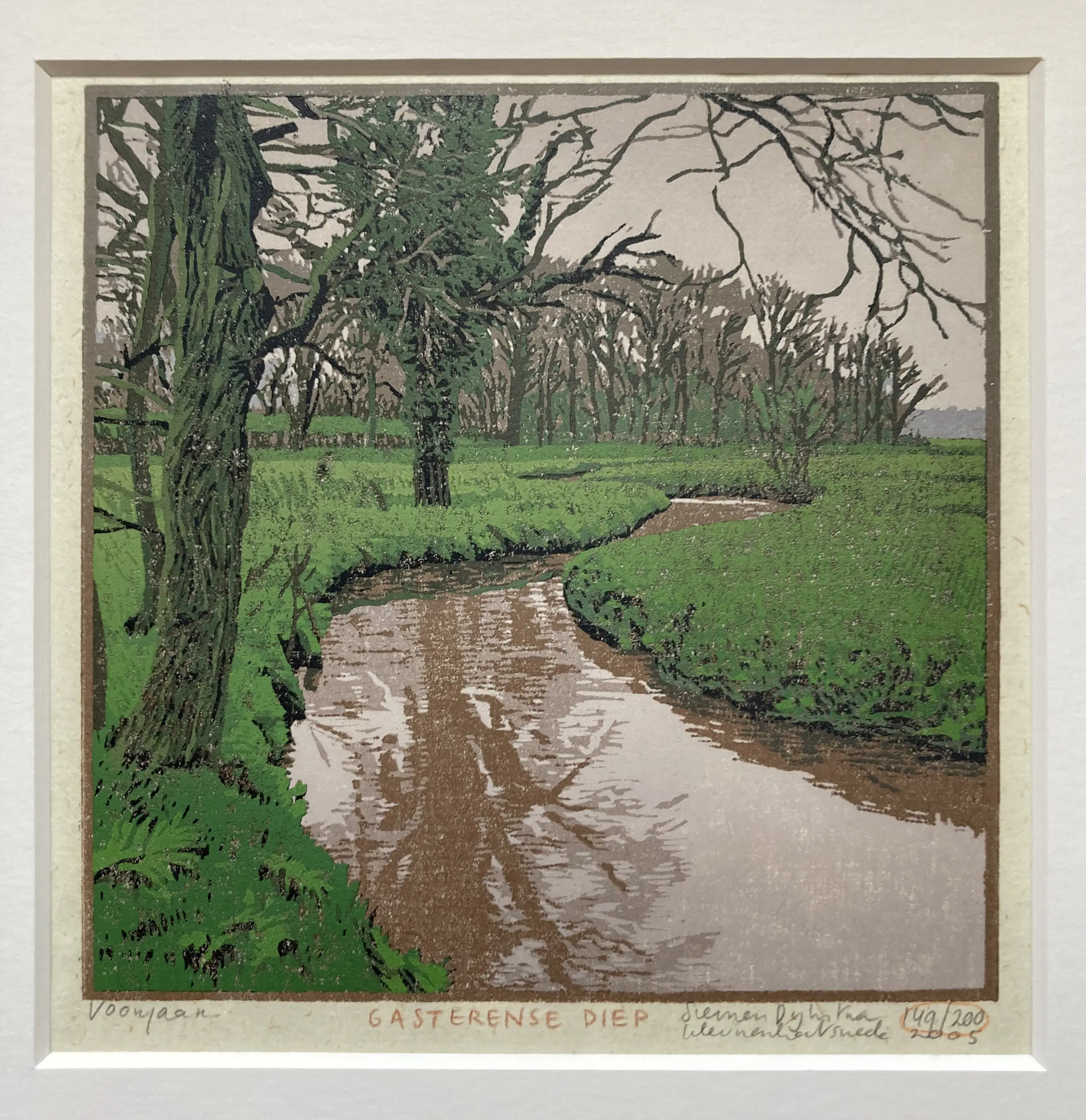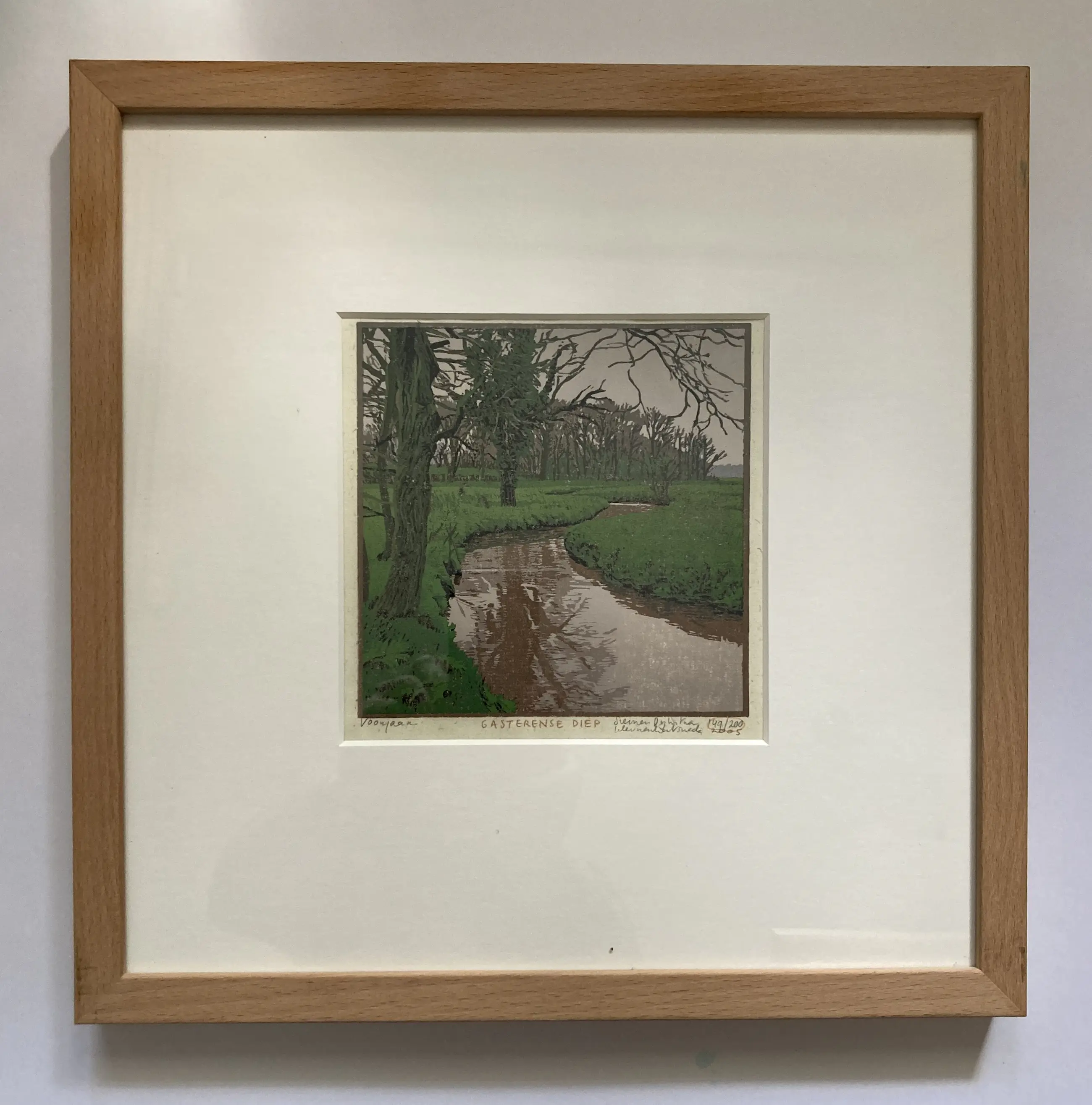 Prachtige kleuren houtsnede 'Voorjaar Gasterensediep'. Rechtsonder handgesigneerd. Nr. 149 van 200
