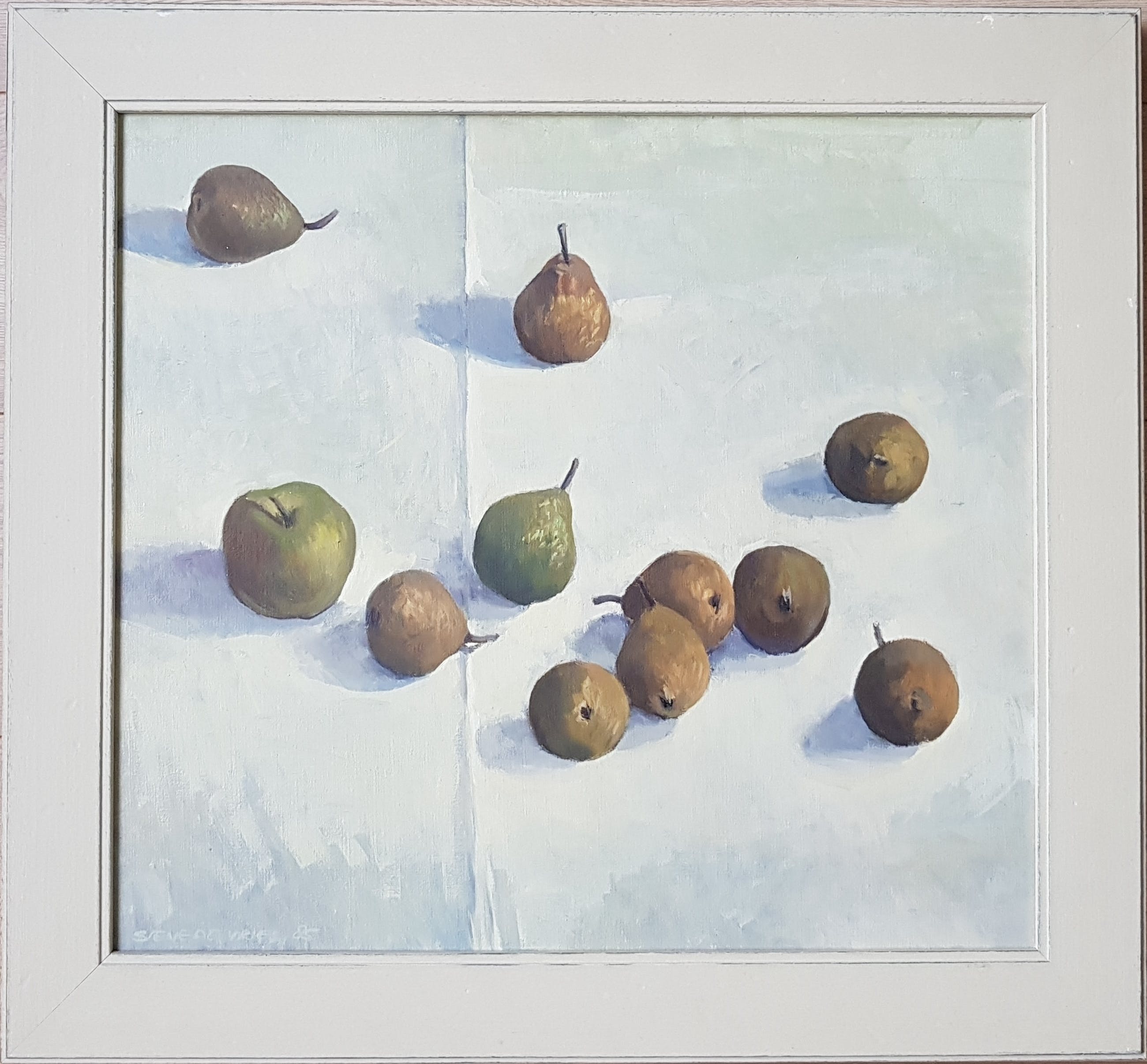 Wegens beëindigen kunsthobby doe ik afstand van mijn collectie Siene de Vries (Drachten 1956) Olieverf op doek Stilleven met peren Linksonder gesigneerd en gedateerd Siene de Vries ’85 Doekmaat 50 x 55 cm Lijstmaat 62 x 67 cm