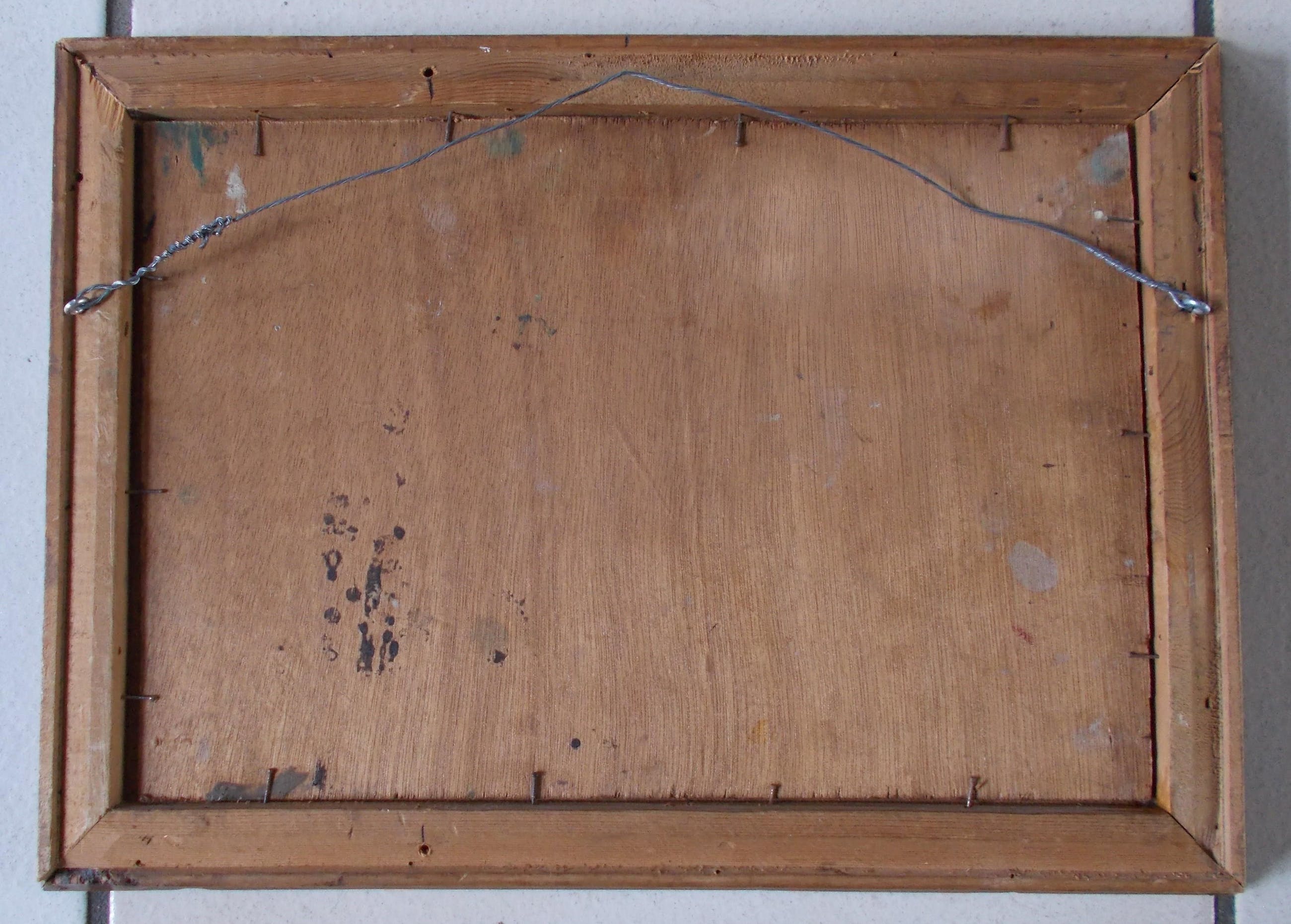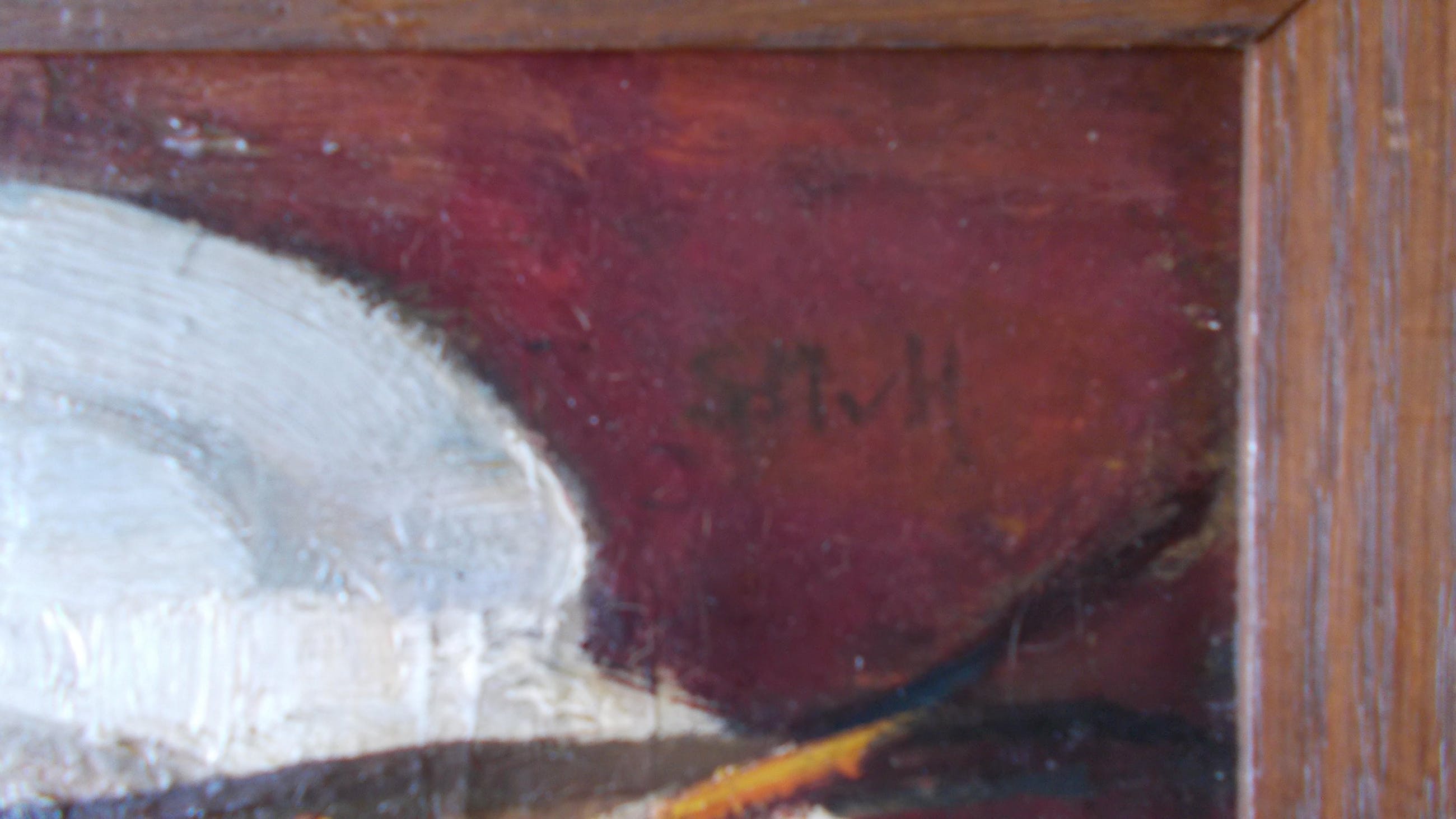 Olieverf op triplex paneel.Gesigneerd met initialen S M v H rechtsboven.Ingelijst in eenvoudige houten lijst.