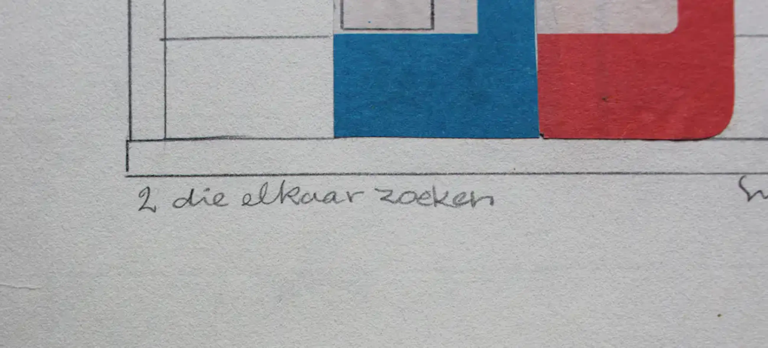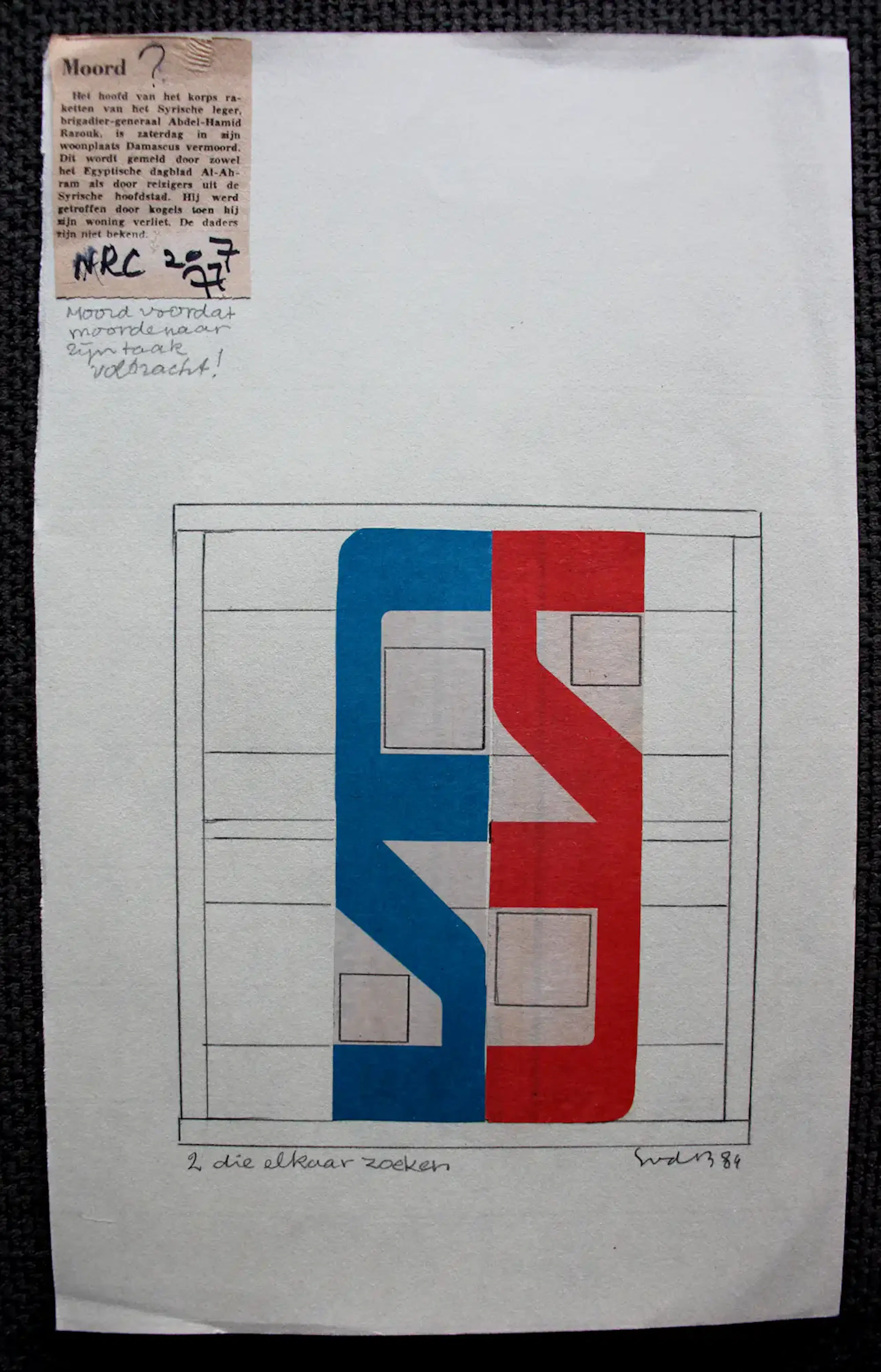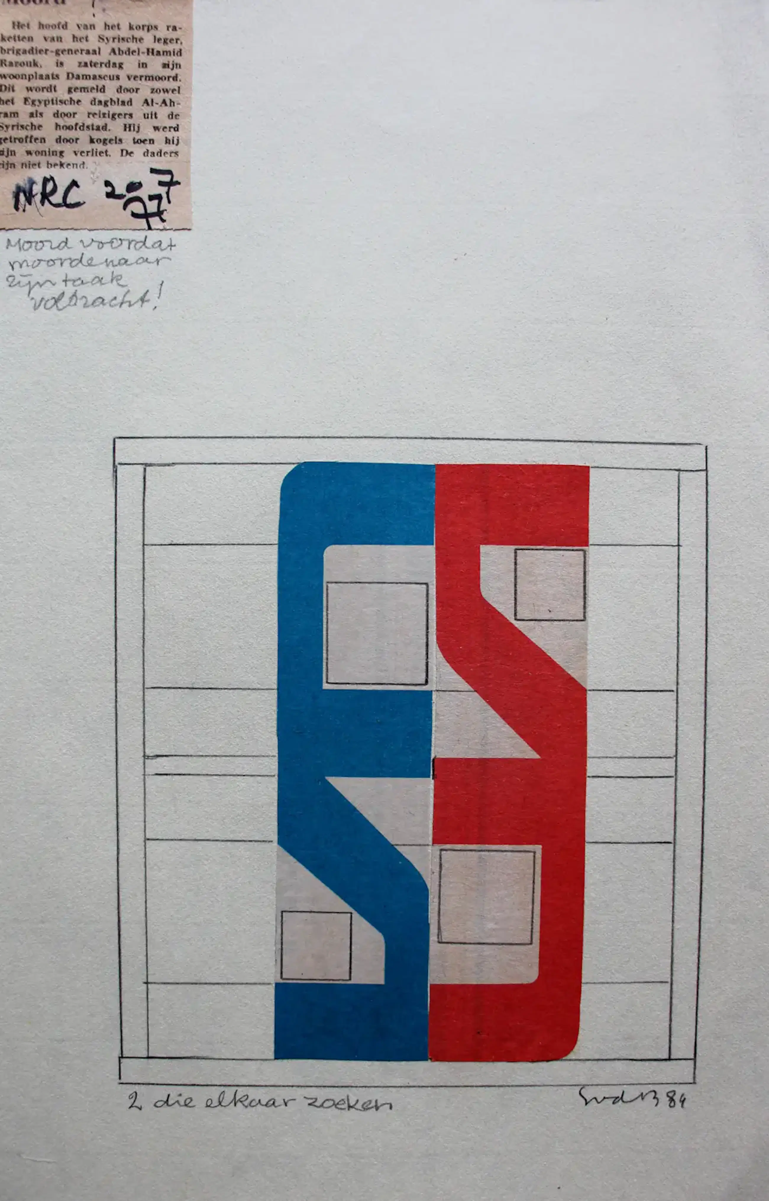 Collage/krantenknipsel van Siep v/d Berg uit 1984. Titel: 2 die elkaar zoeken. Het werk is rechts onder met potlood gesigneerd. De authenticiteit van het aangeboden werk wordt volledig gegarandeerd. Een certificaat van echtheid kan, op aanvraag, worden gemaild.