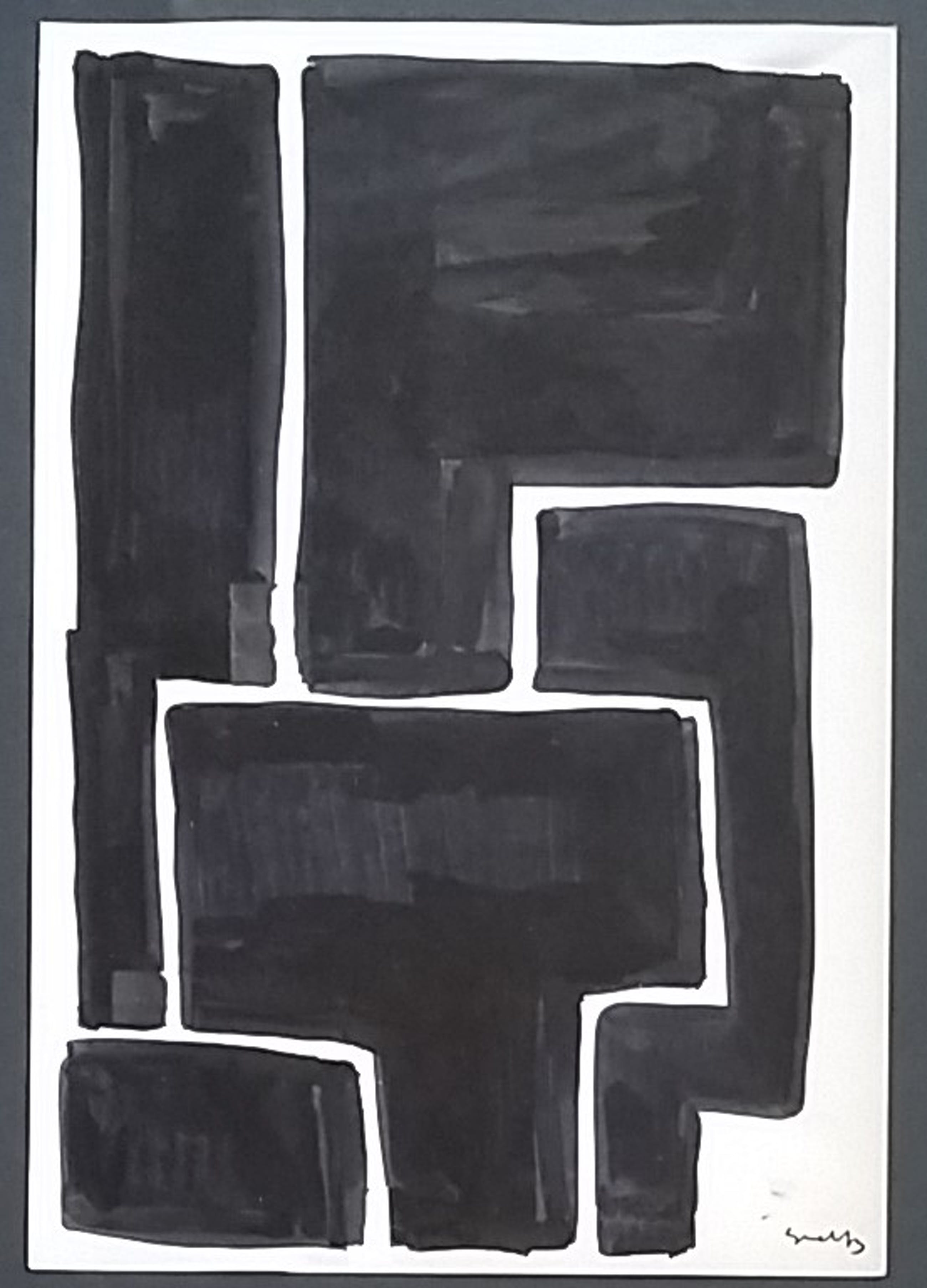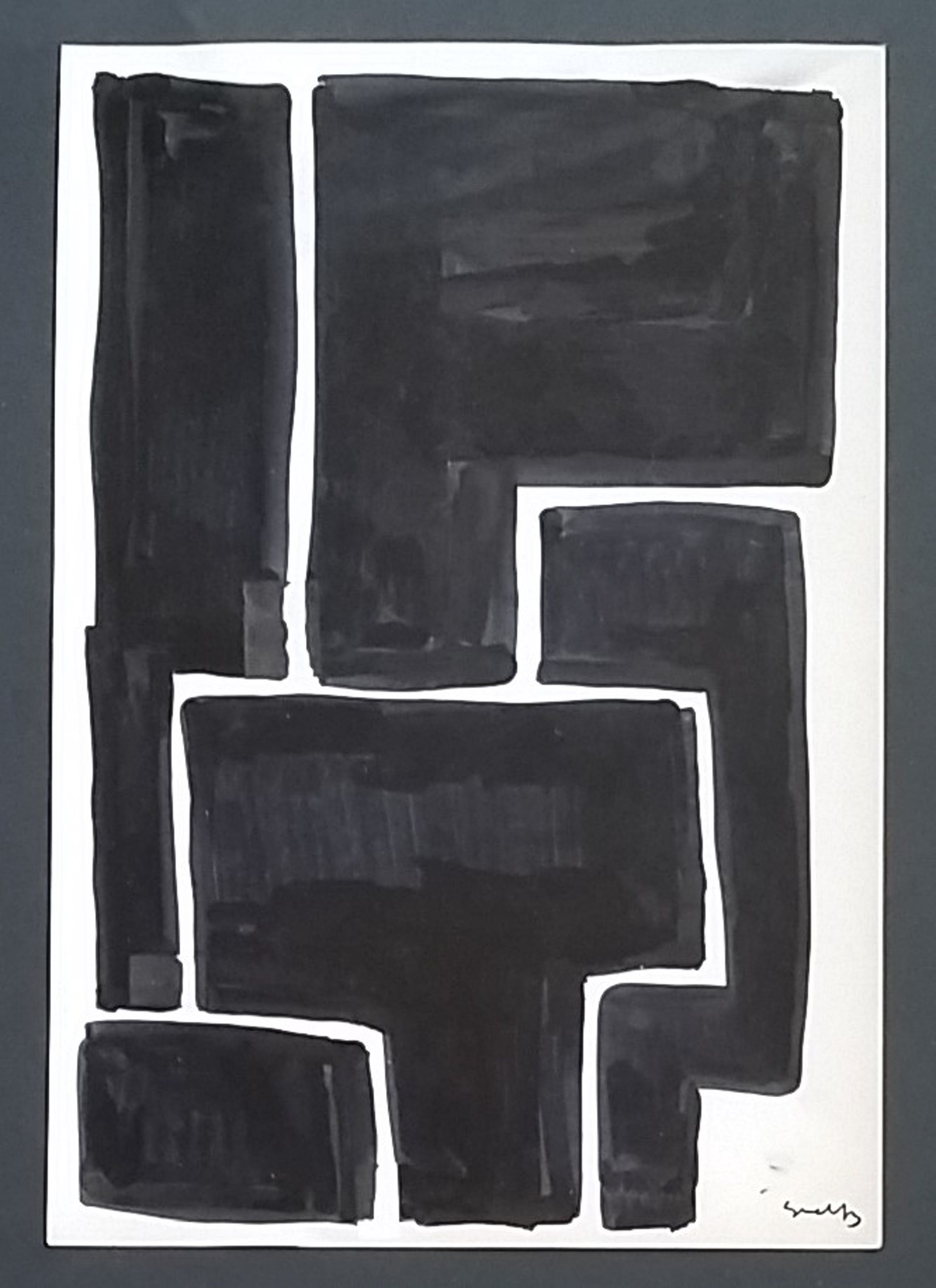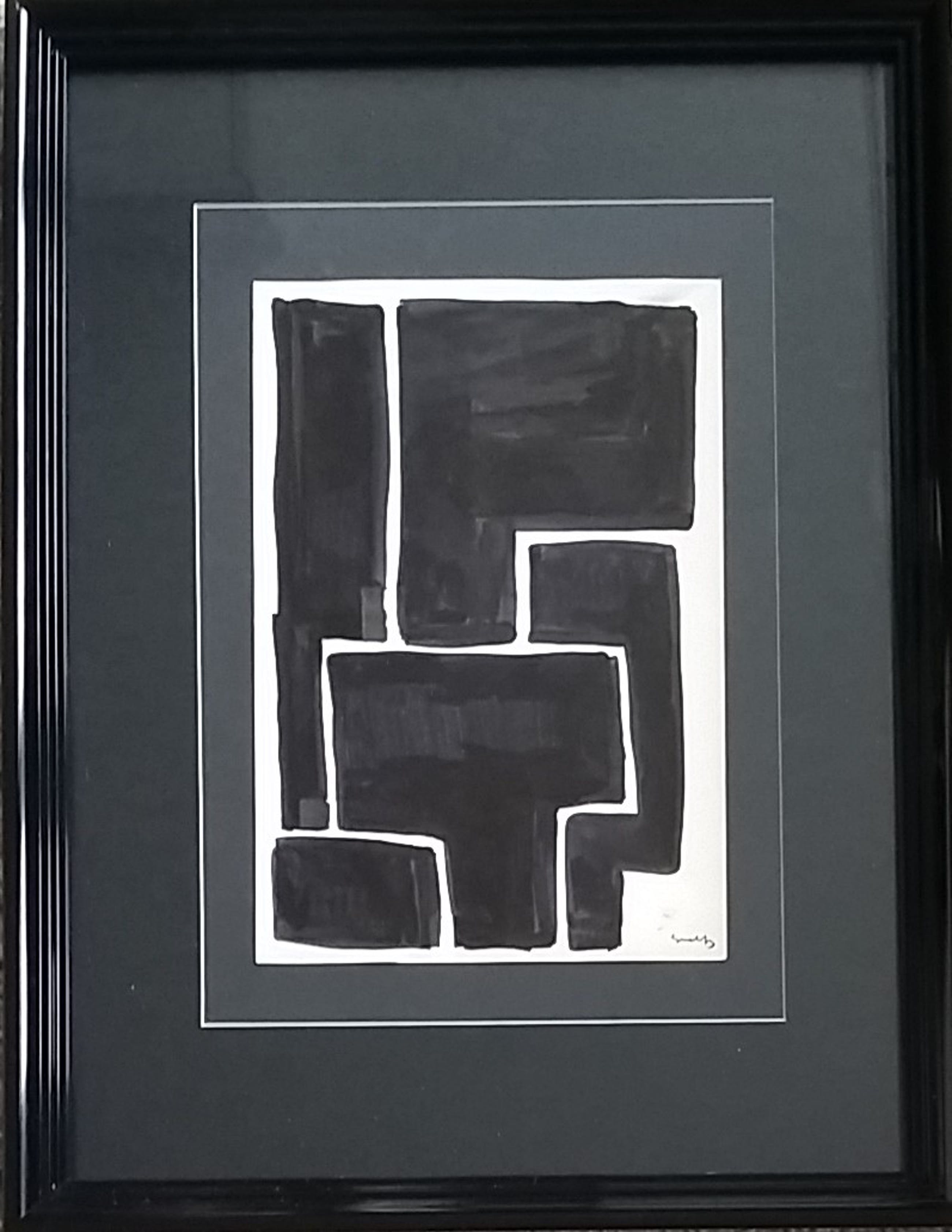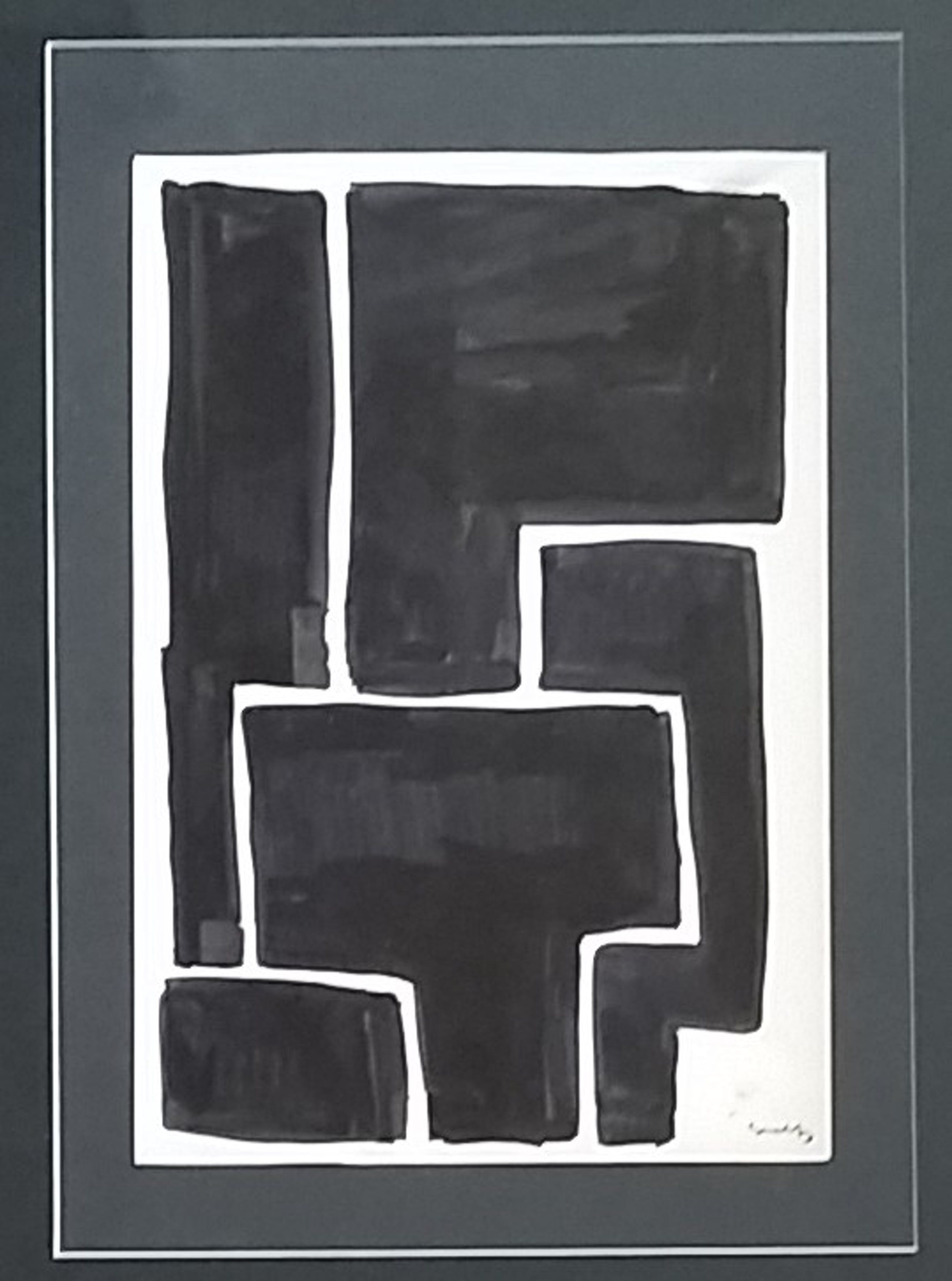 Abstract en geometrische vlakverdeling Inkt op papier circa 26x20cm In een zwarte omlijsitng met zuurvrij passepartoutGesigneerd rechts met initialen