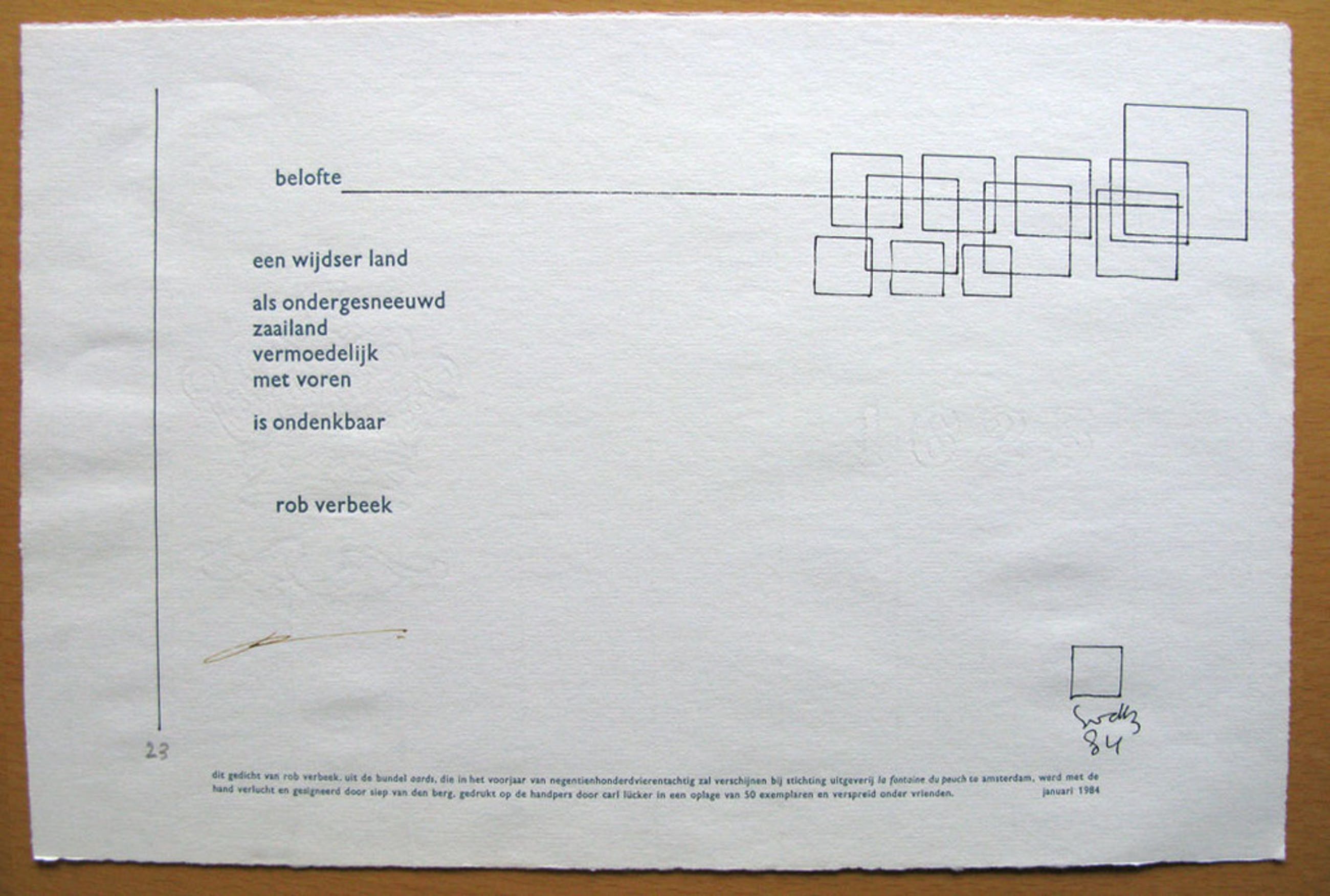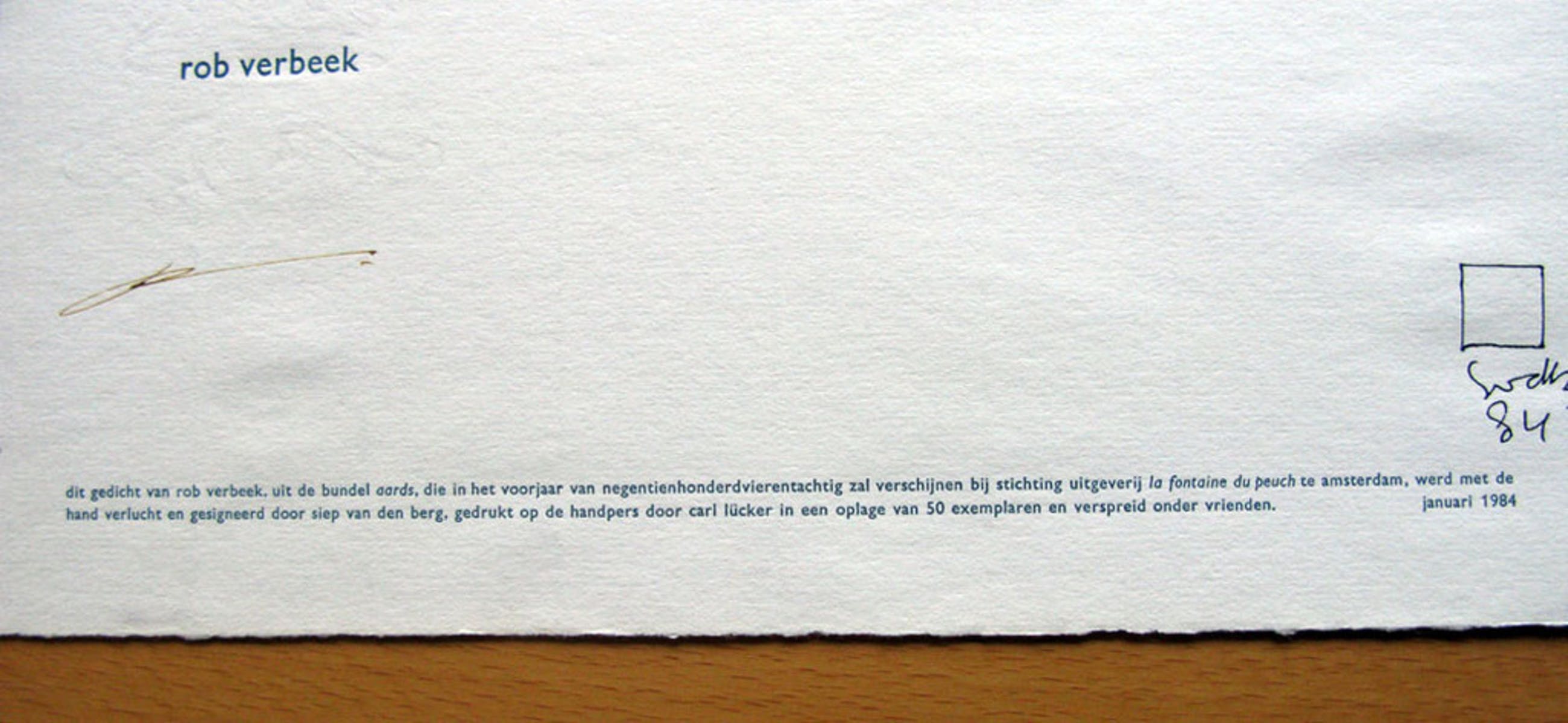 Het gedicht is van Rob Verbeek en met de hand verlucht door Siep van den Berg. De oplage is 23/50 en het jaartal 1984. De rijmprent is door beide kunstenaars gesigneerd. De prent is afgedrukt op geschept papier van watermerk voorzien en de conditie is uitstekend. Afmeting is 23 x 35 en de verzending is aangetekend via PostNL.