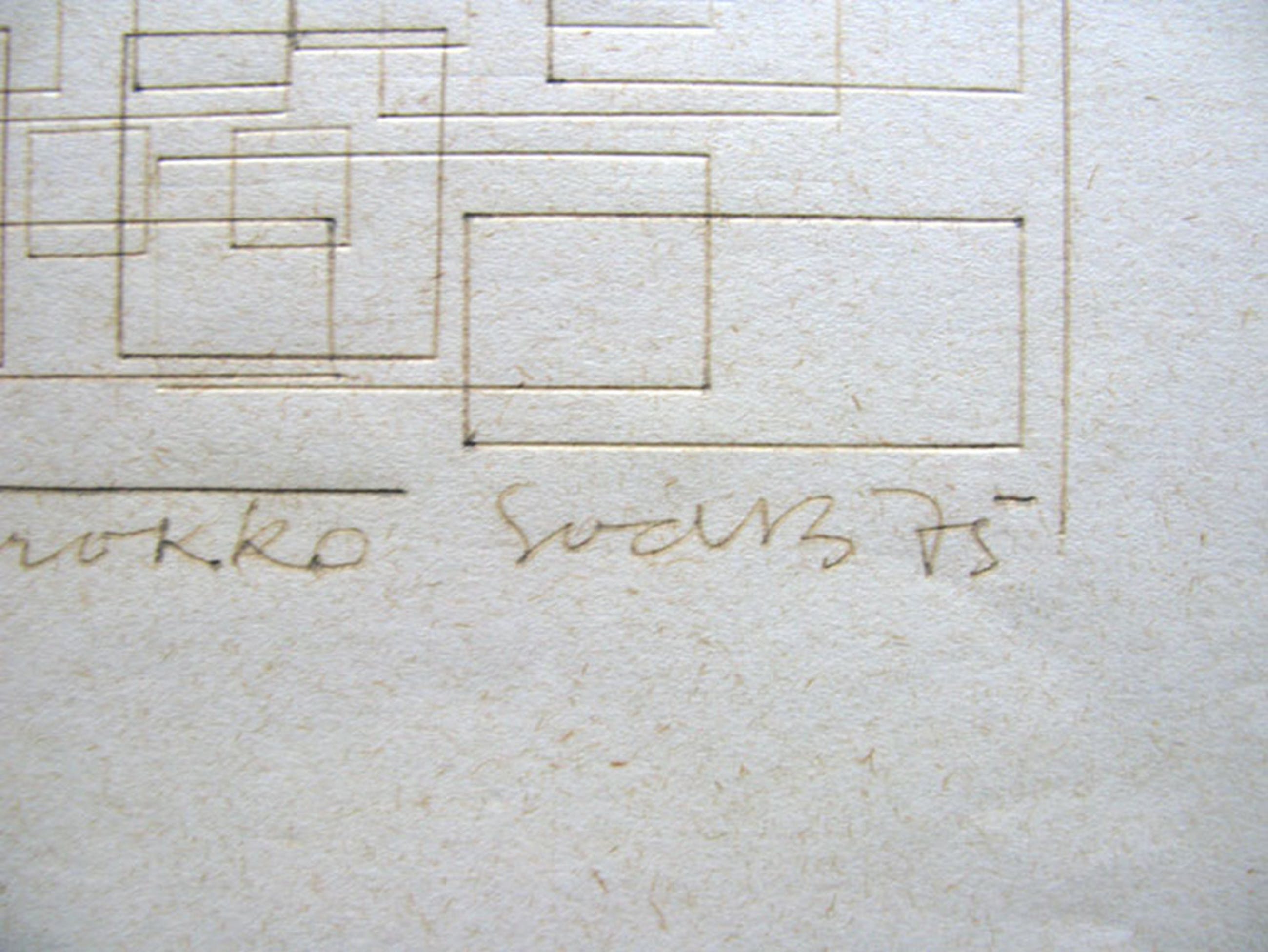 De tekening is gemaakt op gelig papier, dat samen met de inkt in de loop van de tijd licht is verkleurd. De kunstenaar heeft de tekening van twee gekleurde stroken voorzien en heeft rechtsonder zijn handtekening geplaatst, samen met de titel Marokko en het jaartal 1975. De tekening is van een opdracht voorzien "voor dichter en vriend Kees Winkler". Door verkleuring en een lichte vouw is de conditie goed te noemen. De afmeting is 23 x 32 en de verzending is aangetekend via PostNL.