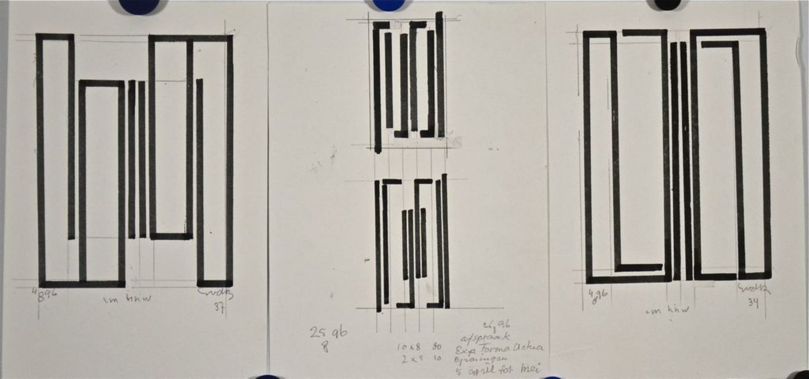Drie tekeningen van Siep van den Berg. Alle drie uit 1996. Twee maal “im HNW” wat staat voor in memoriam H.N. Werkman (zijn schoonvader). Onder de derde tekening staat “afspraak Exp. Forma Actua Groningen".