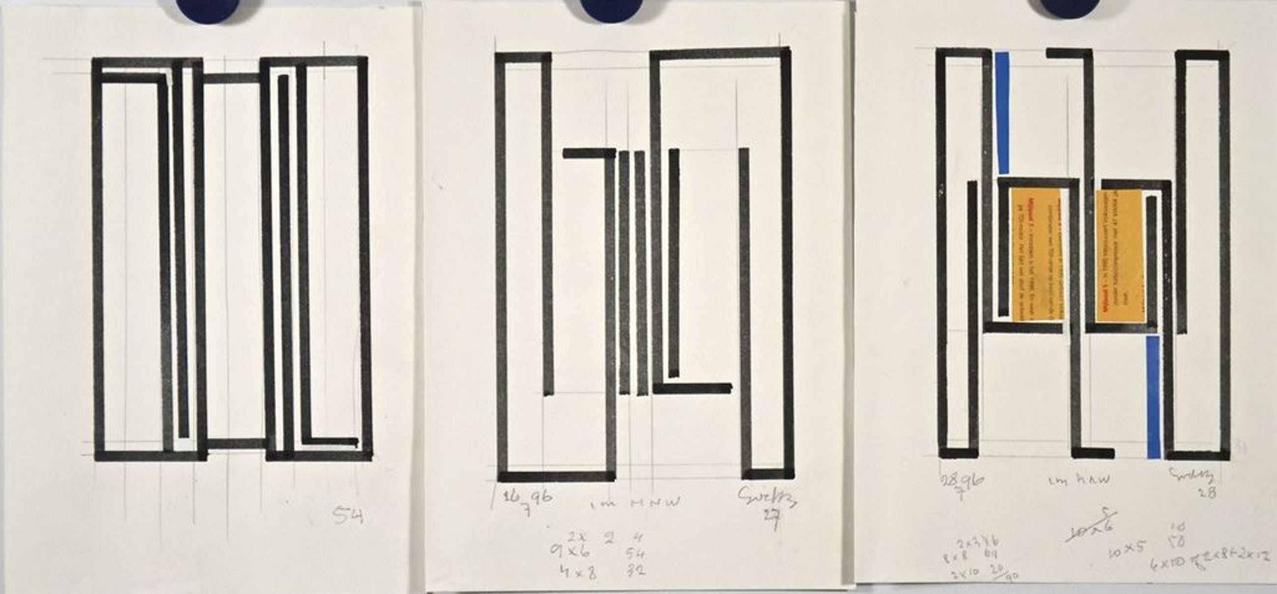 Twee tekeningen en een collage van Siep van den Berg. Alle drie uit 1996. Onder de collage en onder een van de twee tekeningen staat “im HNW” wat staat voor “in memoriam H.N. Werkman” (zijn schoonvader).