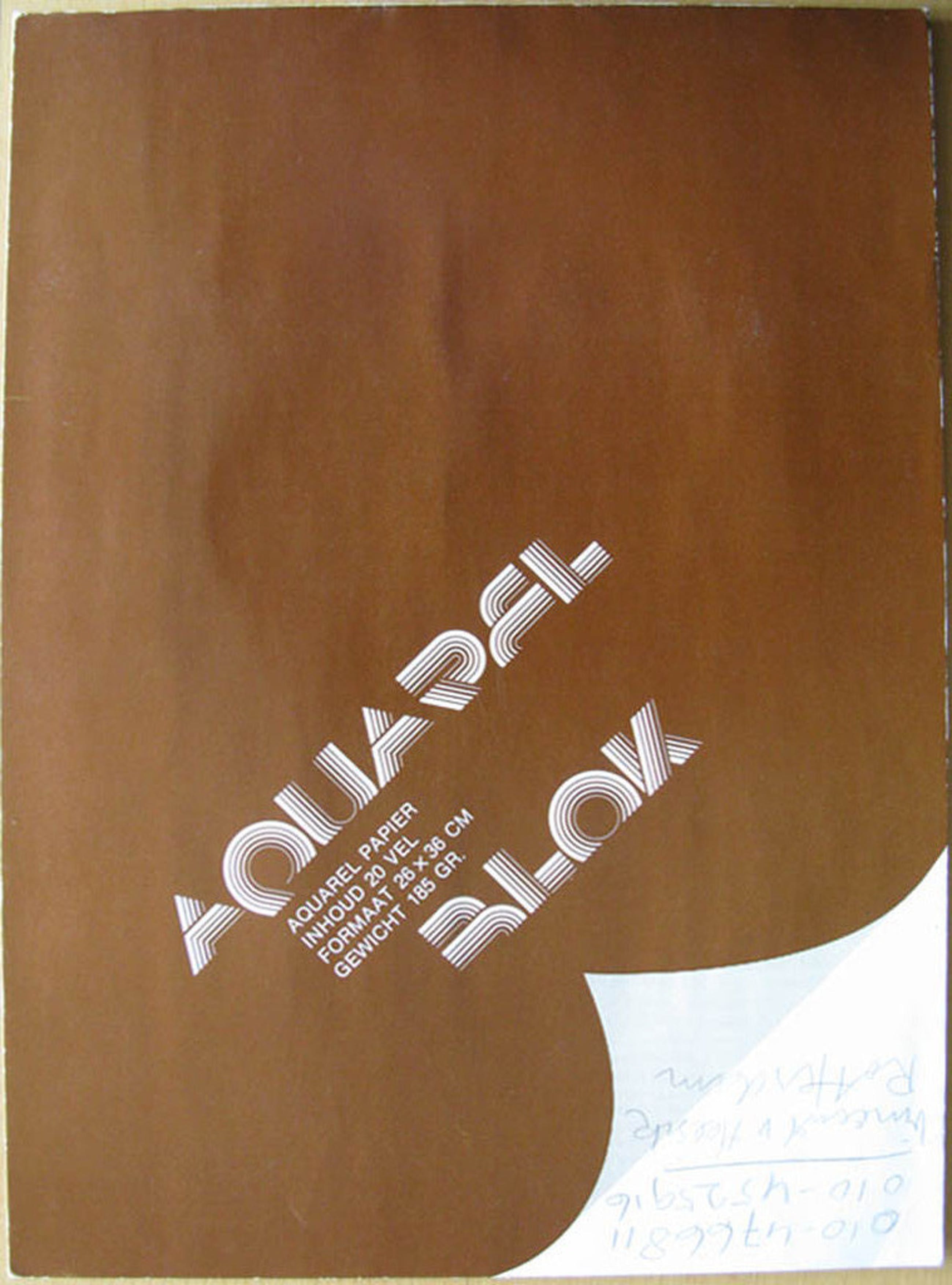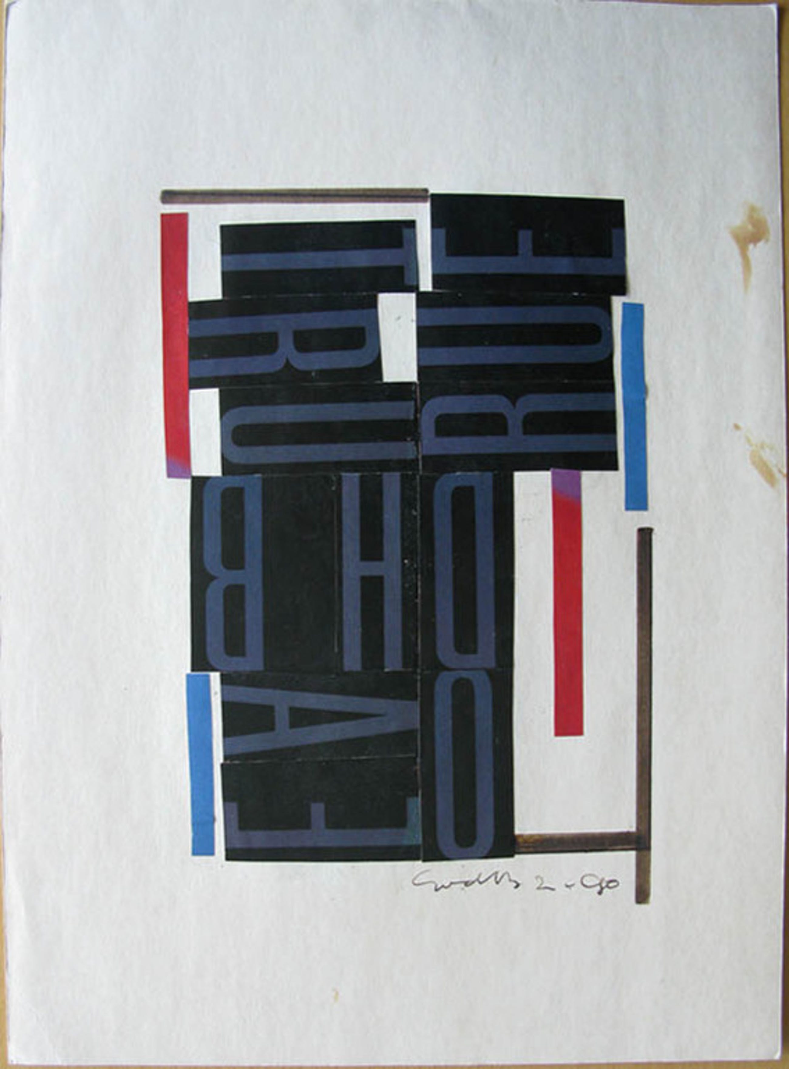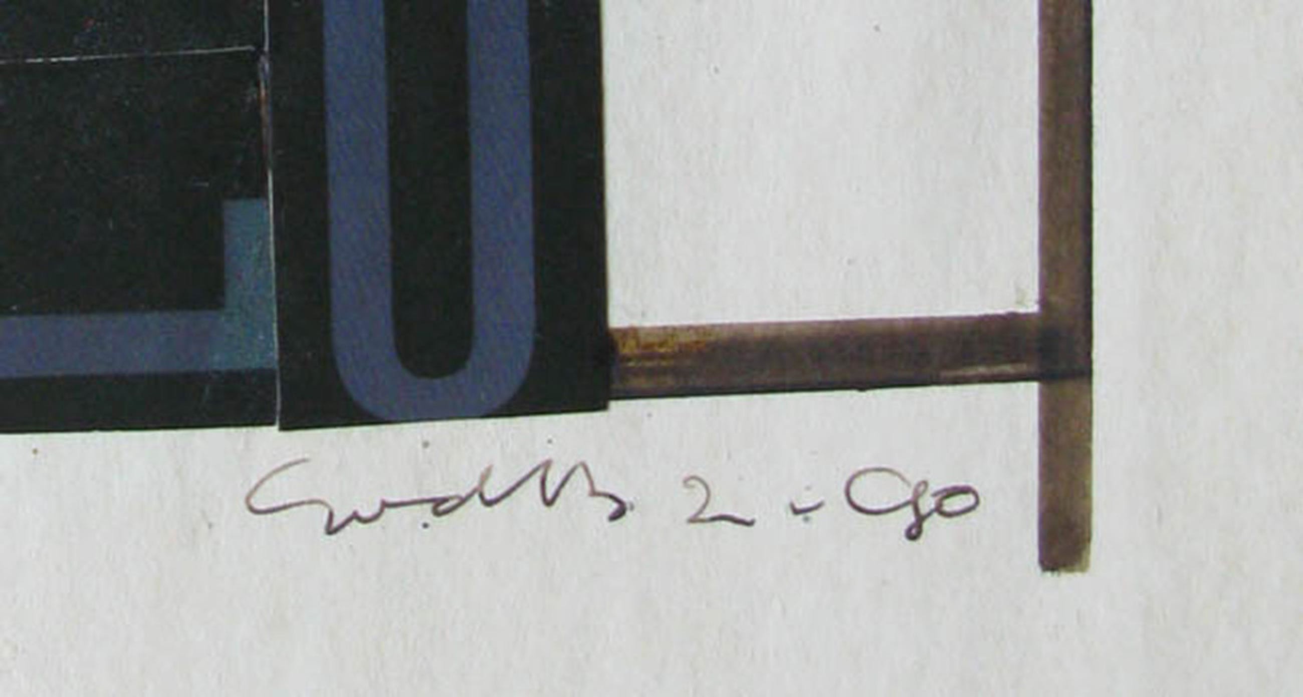 Een collage geplakt op de achterzijde van het schutblad van een aquarelblok. Het betreft een collage van donkere letters op een zwarte achtergrond aangevuld met blauwe en rode stroken en enkele door de kunstenaar getrokken strepen. Het werk is rechtsonder gesigneerd en het jaartal is 1990. Het blad van de collage is licht verkleurd en aan de rechterzijde zijn enkele vlekken ontstaan. De conditie van de collage is goed te noemen. De afmeting van het blad is 36 x 26. De verzending is aangeteend via PostNL.