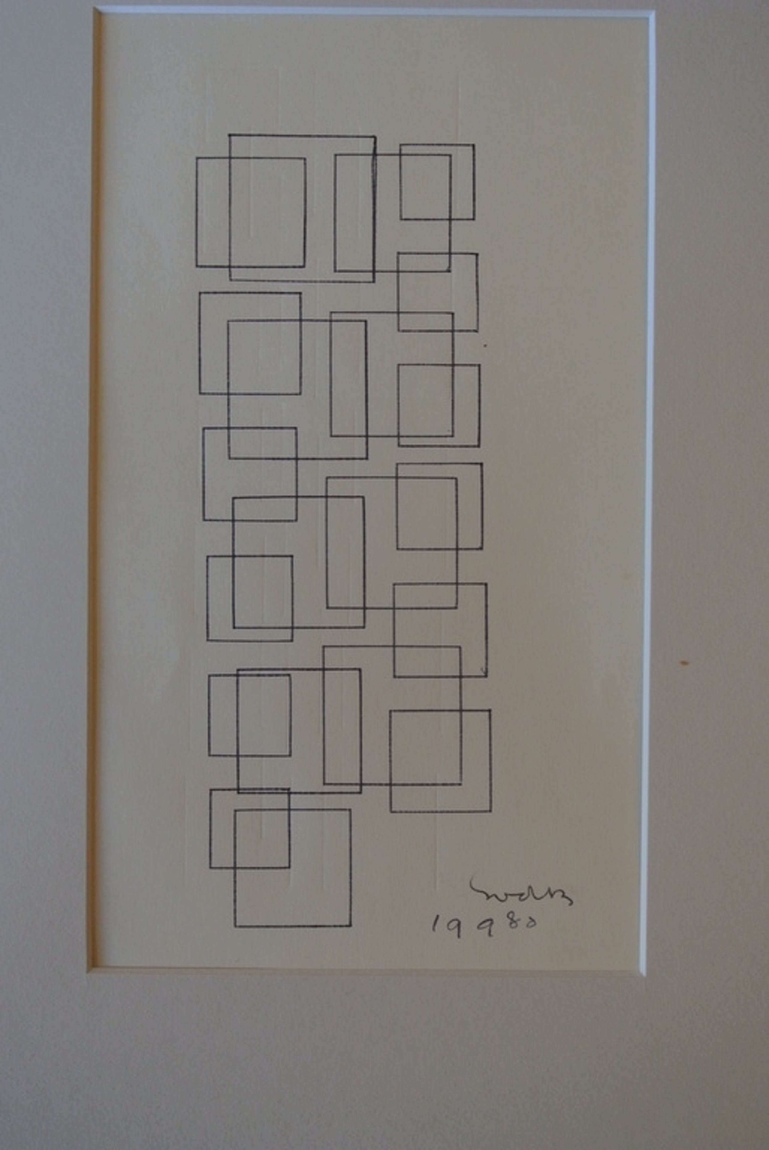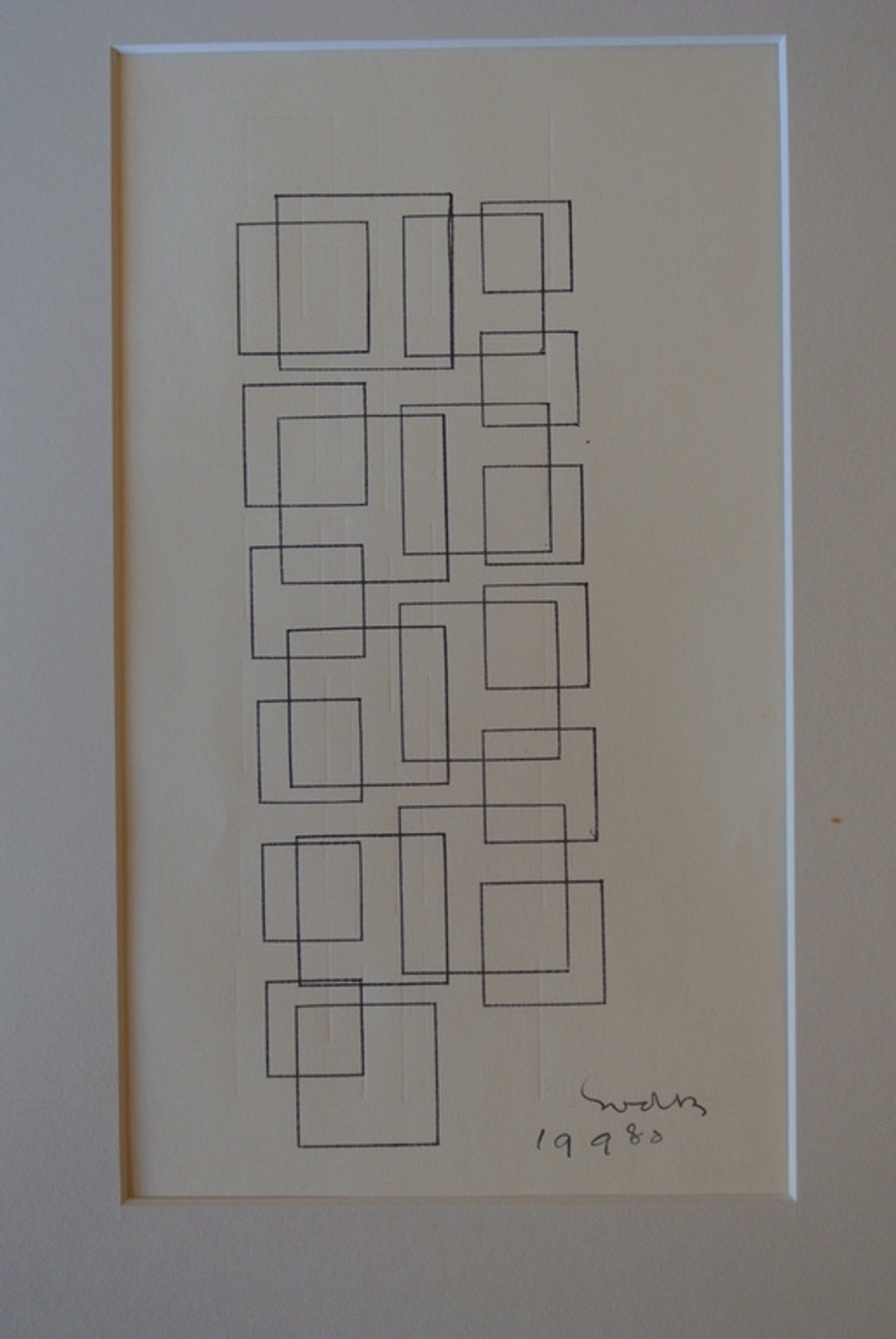 Op zoek naar het ultieme grotere werk tekende hij in zijn atelier heel veel voorbereidende schetsen. Vele uren per dag besteedde hij om, met zijn enorme vakmanschap, tot een bevredigend resultaat te komen. Geometrie was zijn thema en deze tekening is een variatie hier op.