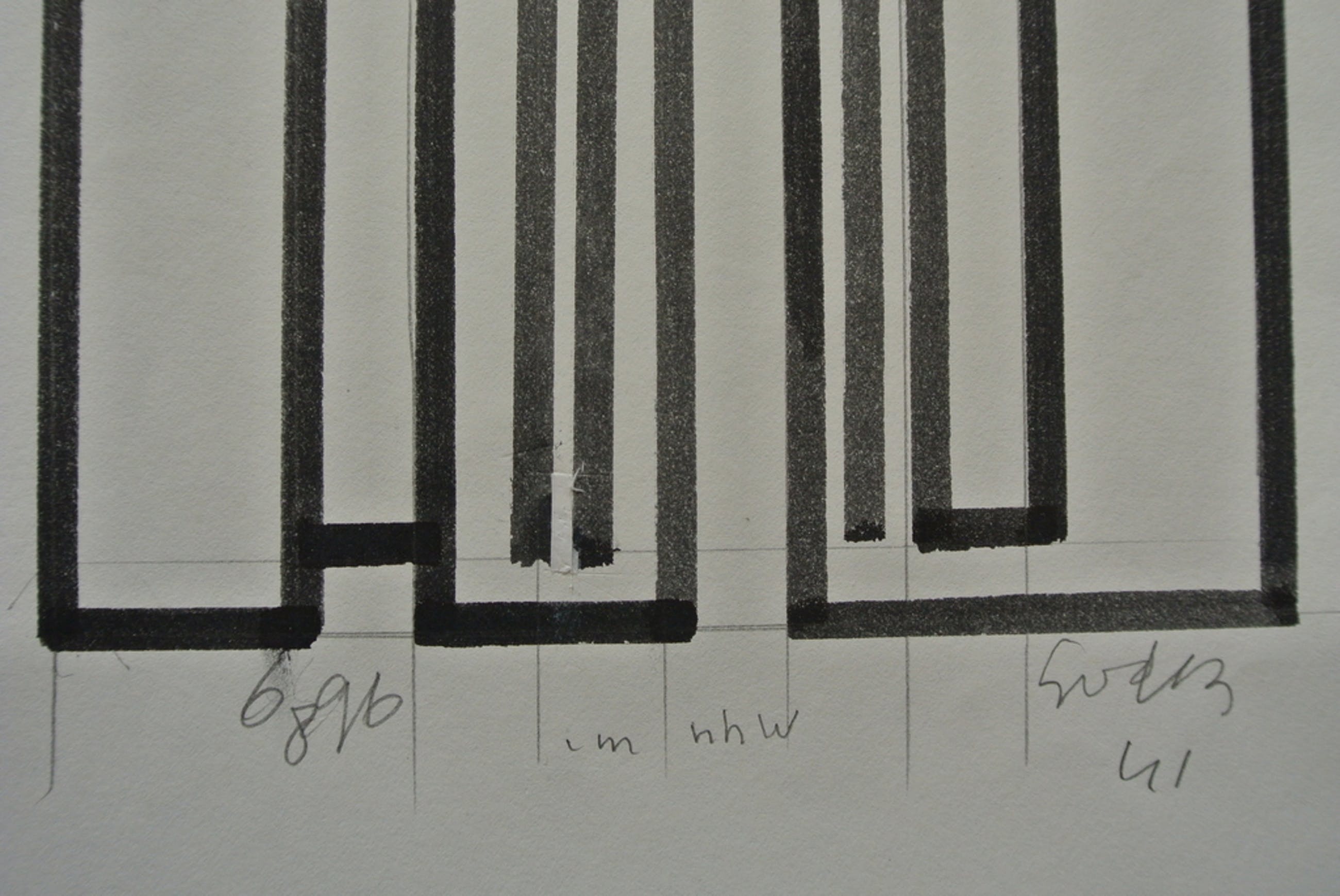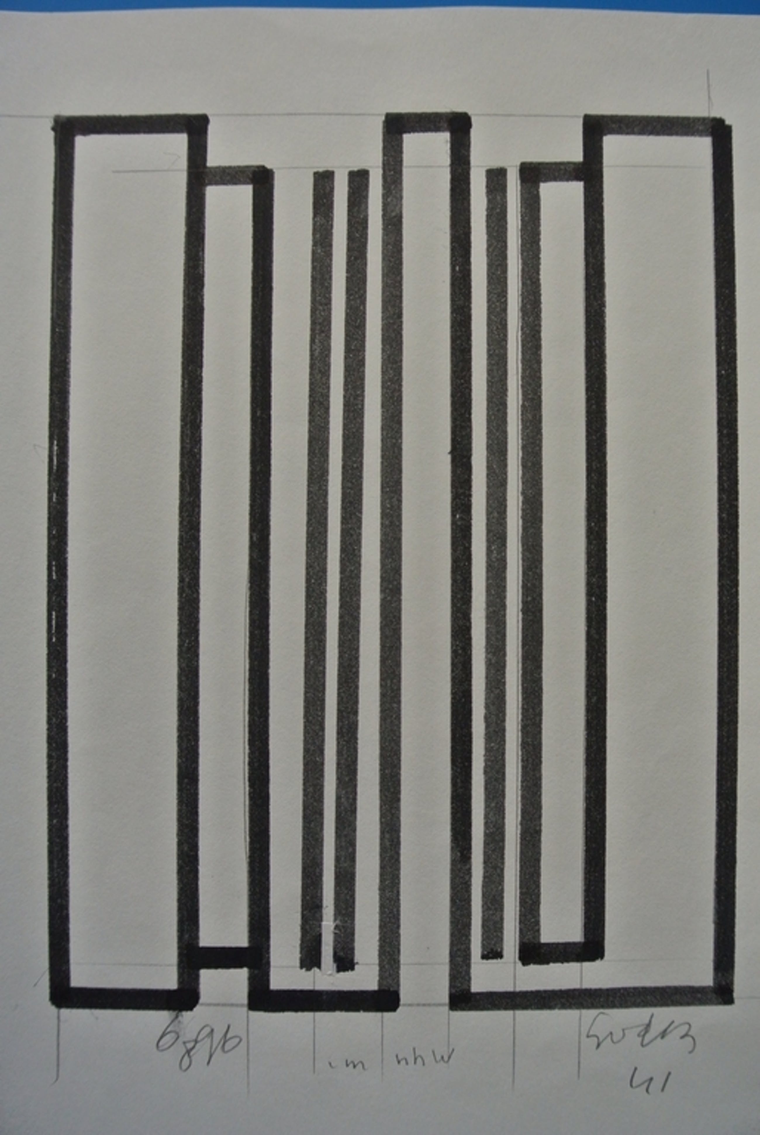 Het is maar een “platte” ontwerptekening, maar wanneer je goed kijkt zie je hoe hij op subtiele wijze er een 3D afbeelding van maakt. De losse verticale lijnen zijn een paar graden uit het lood geplaatst. Dit geeft diepte. ( In deze tekening scheelt dit nog geen millimeter ) En onder, links van het midden, heeft hij om extra diepte te krijgen een verticale basislijn een paar millimeter hoger geplaatst zodat het lijkt alsof dat hele, niet bestaande, vlak verder naar achteren staat. Dit alles valt normaal allemaal niet zo op, maar wanneer dit een groot werk geworden was zou het duidelijker zichtbaar zijn.