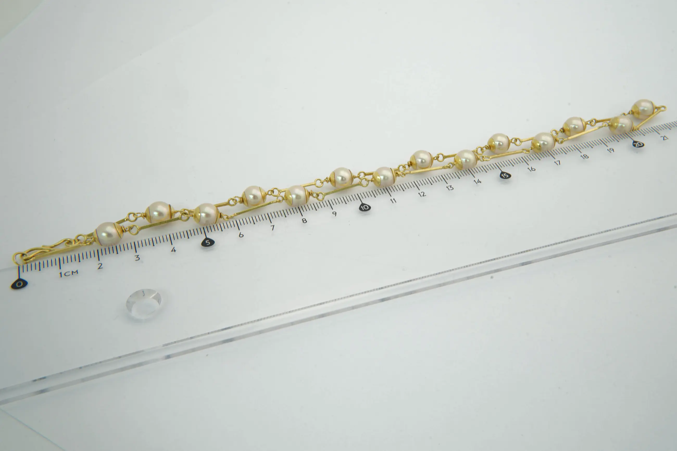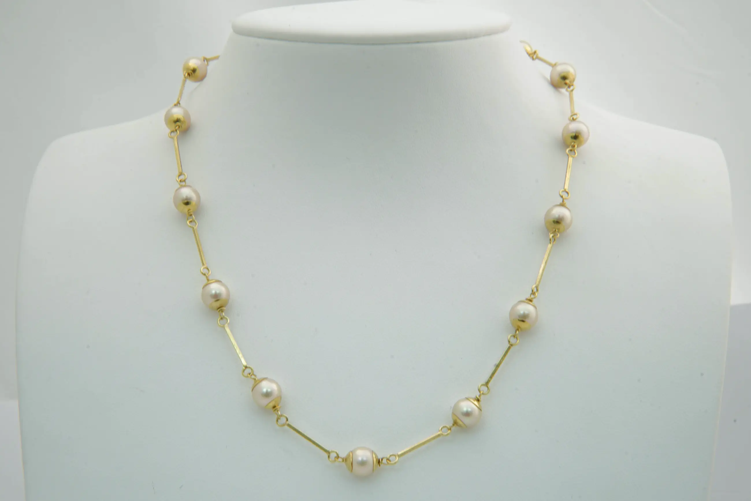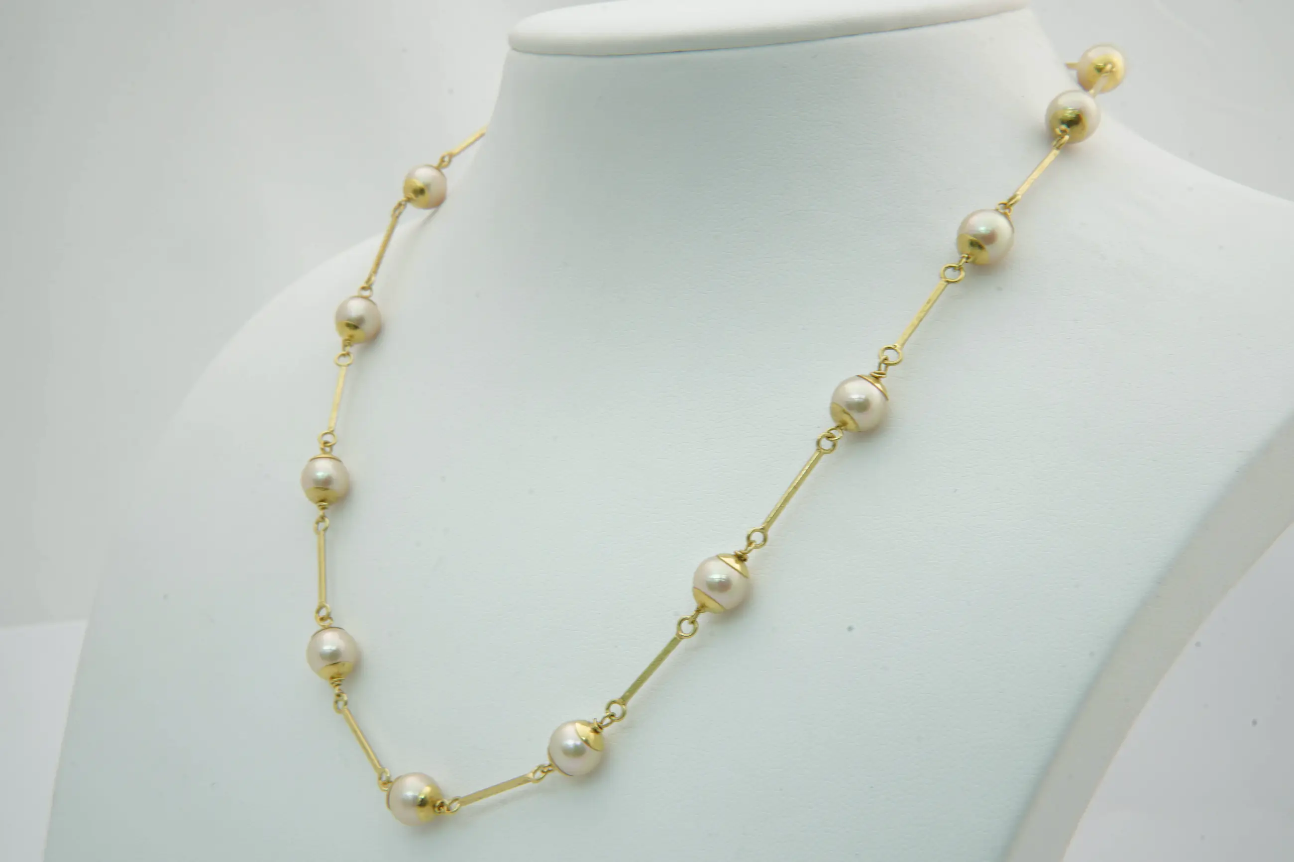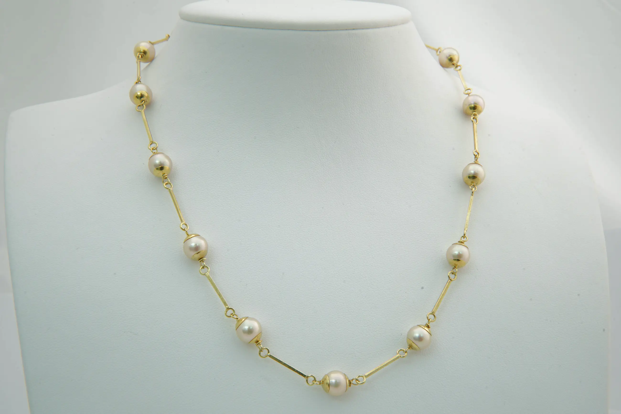 10 - Klassiek en fijn 18 karaats geel-gouden staafjes collier - 14 parels - Verkocht