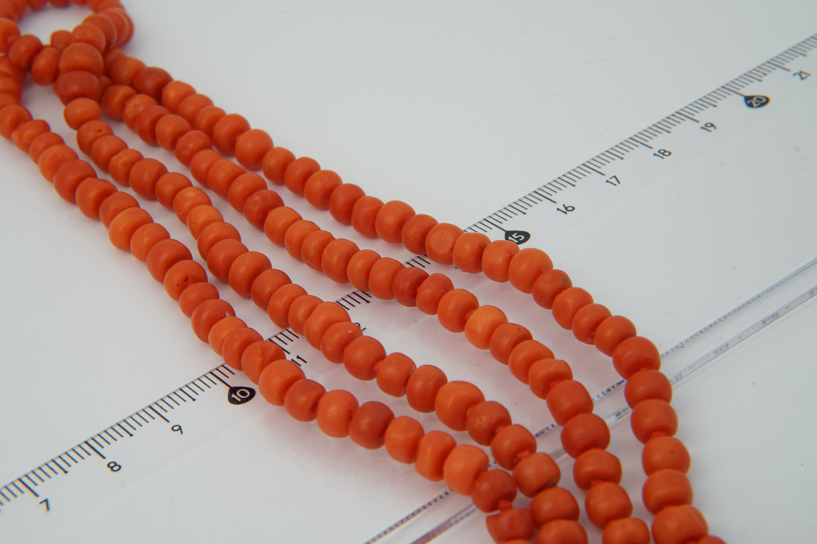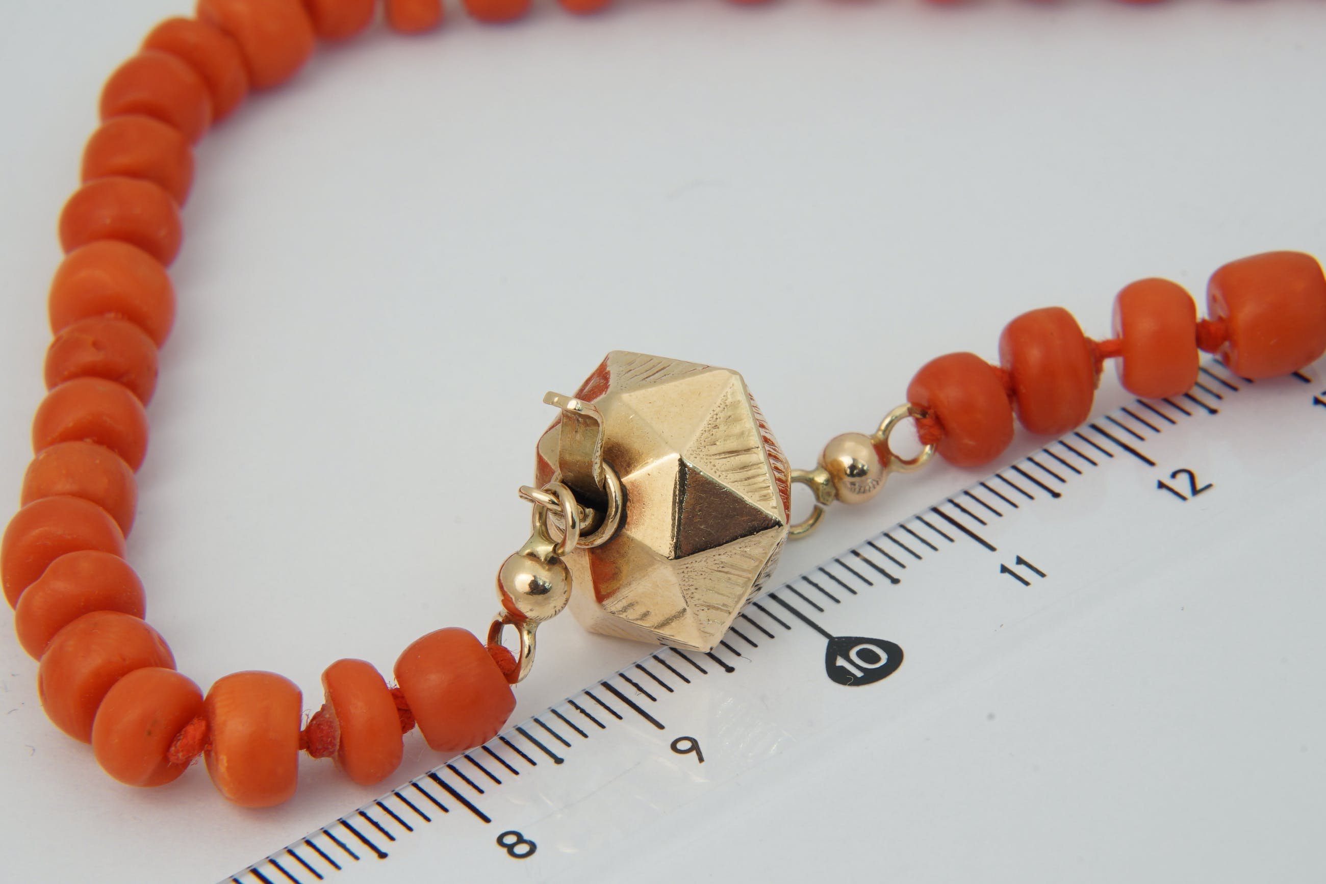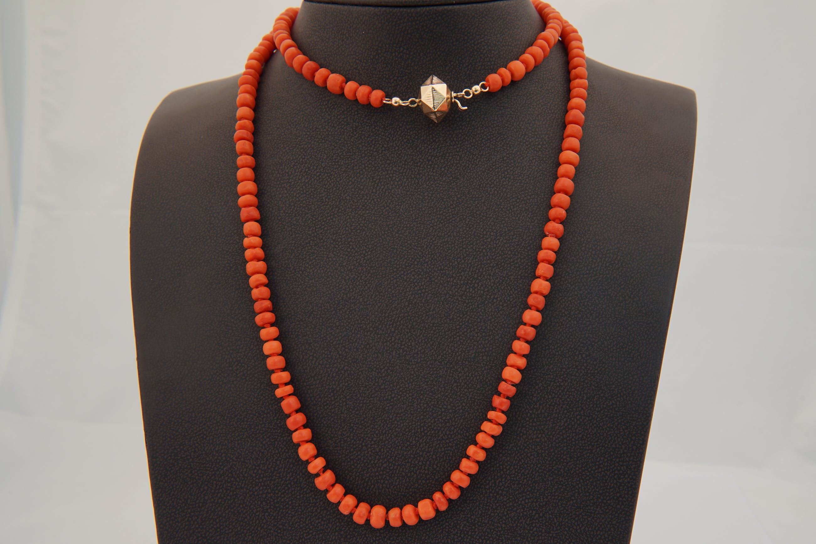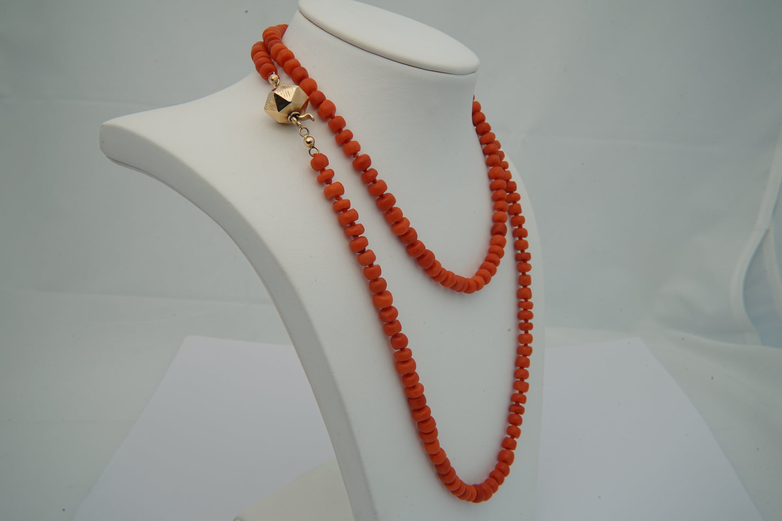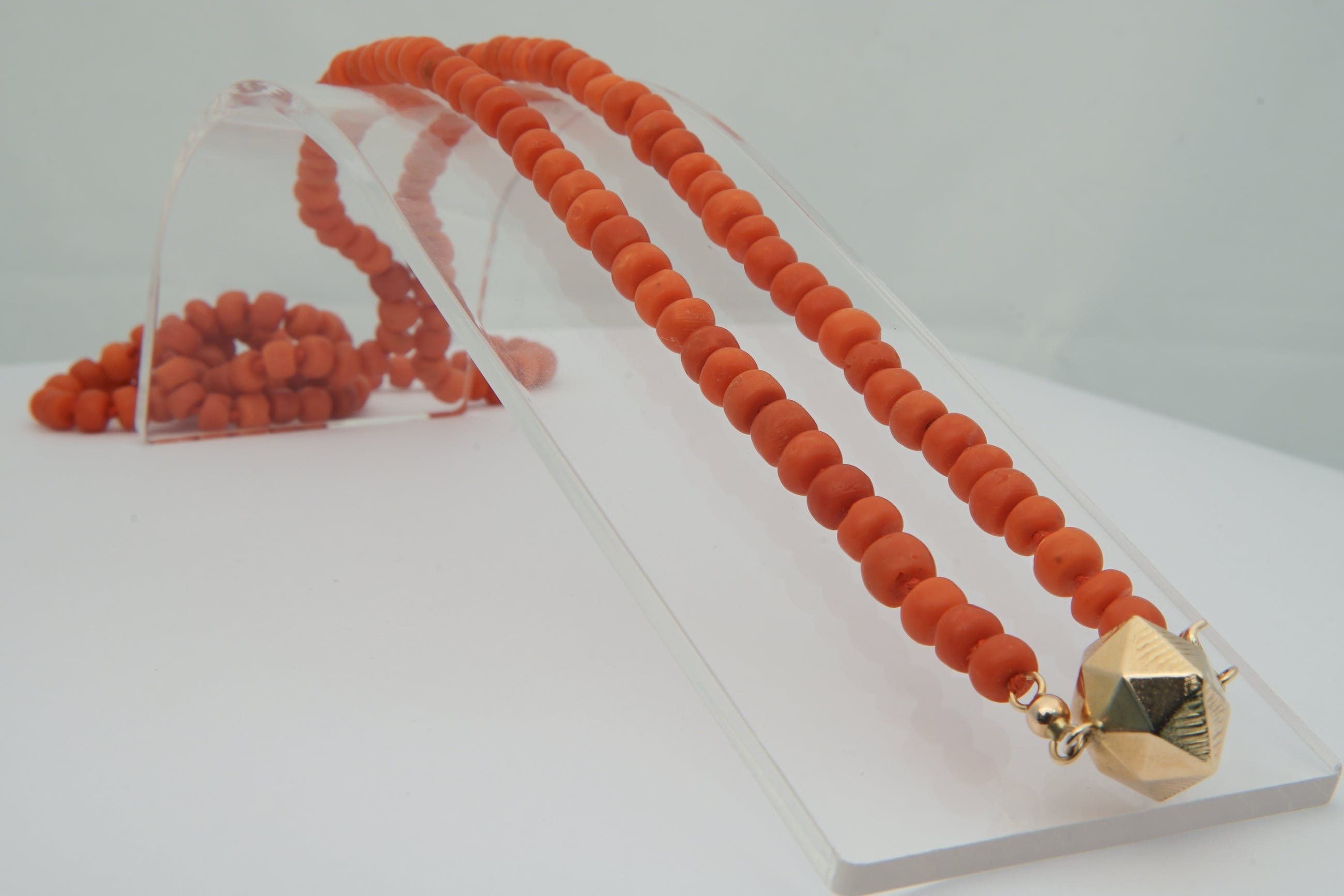 U biedt op een antiek 14 karaats geel-gouden (bak)slot met daaraan geregen oudhollands geslepen (kaasjes) Bloedkoraal.