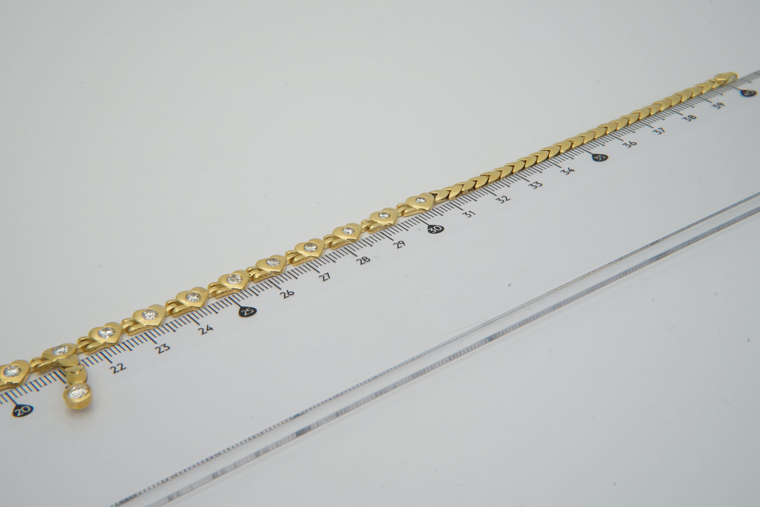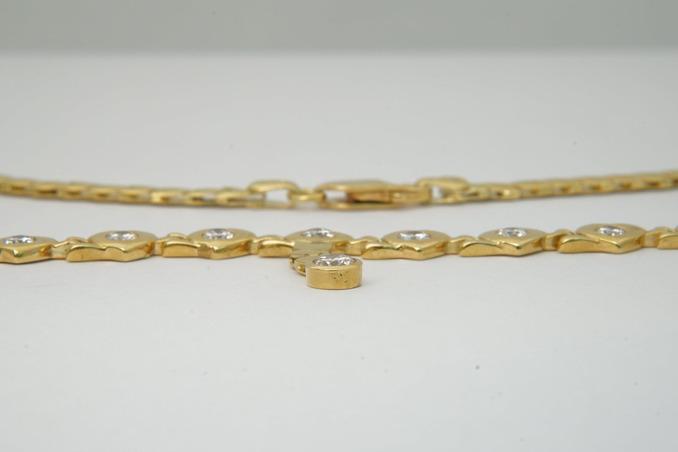 • U biedt op een klein model 14 karaats geelgouden & diamanten collier met foxtail schakel.  Het collier bevat 19 in hartjes gezette briljanten met een totaalgewicht van ca. 1.75 ct.  Centraal een aan 3 gouden schakels bevestigde briljant van ca. 0.25ct.  .