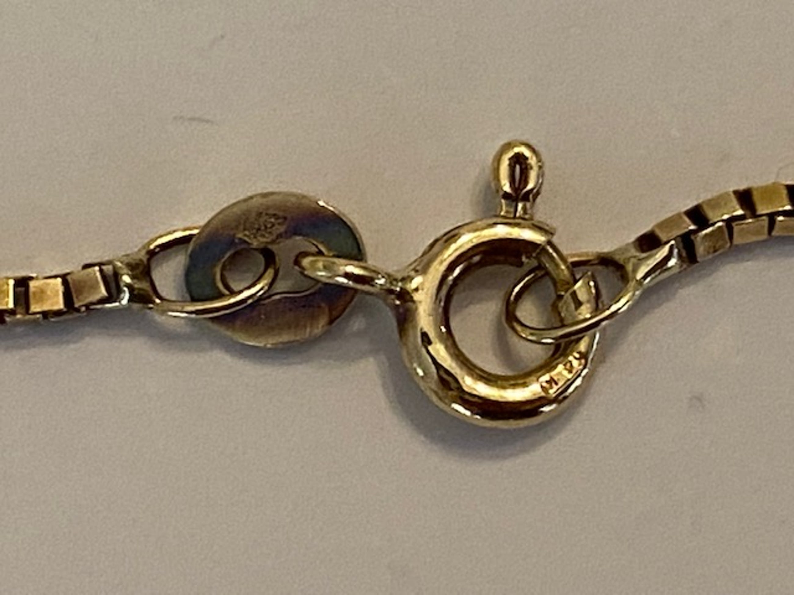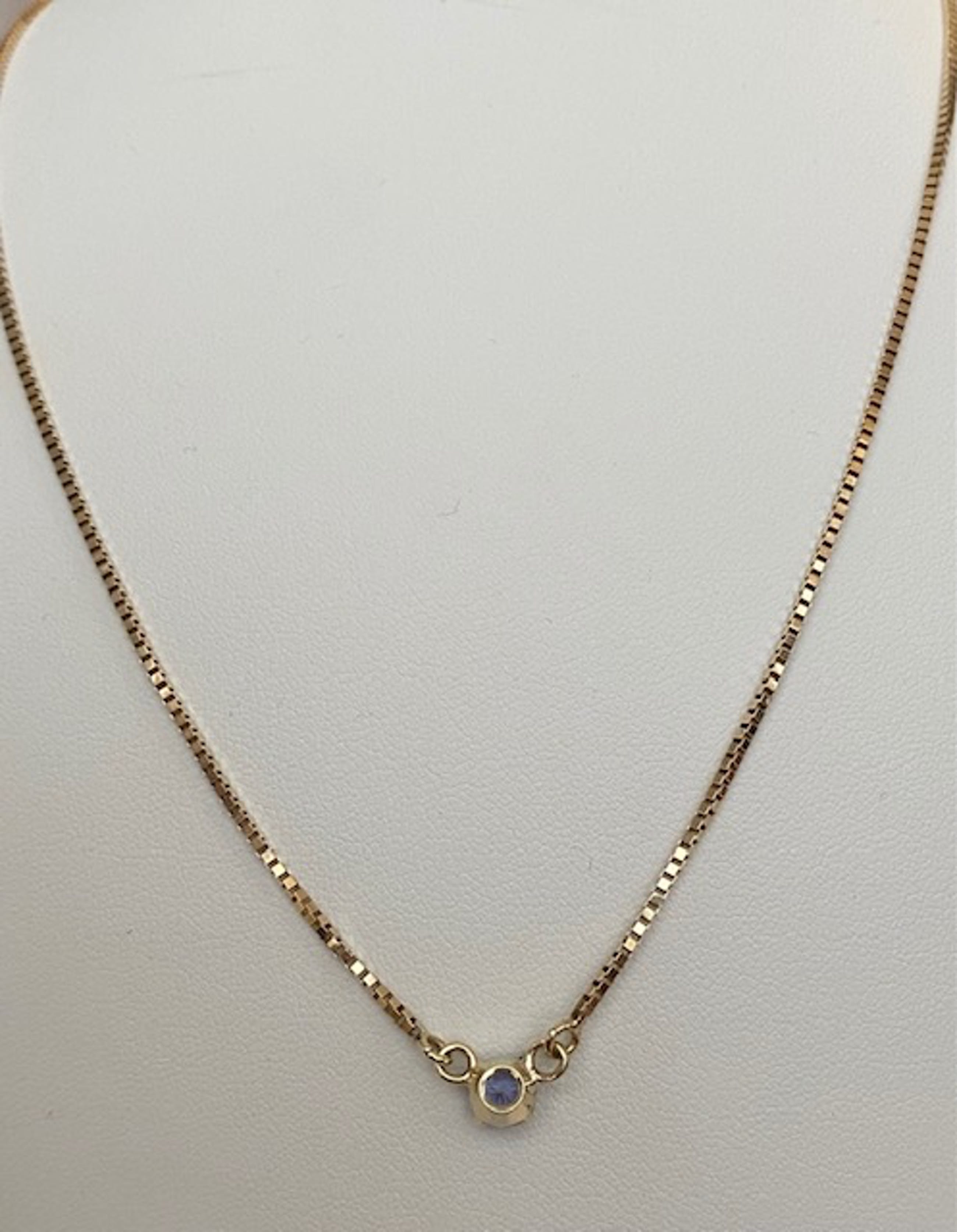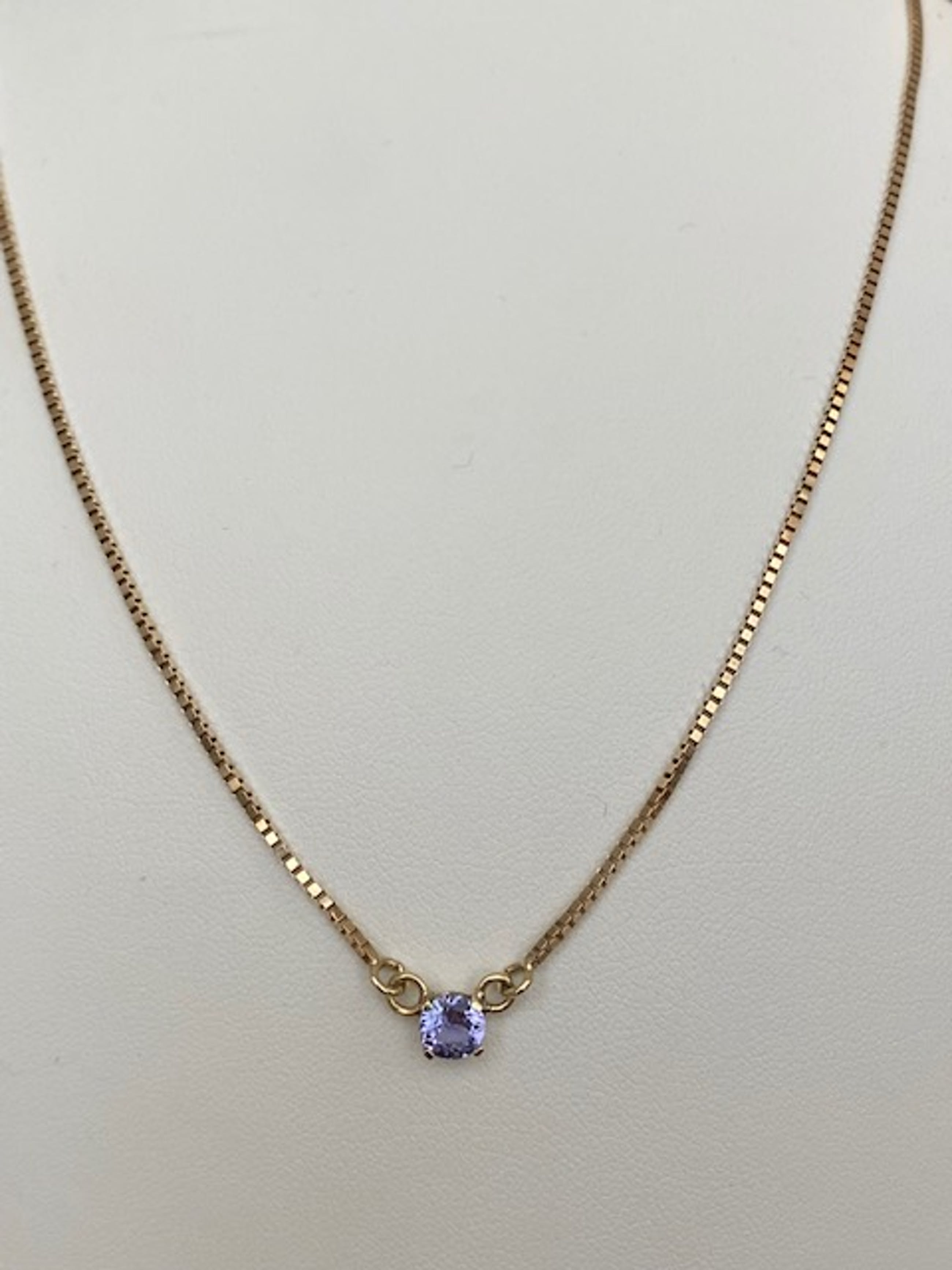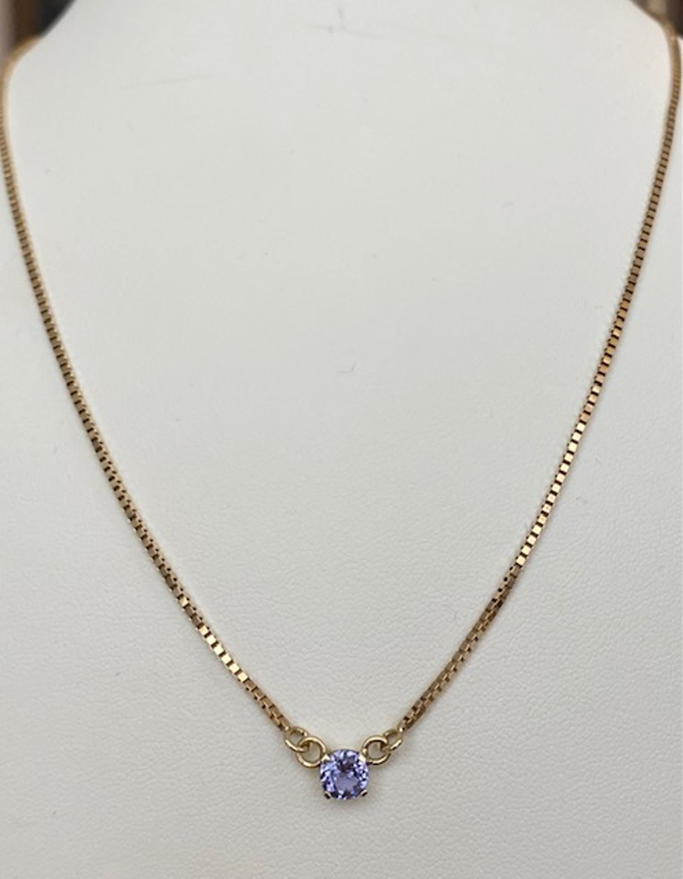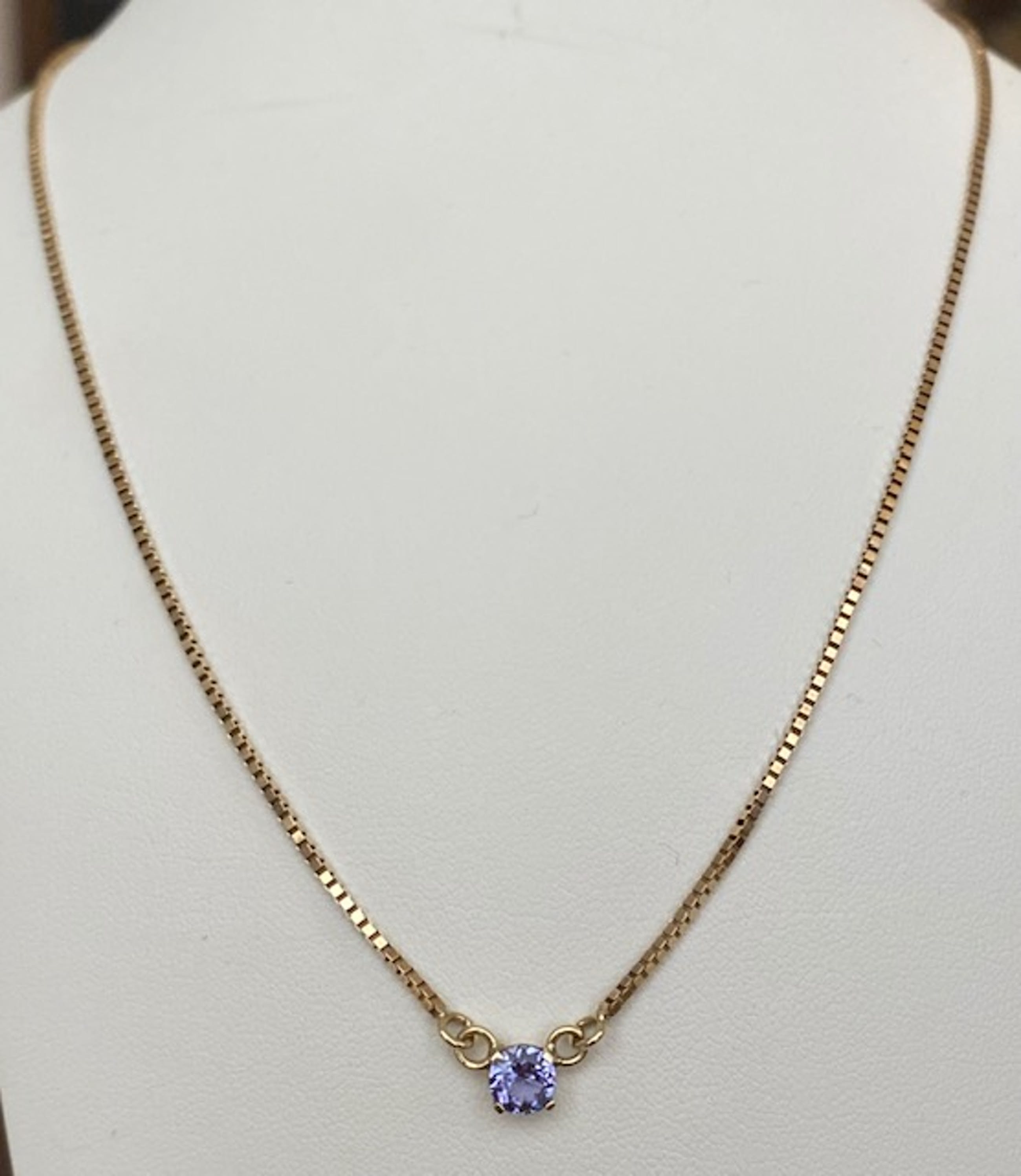 Aangeboden in goede staat 14 kt geelgouden collier met een  hanger met een rond gefaceteerde tanzaniet van ca 0.60 crt. Gehalte collier:14 KT (gekeurd). Natuurlijke tanzaniet –ca 0,60 crt. Gewicht: 4,3 gram. Lengte collier:42 cm.