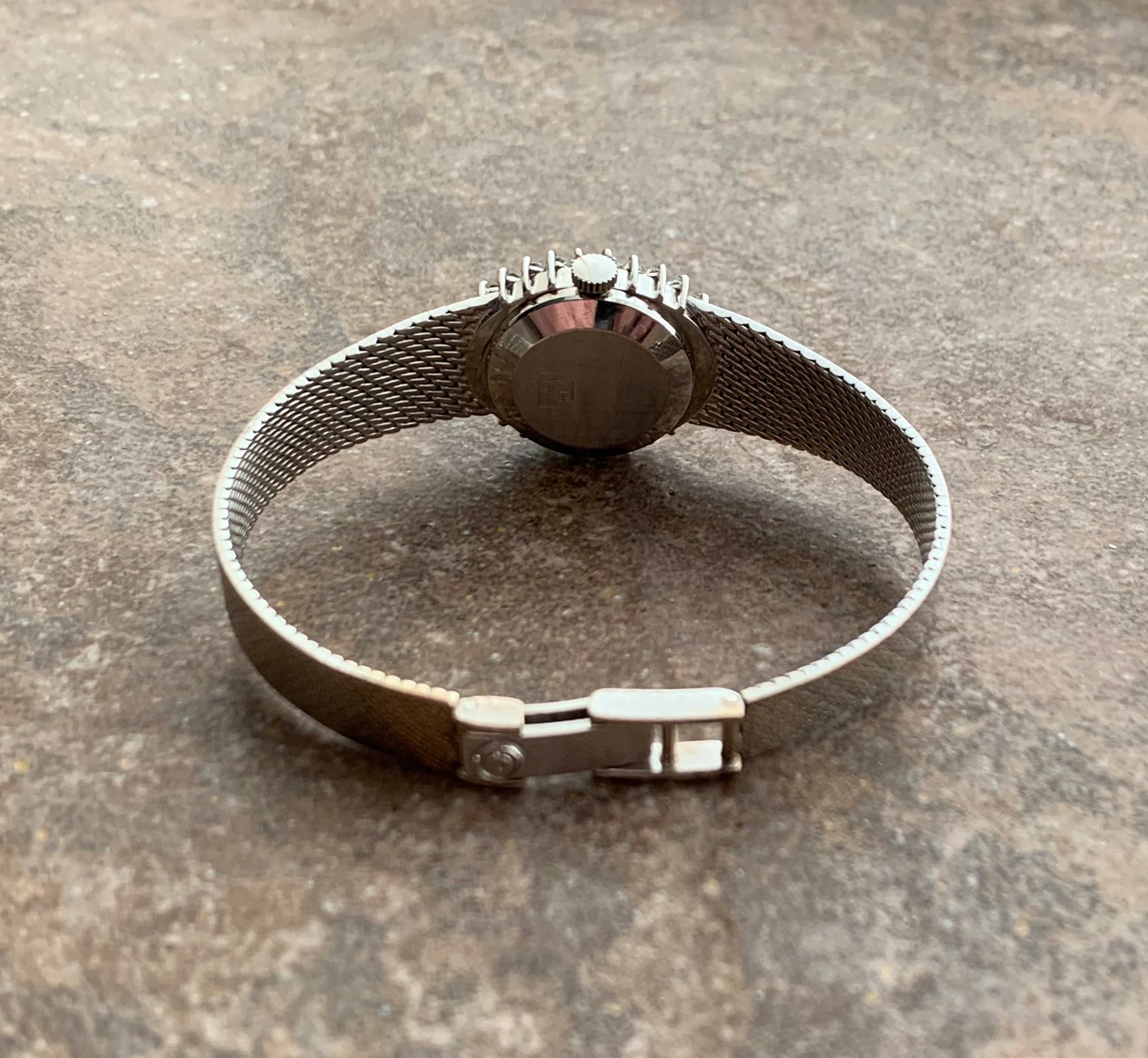 14 karaats witgouden Vintage Certina dames polshorloge aan fraaie 14 karaats gouden band. Volgezet met 28 briljant geslepen diamanten, totaal ca. 0,80ct, kleur F-G, SI. Lengte van dit sieraad is 17cm, breedte horlogeband 8mm tot 12mm, doorsnee kast inclusief kroon 23mm, gewicht 30 gram.