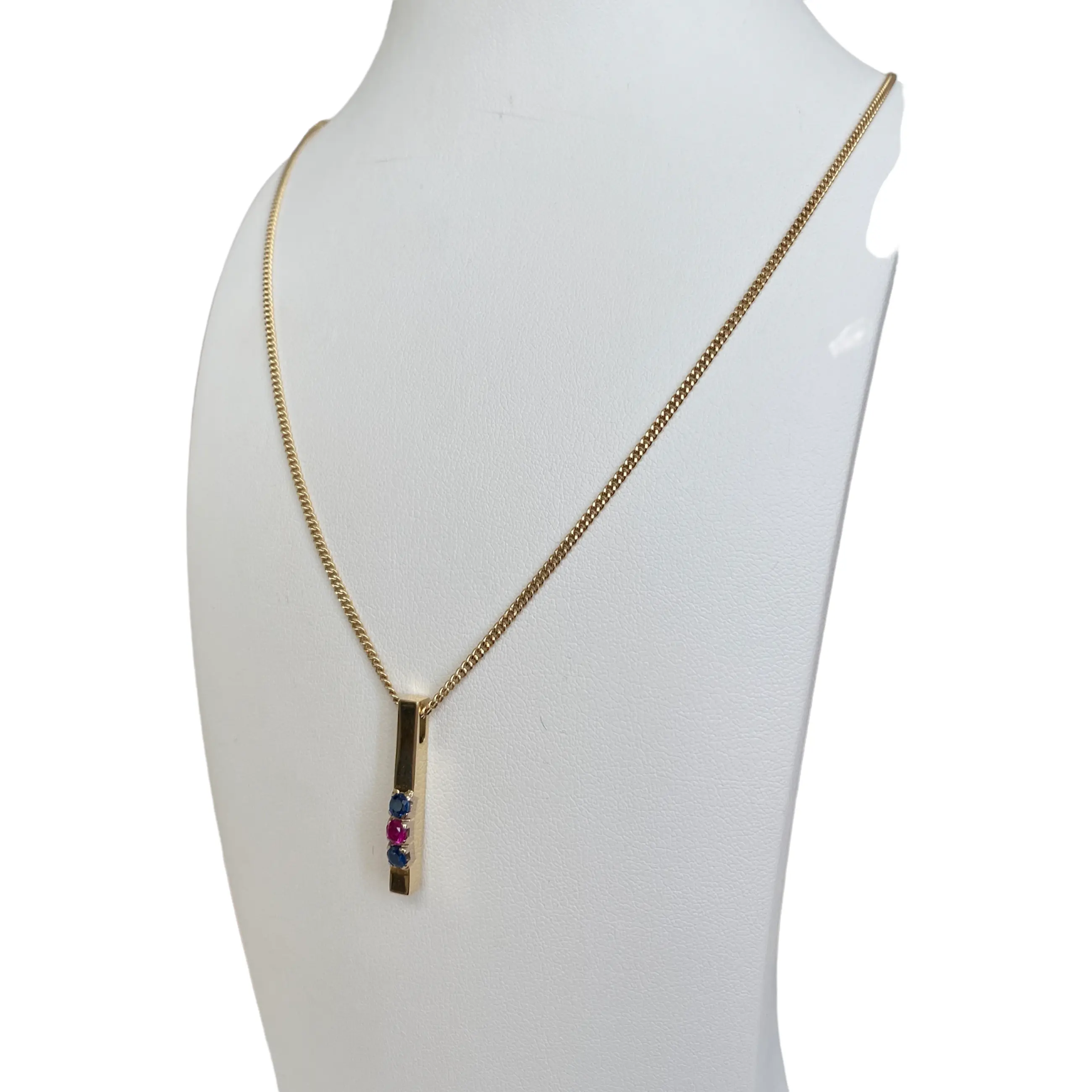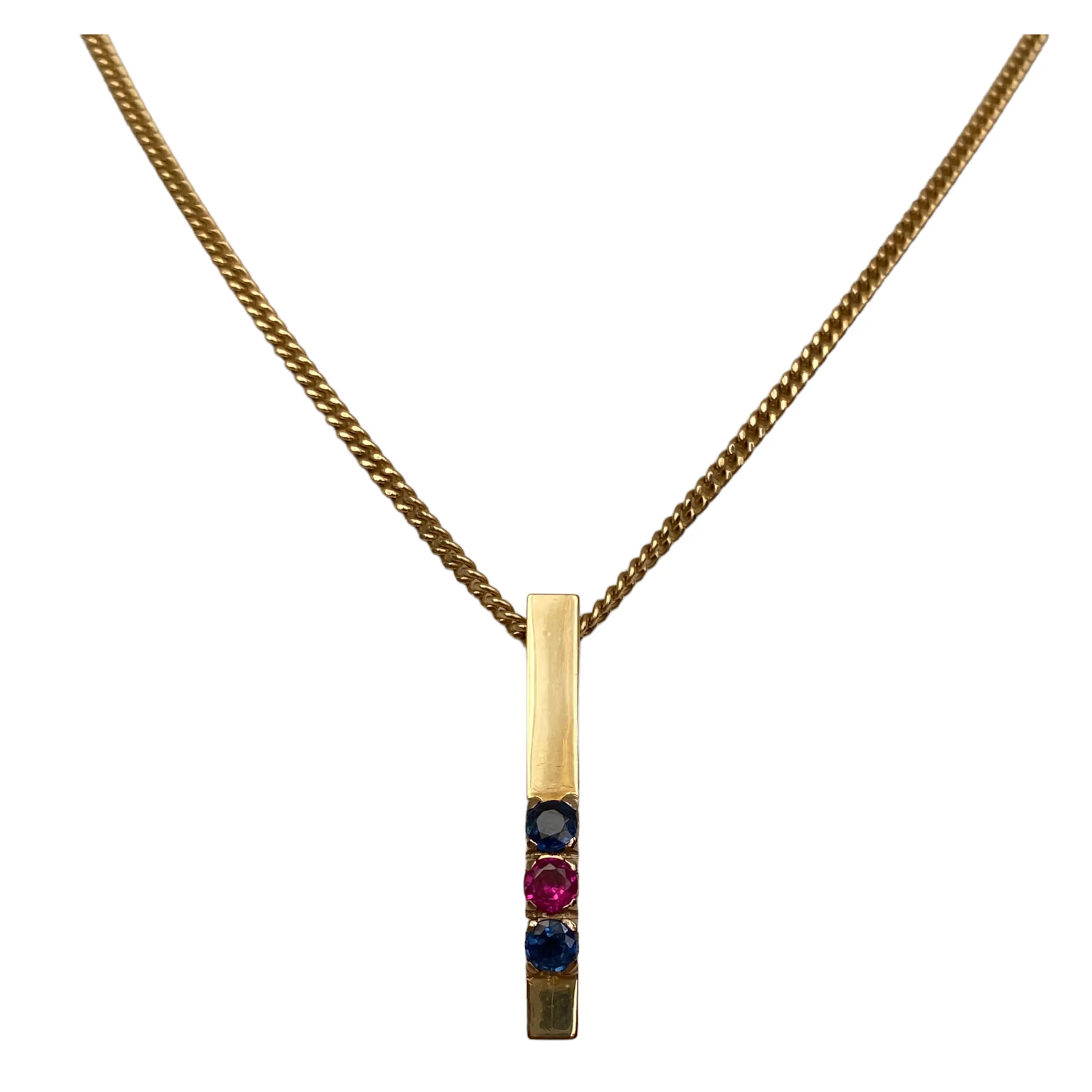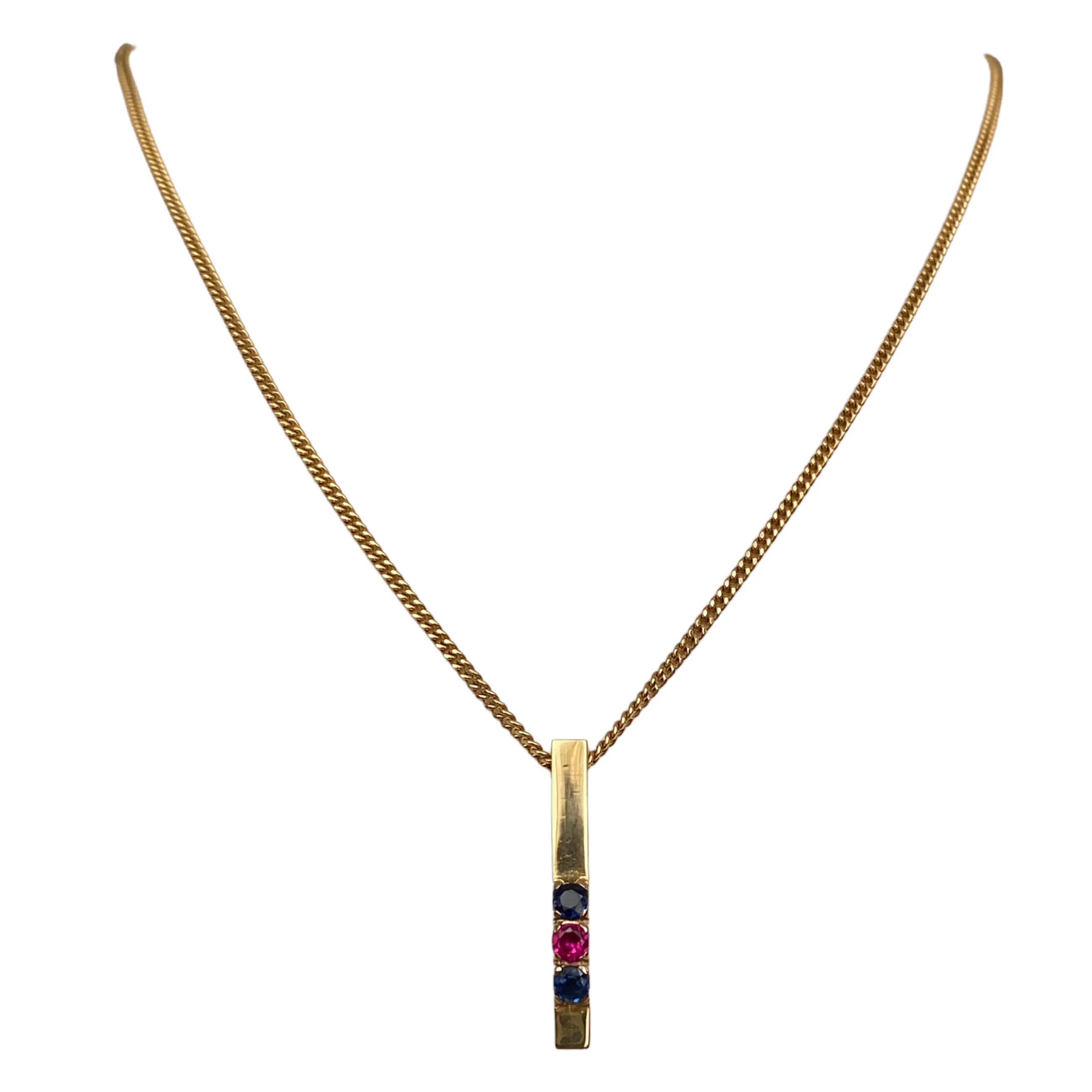 Geelgouden collier met hanger zijn gemaakt van 14 Kt goud. De hanger is bezet met twee saffier ca 0.22 crt samen en een robijn ca 0.10 crt. De sieraad bevindt zich in zeer goede staat.