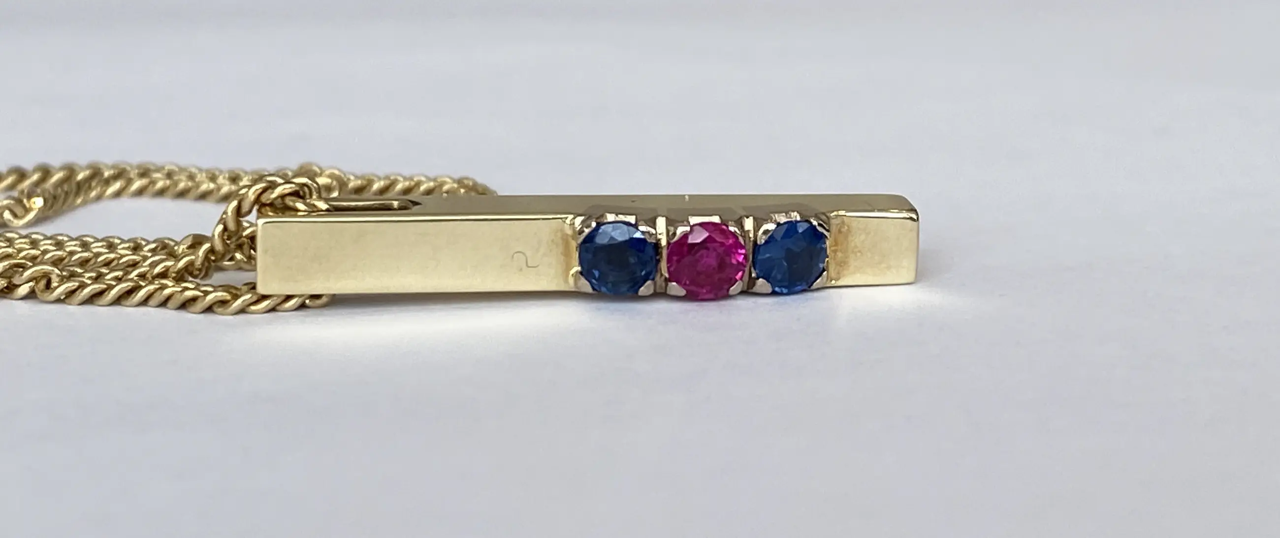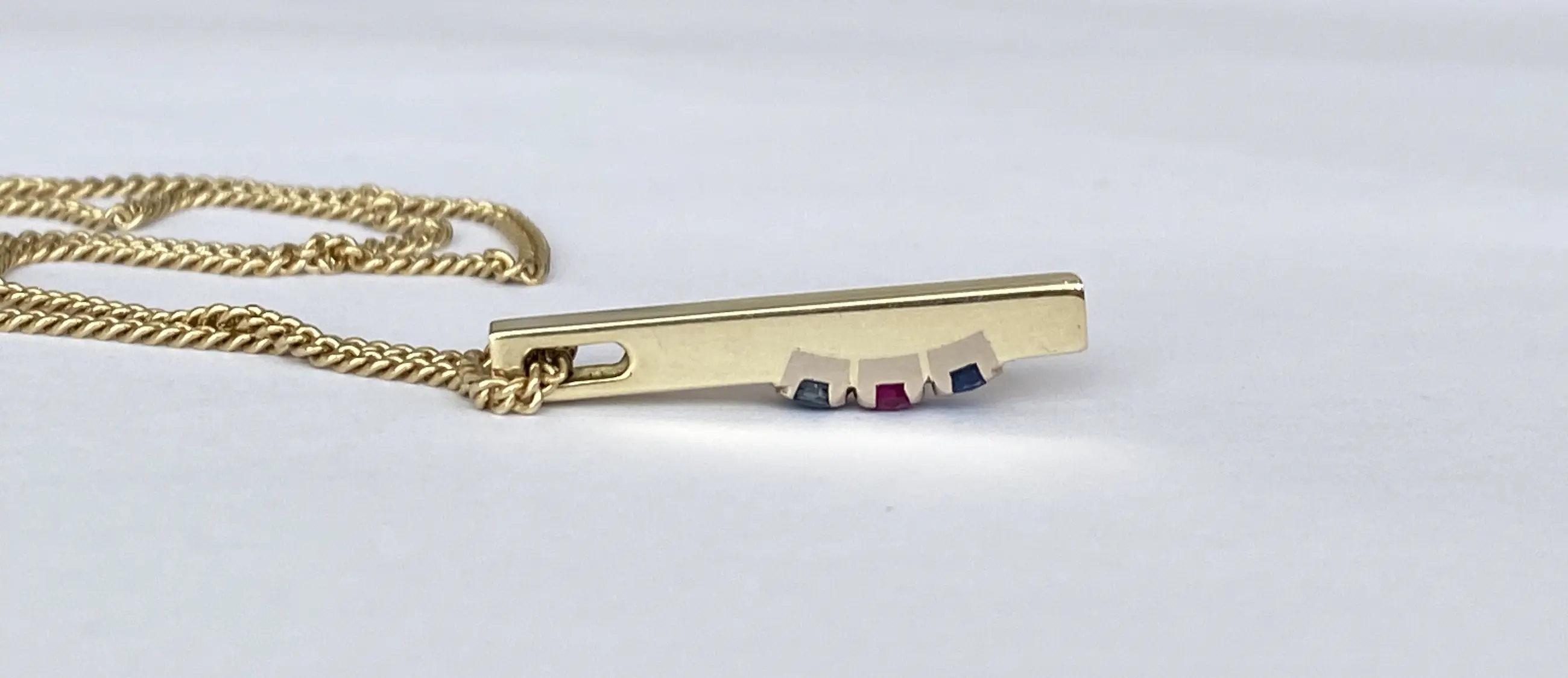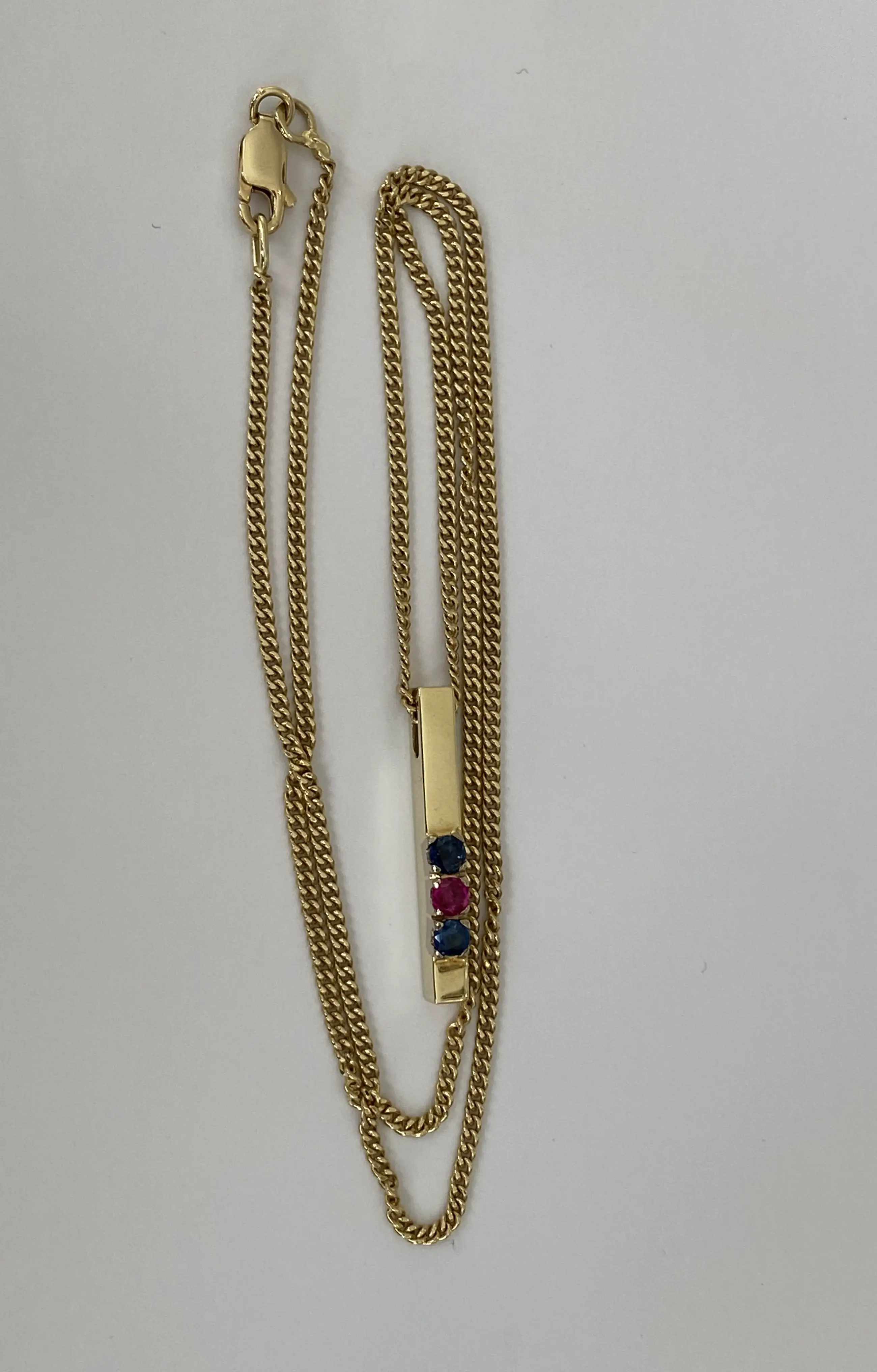 Geelgouden collier met hanger zijn gemaakt van 14 Kt goud. De hanger is bezet met twee saffier ca 0.22 crt samen en een robijn ca 0.10 crt. De sieraad bevindt zich in zeer goede staat.