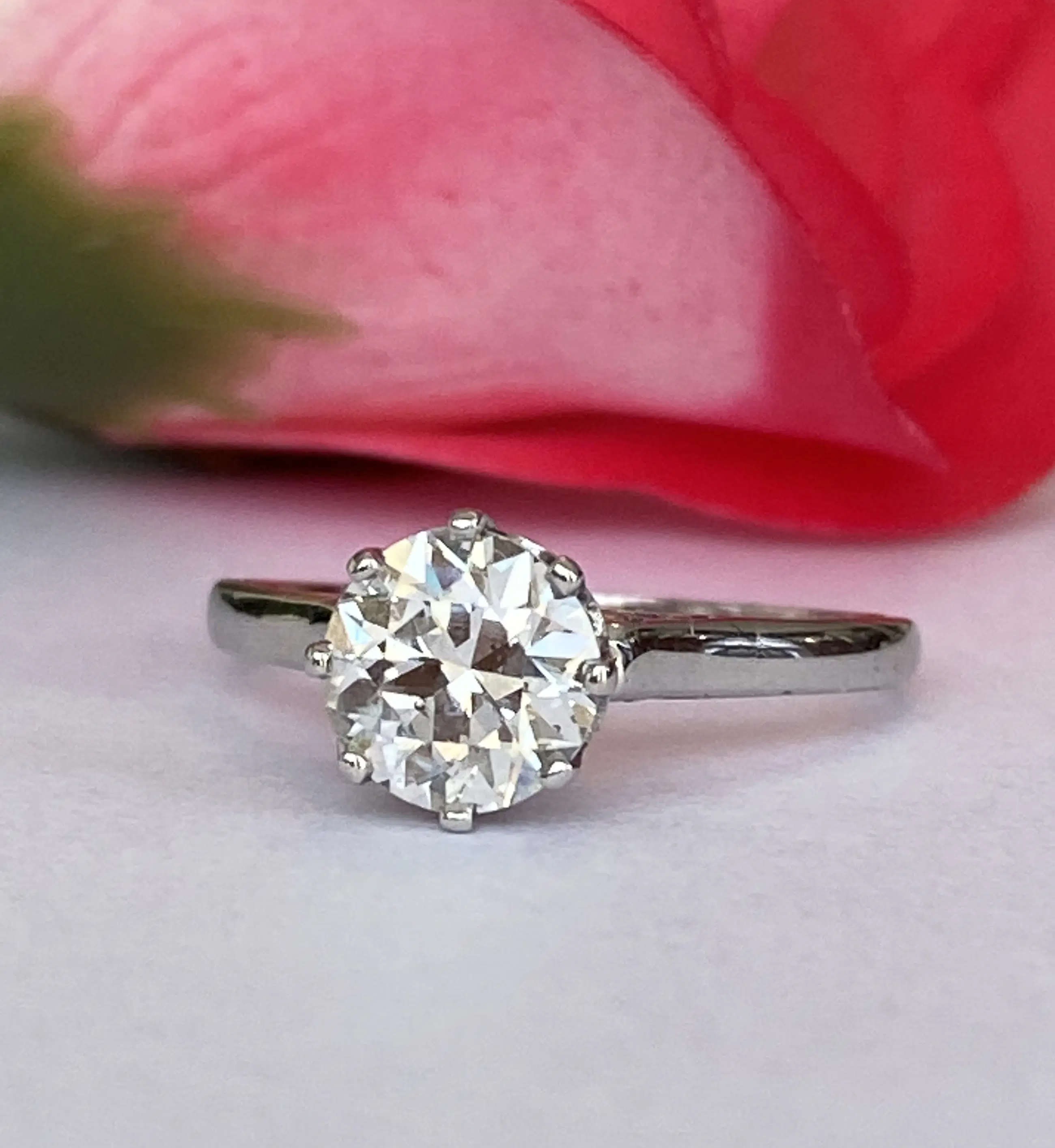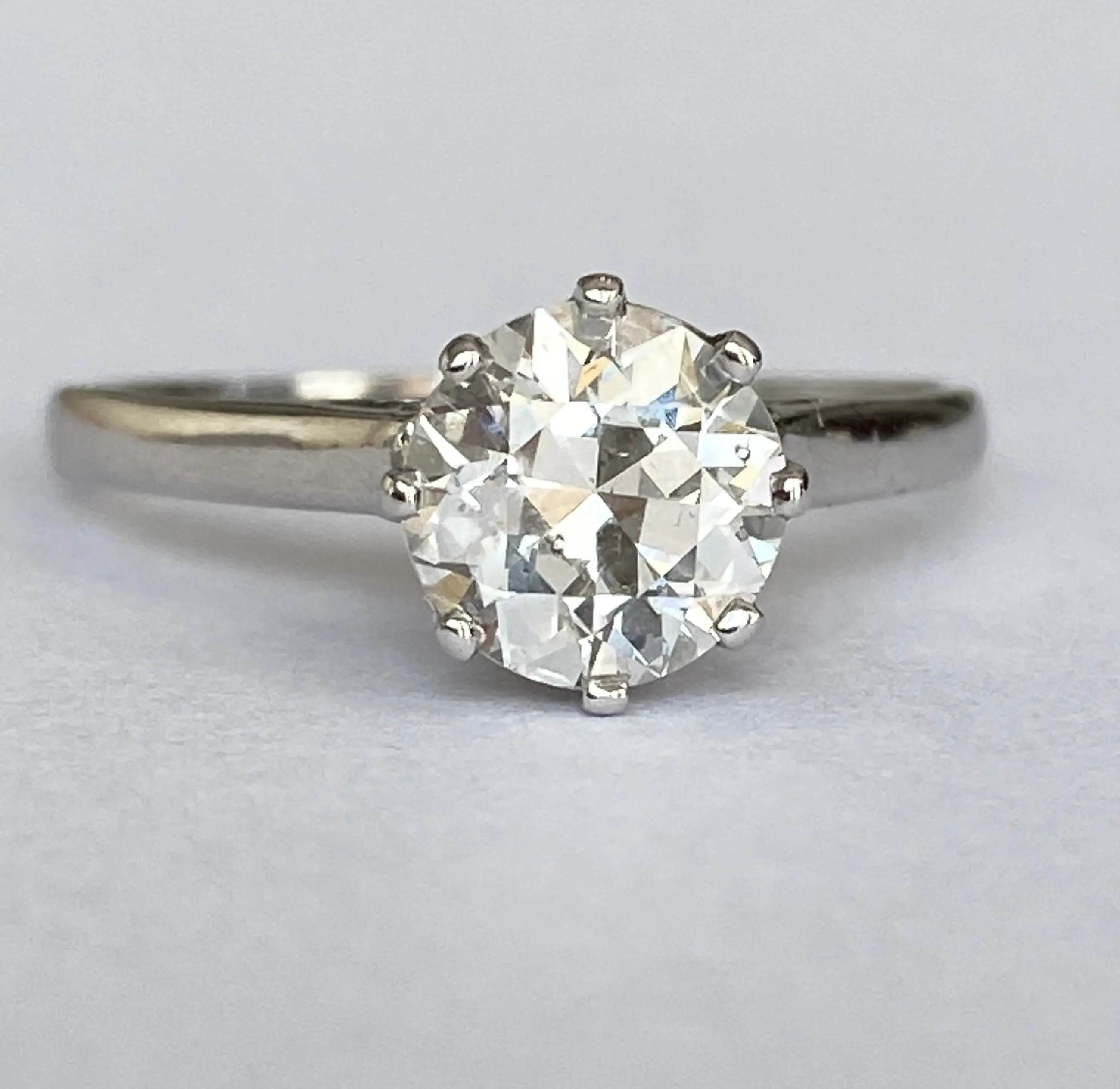 De diamant is gezet in 14-karaats witgoud en rust in een zetting met acht klauwen, wat de vintage charme versterkt.