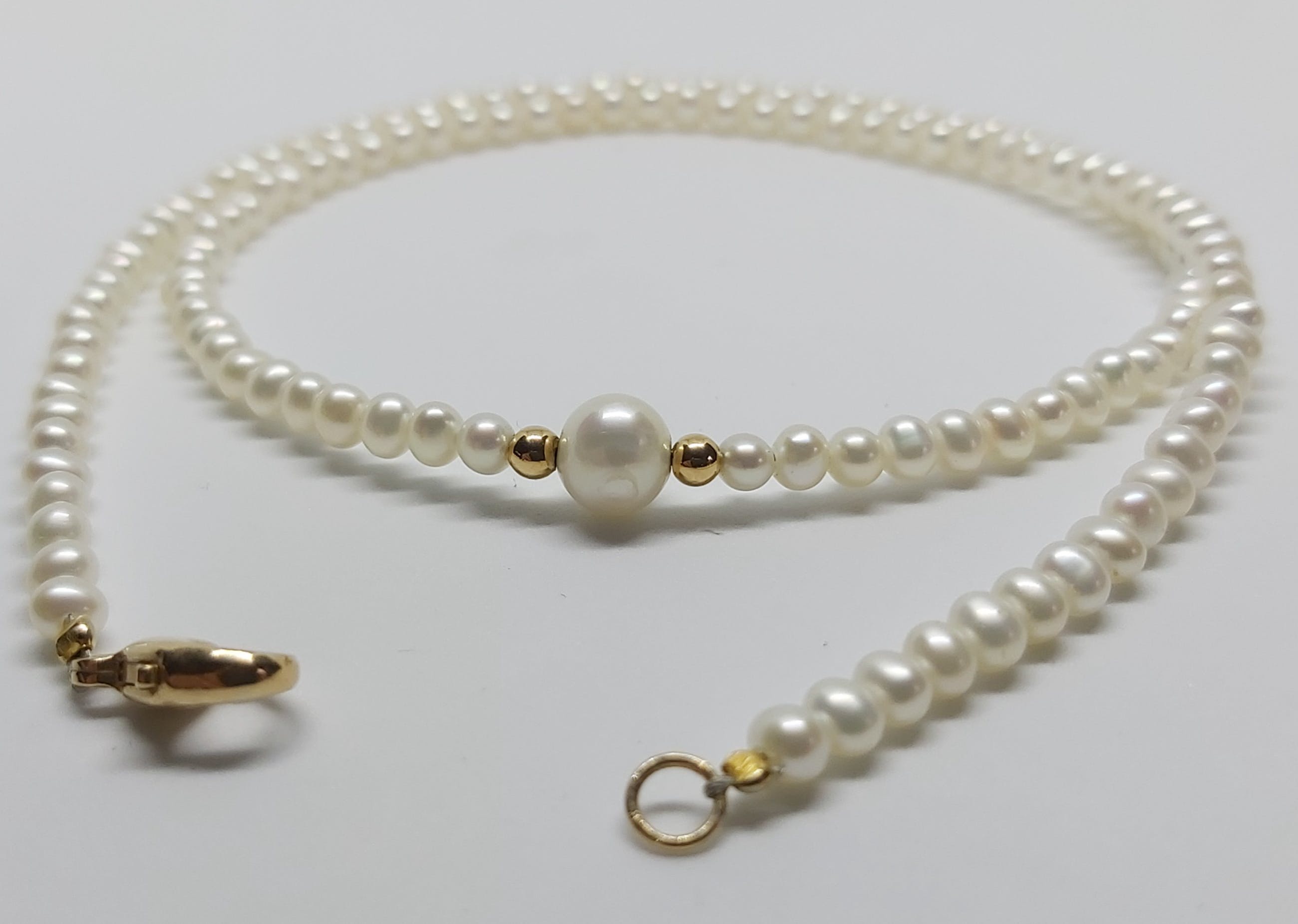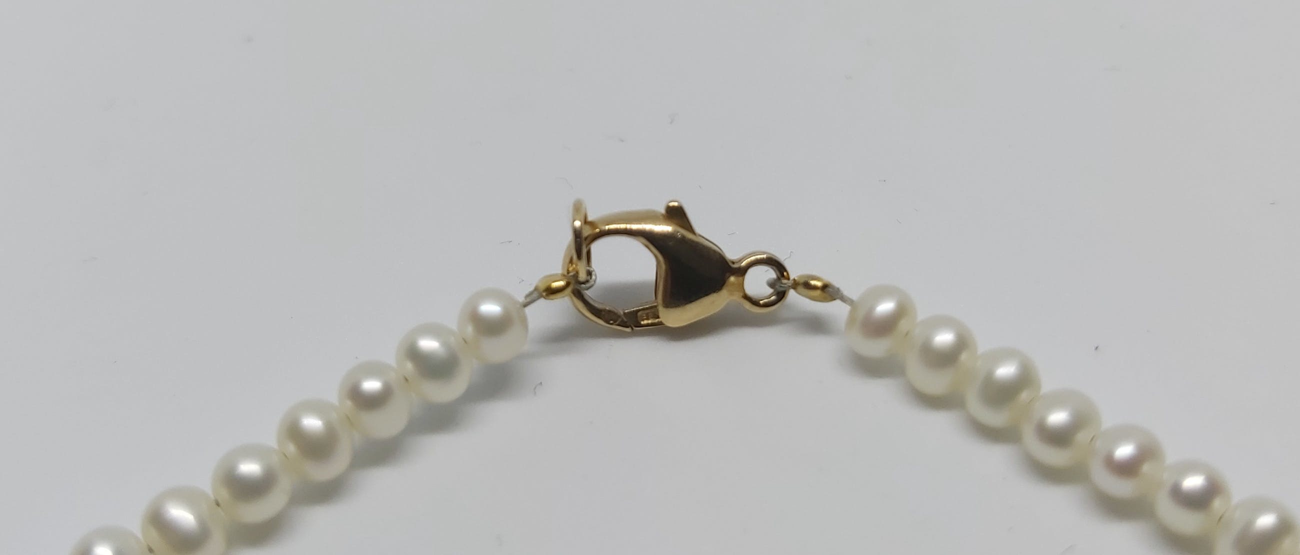 Moderne zoetwaterparel collier van 45,2 cm lang geregen aan een stalen draadje met een 14 kt slotje.
