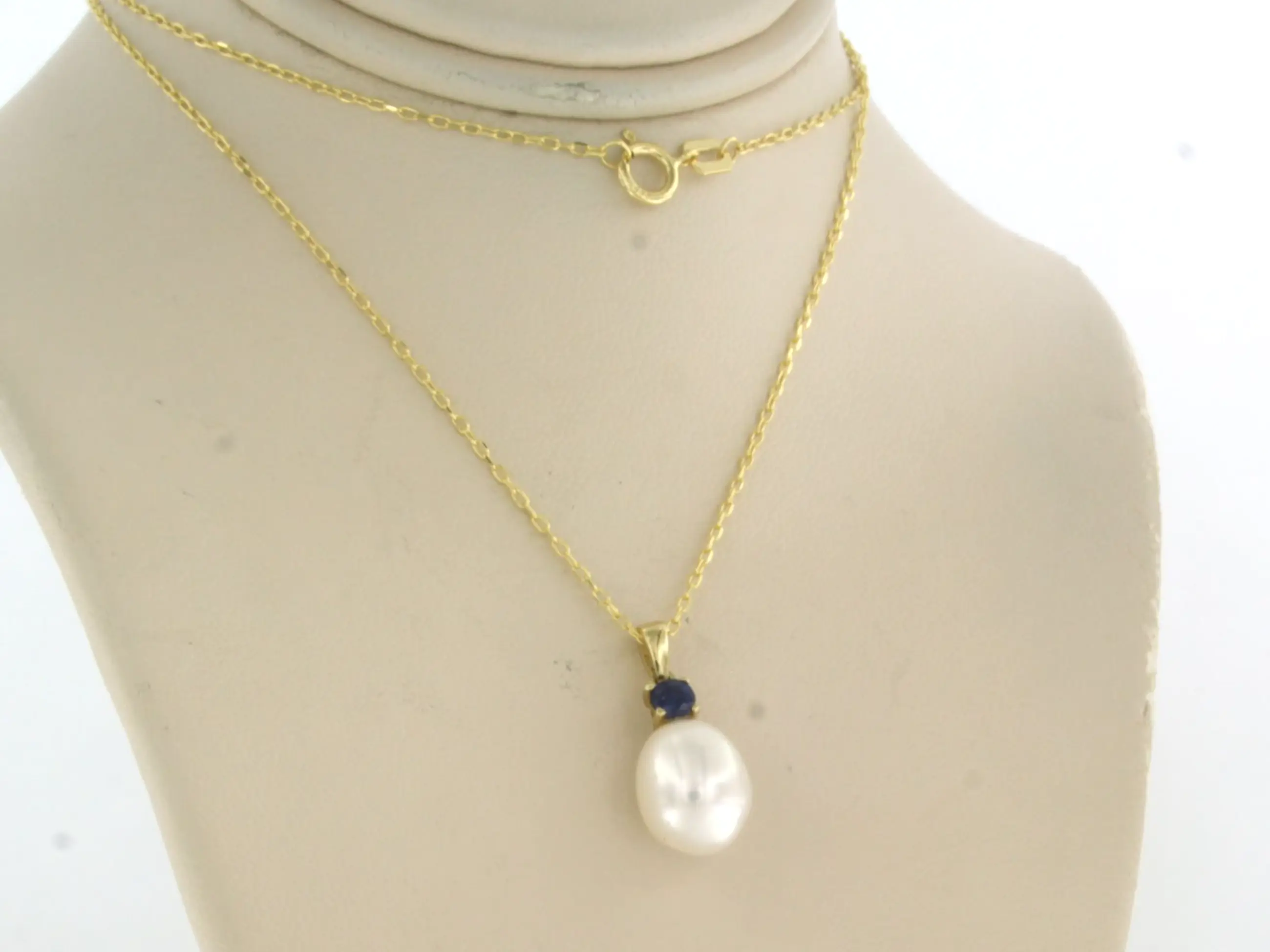 14k geel gouden collier met een hanger bezet met saffier tot. 0,18ct en een parel - 45 cm lang