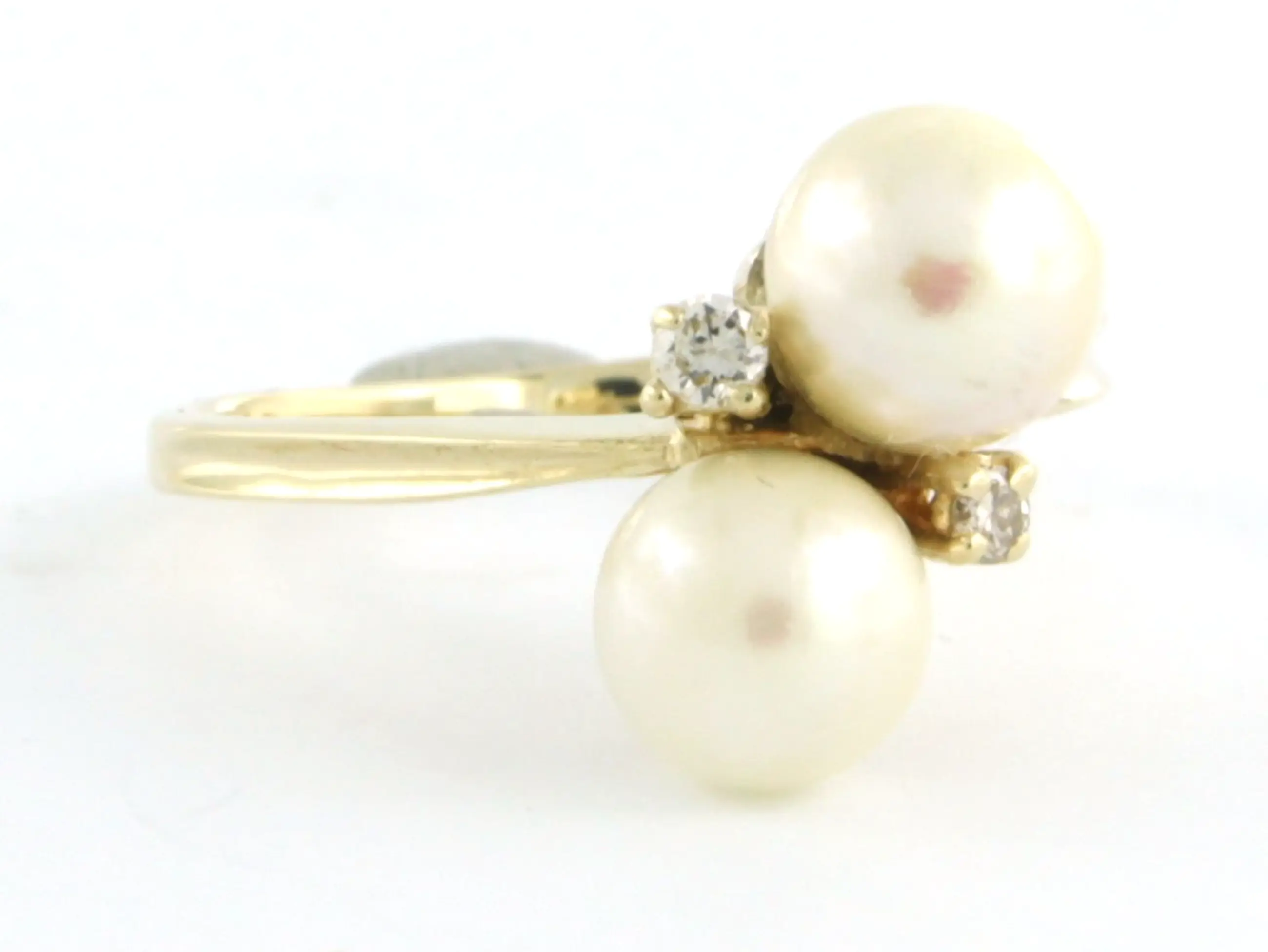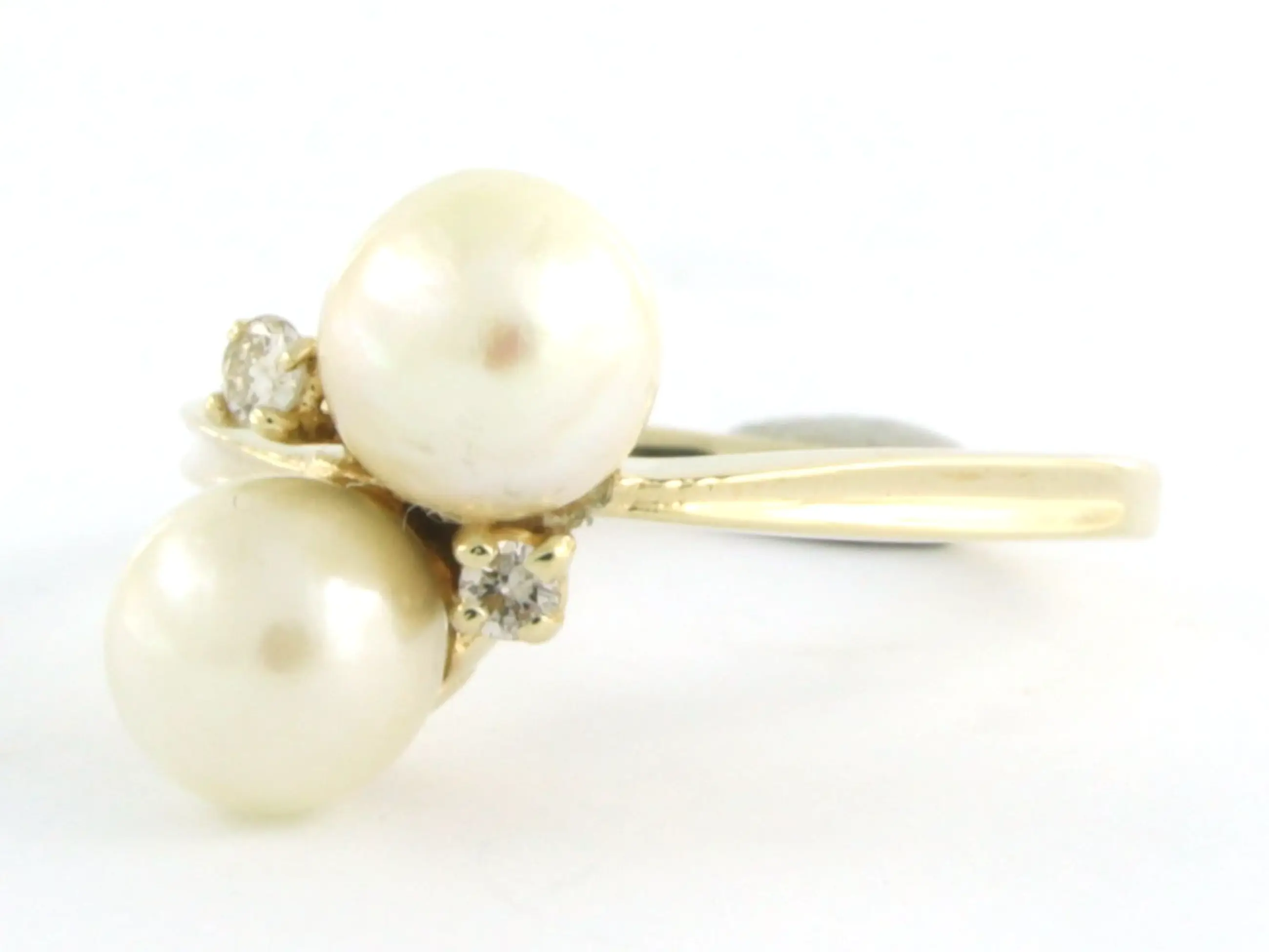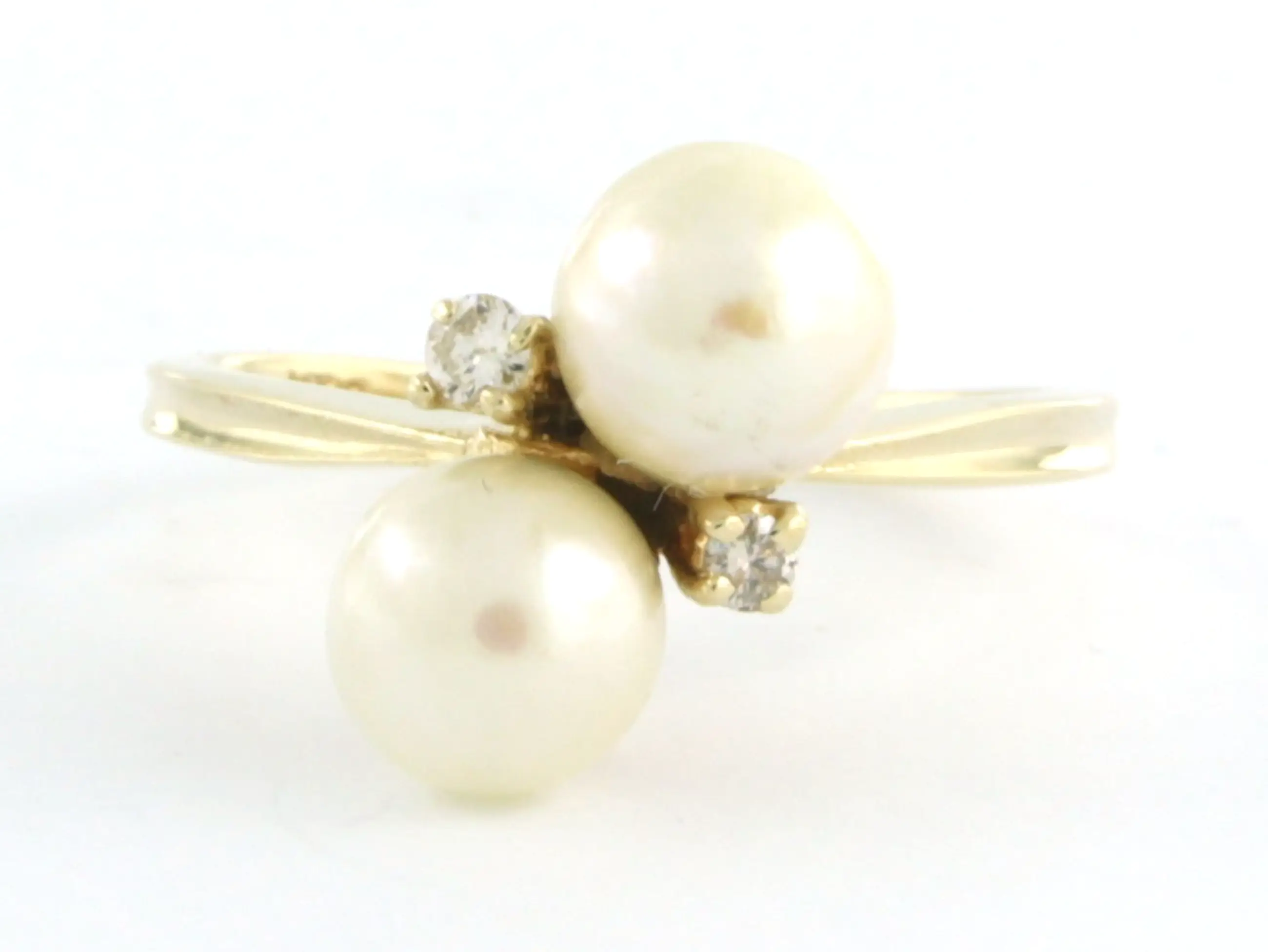 14k geel gouden slag ring met parel en briljant geslepen diamant tot. 0.10ct - F/G - VS/SI - ringmaat 17.5(55)