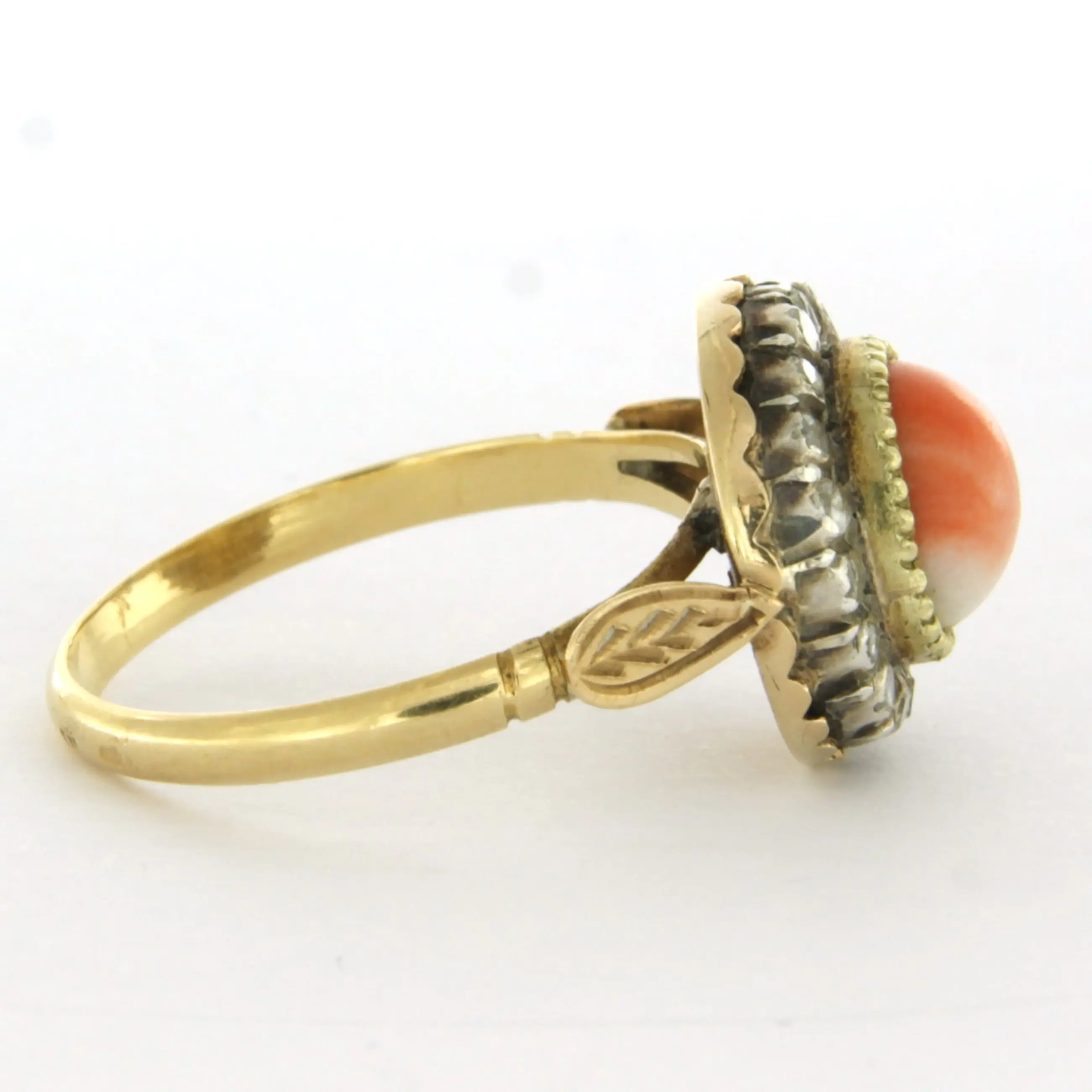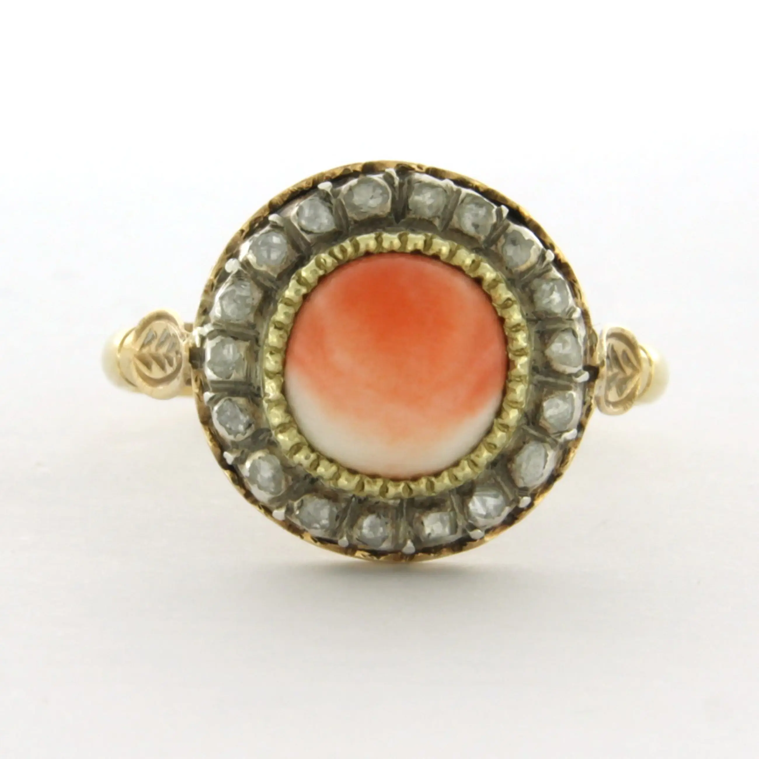 14k goud met zilver ring bezet met koraal en erom heen roos geslepen diamant tot. 0.15ct – G/H - SI - ringmaat 18.5(58)