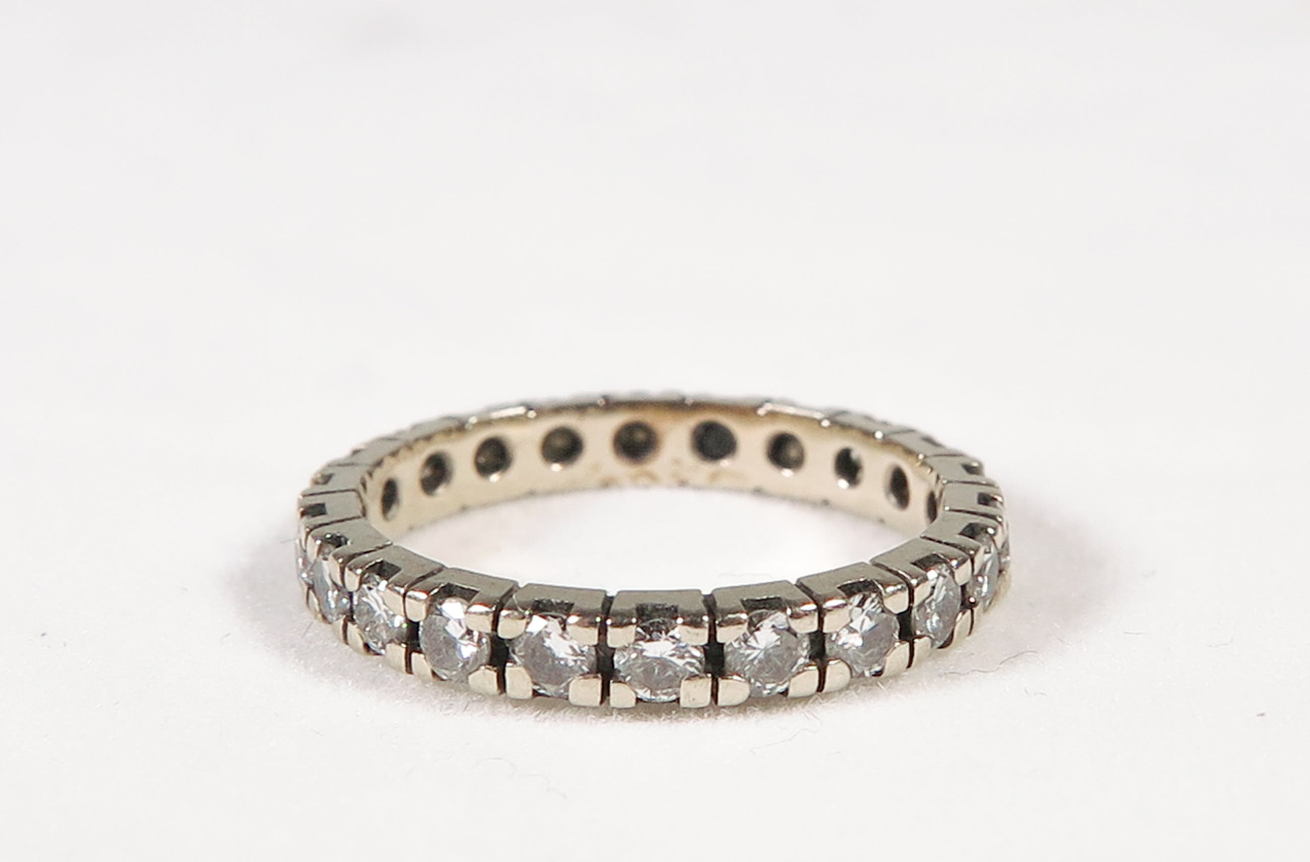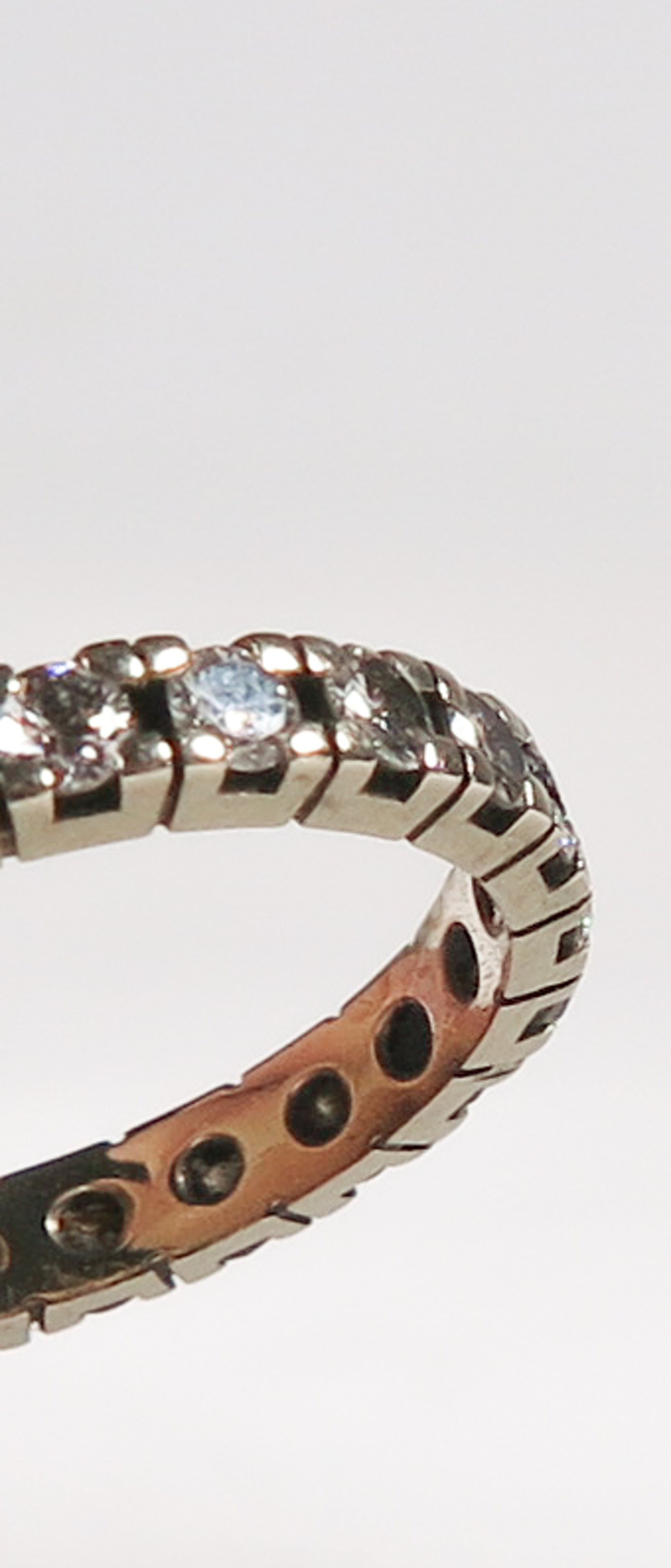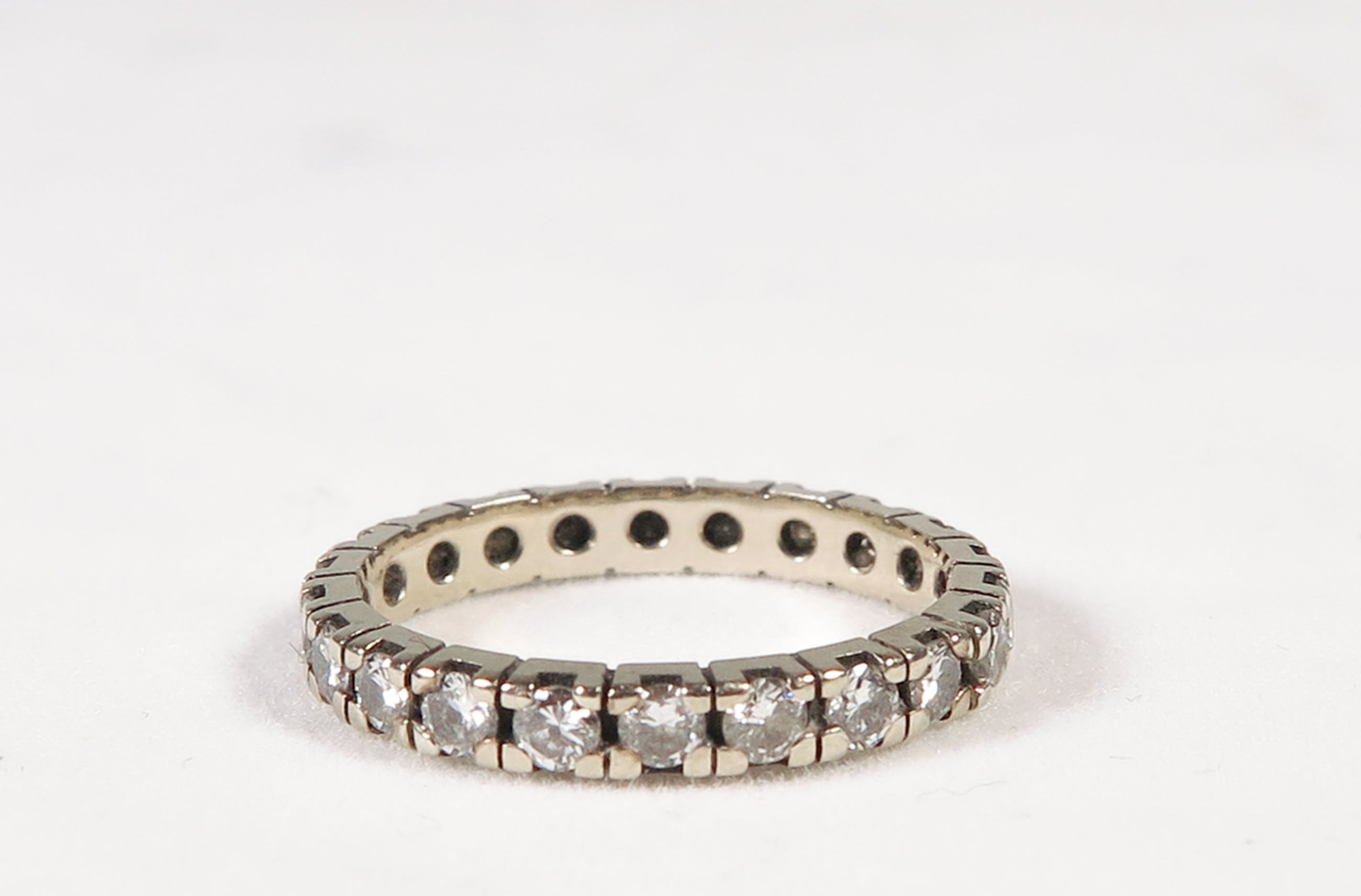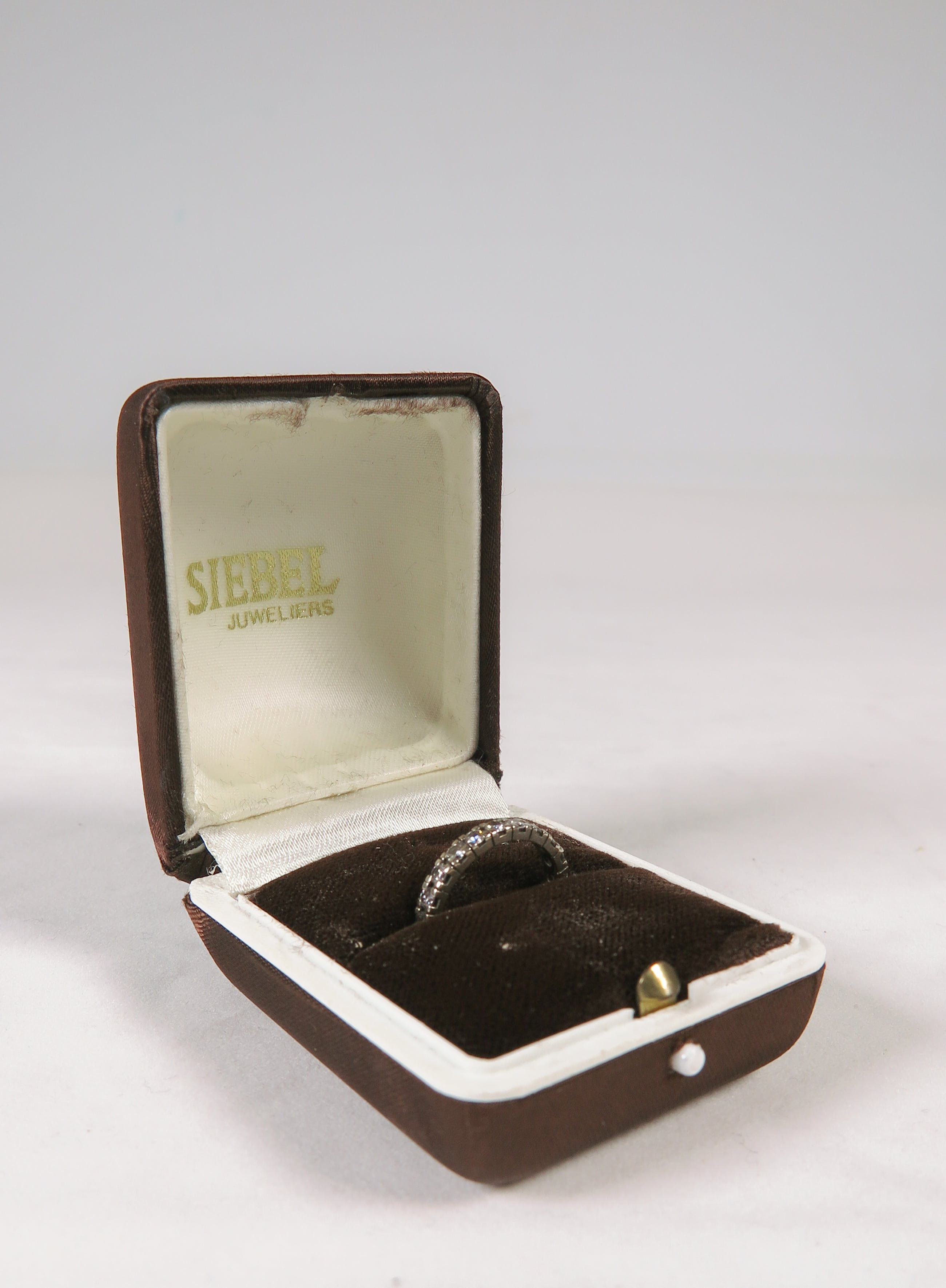 14K witgouden alliancering bezet met 22 briljanten. De diamenten wegen samen 0.98 karaat. In de jaren '70 aangekocht bij Siebel Juweliers voor 2525 gulden.
