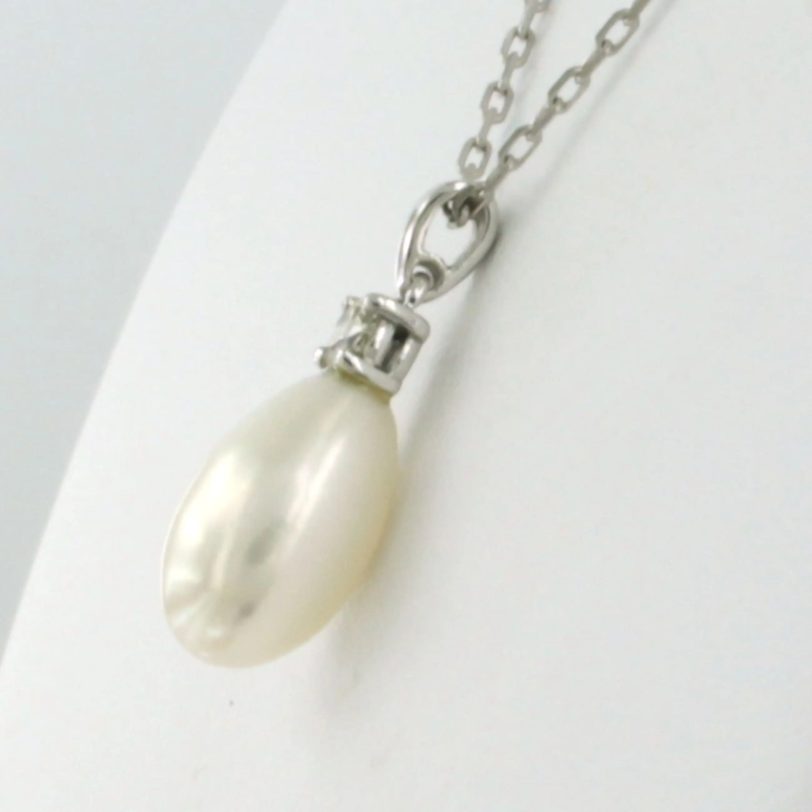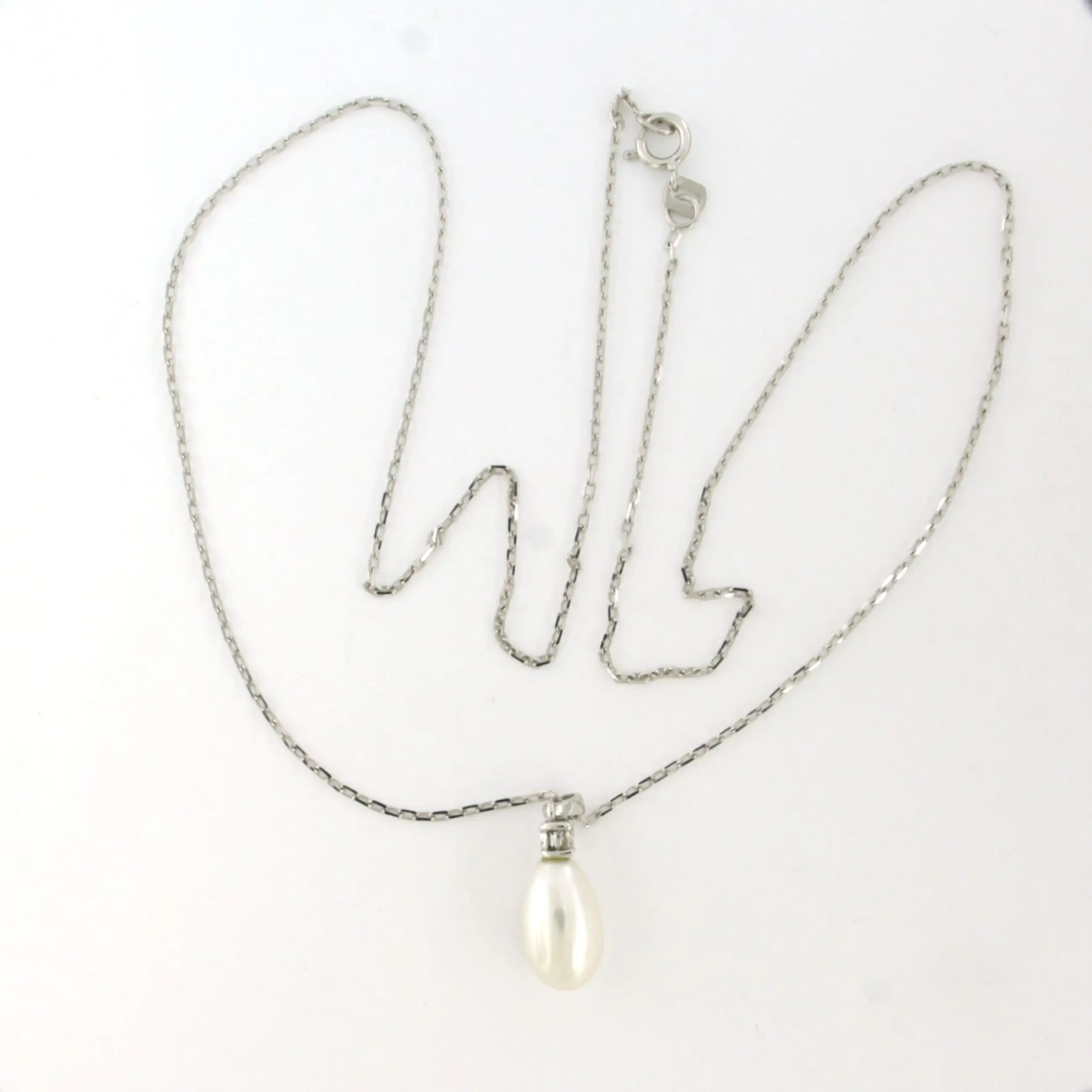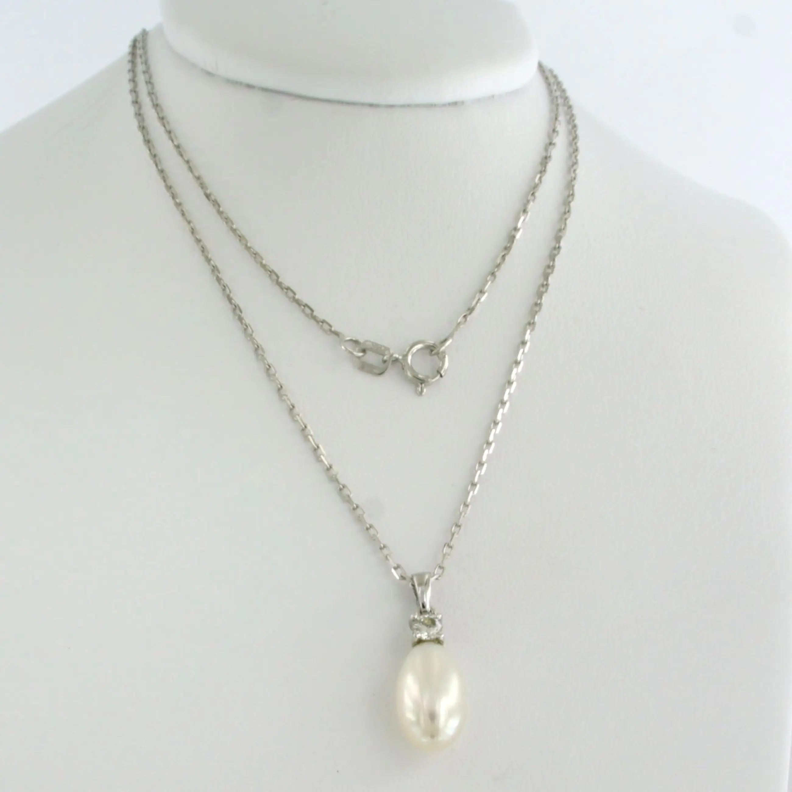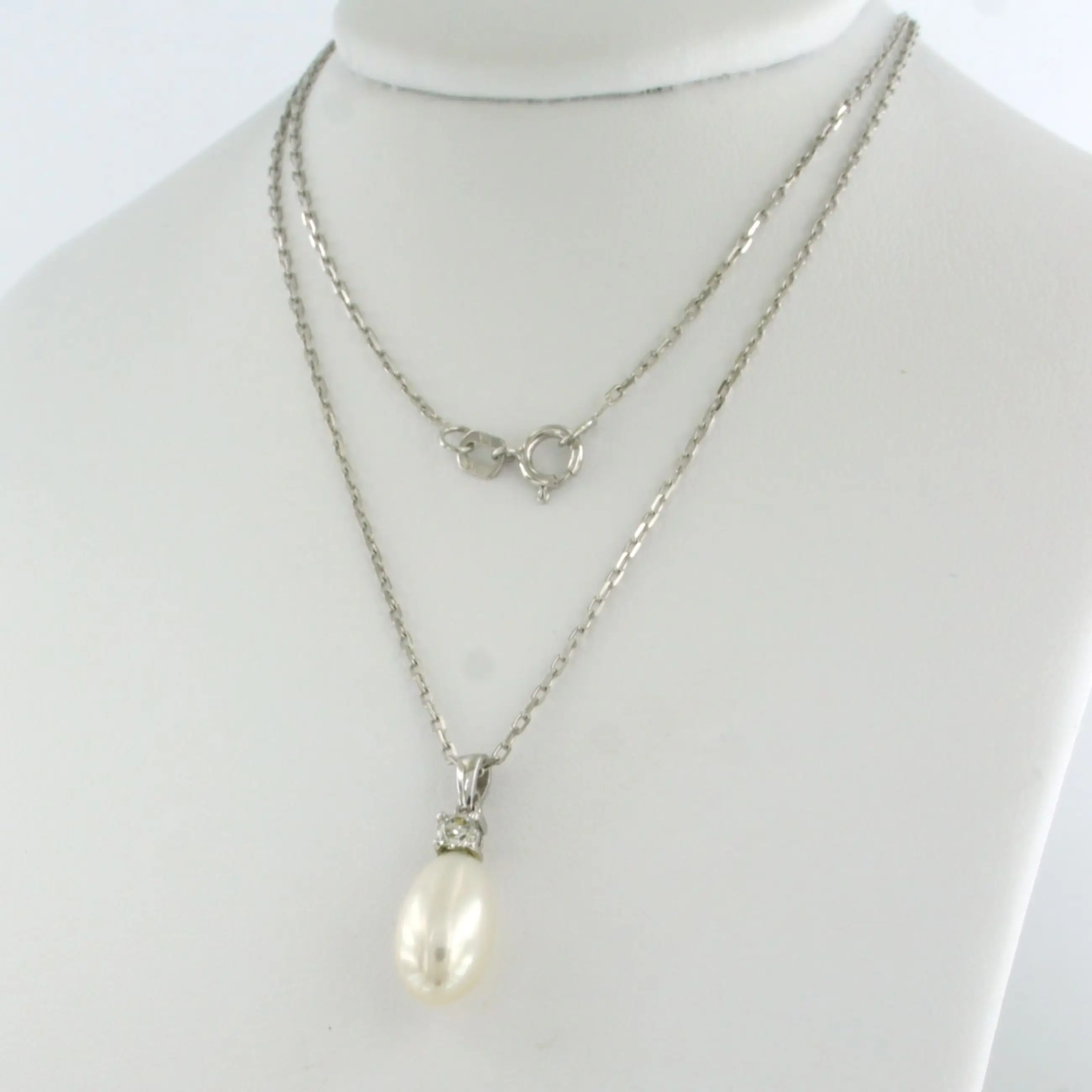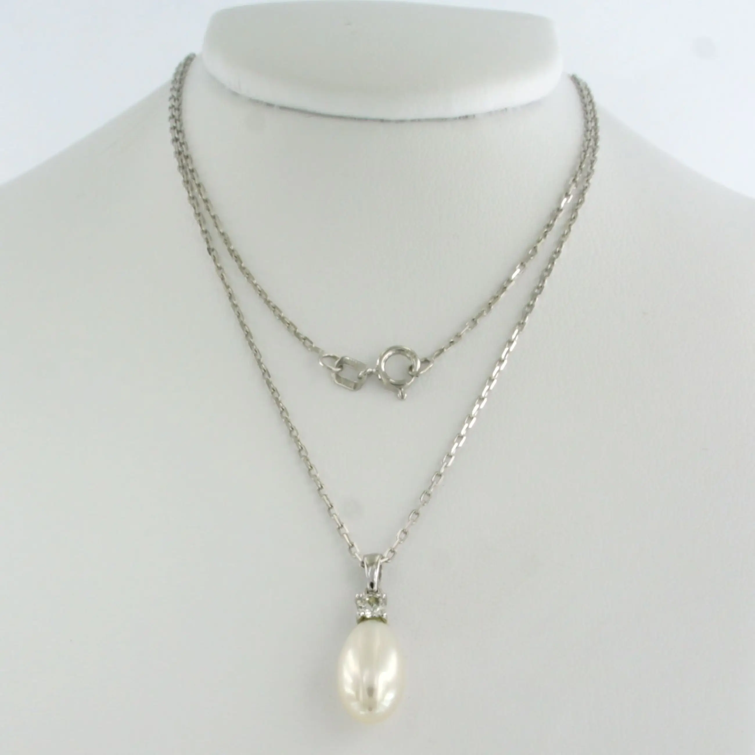 14k wit gouden collier met hanger bezet met parel en briljant geslepen diamant 0.10 ct - F/G - VS/SI - 45cm lang