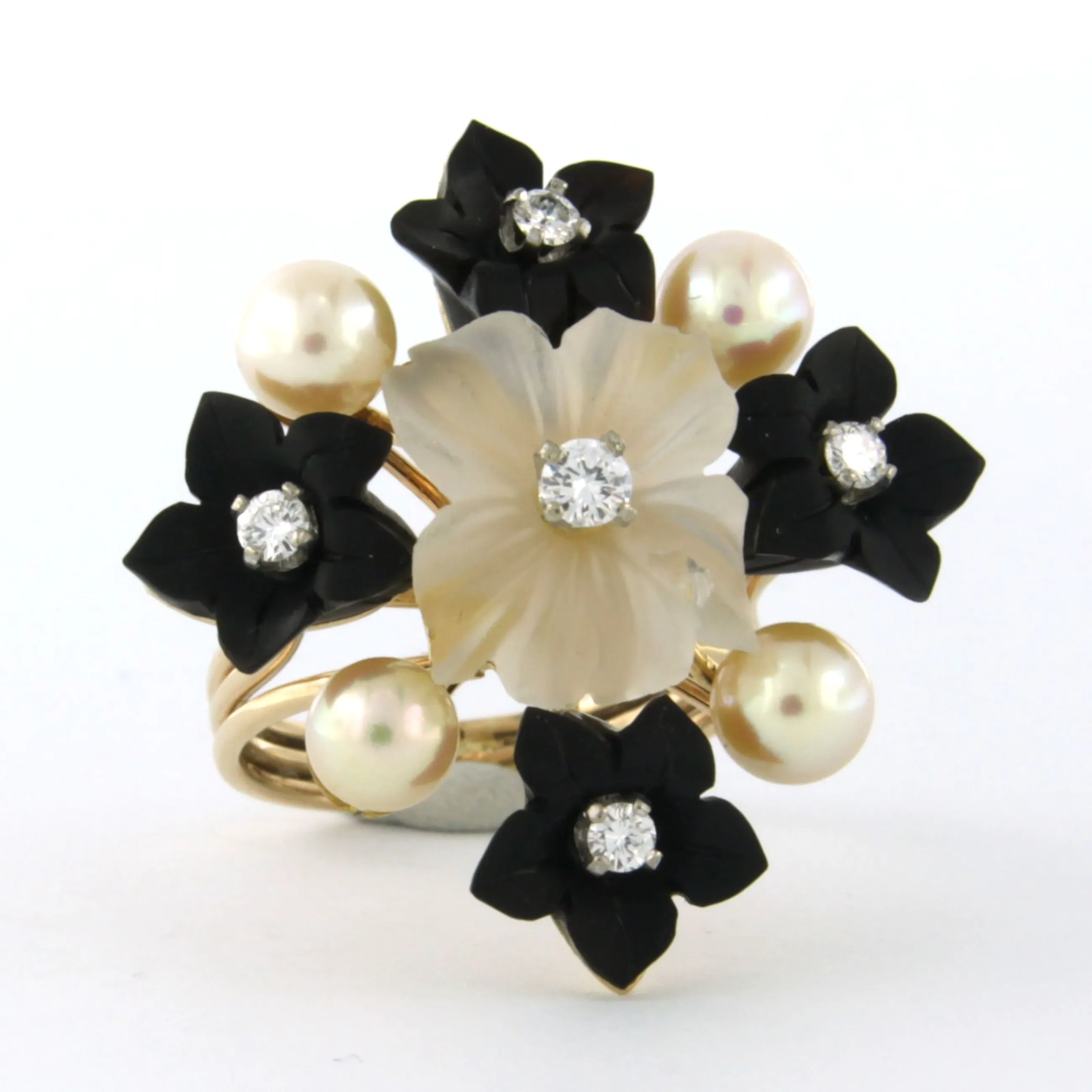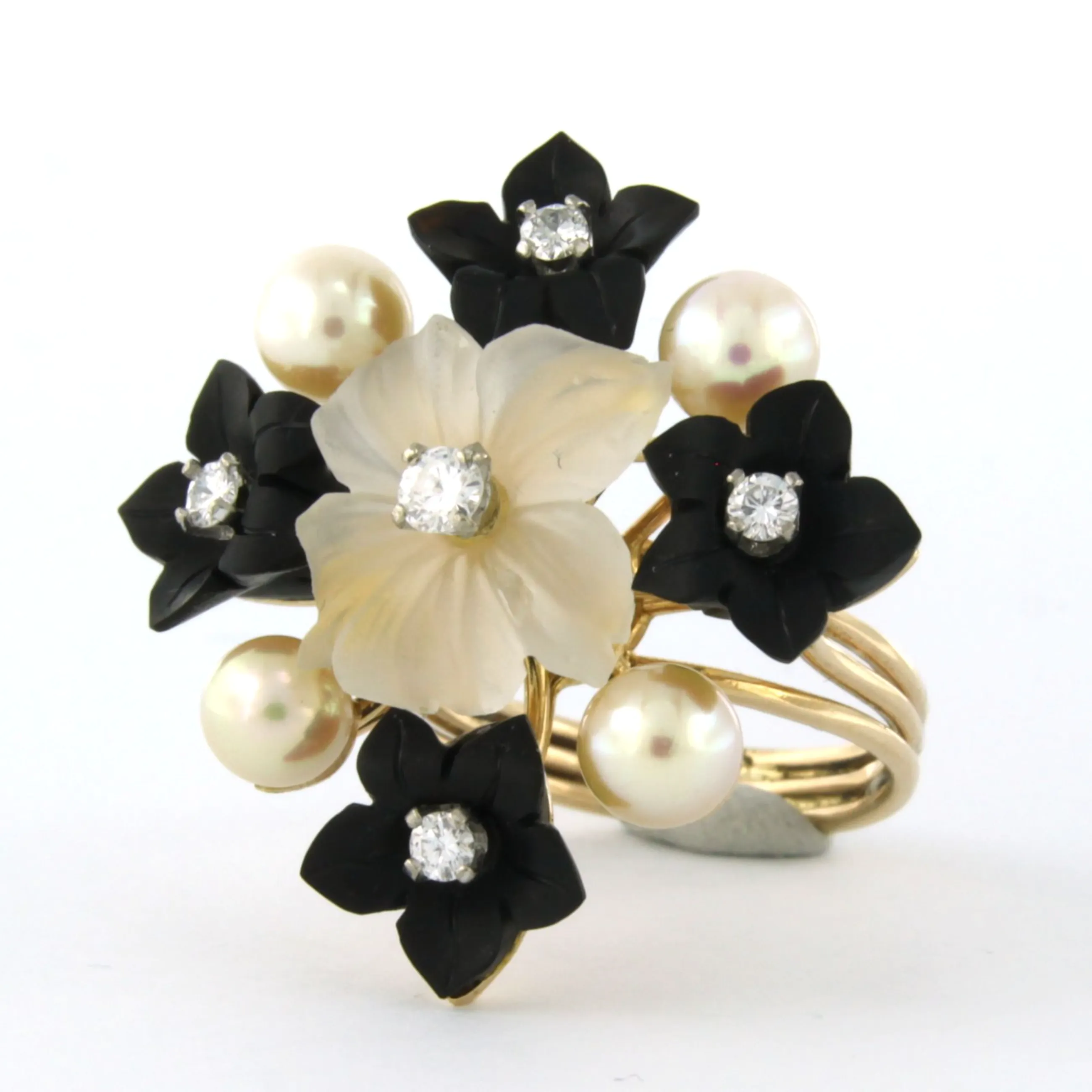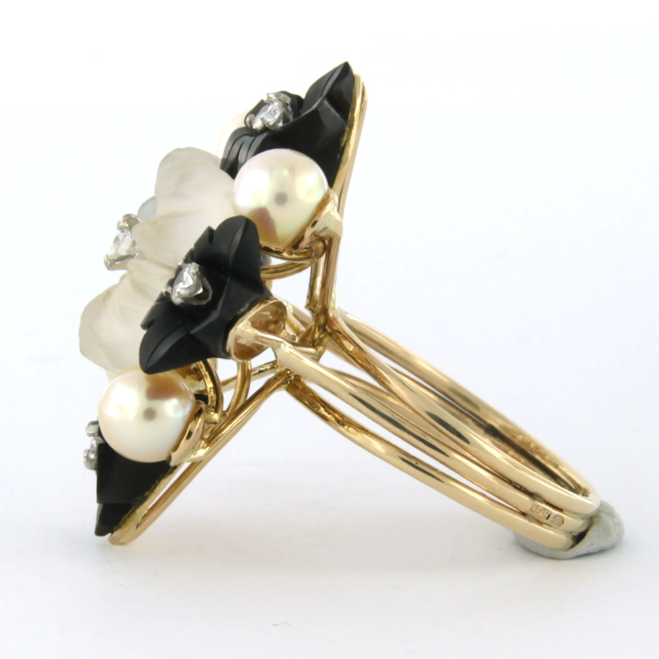 14k bicolor gouden ring bezet met bergkristal, parel, onyx en briljant geslepen diamant tot. 0,25ct - F/G - VS/SI - ringmaat 17,5(55)