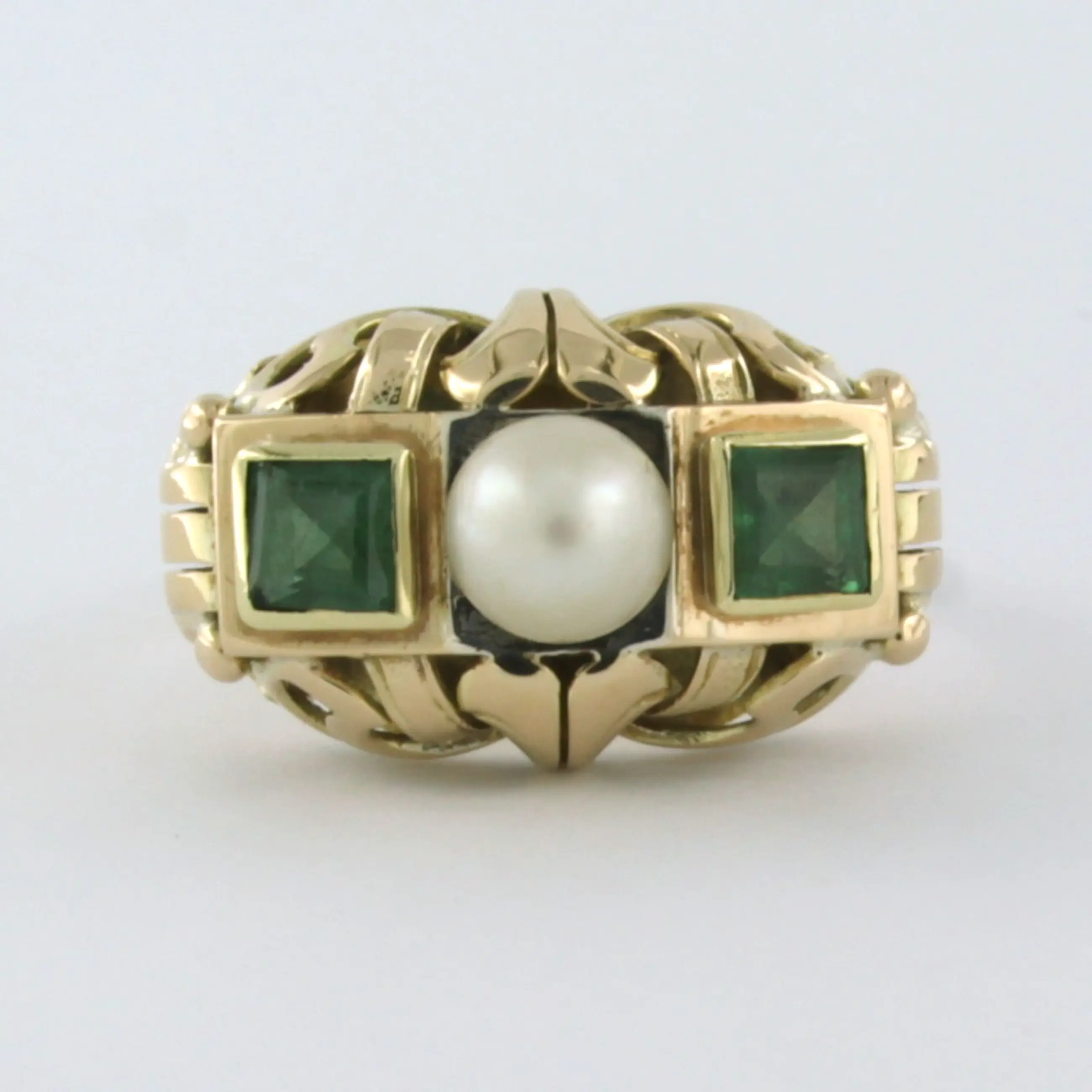 14k gouden ring bezet met parel en carre geslepen smaragd - ringmaat 17.75(56) - Verkocht