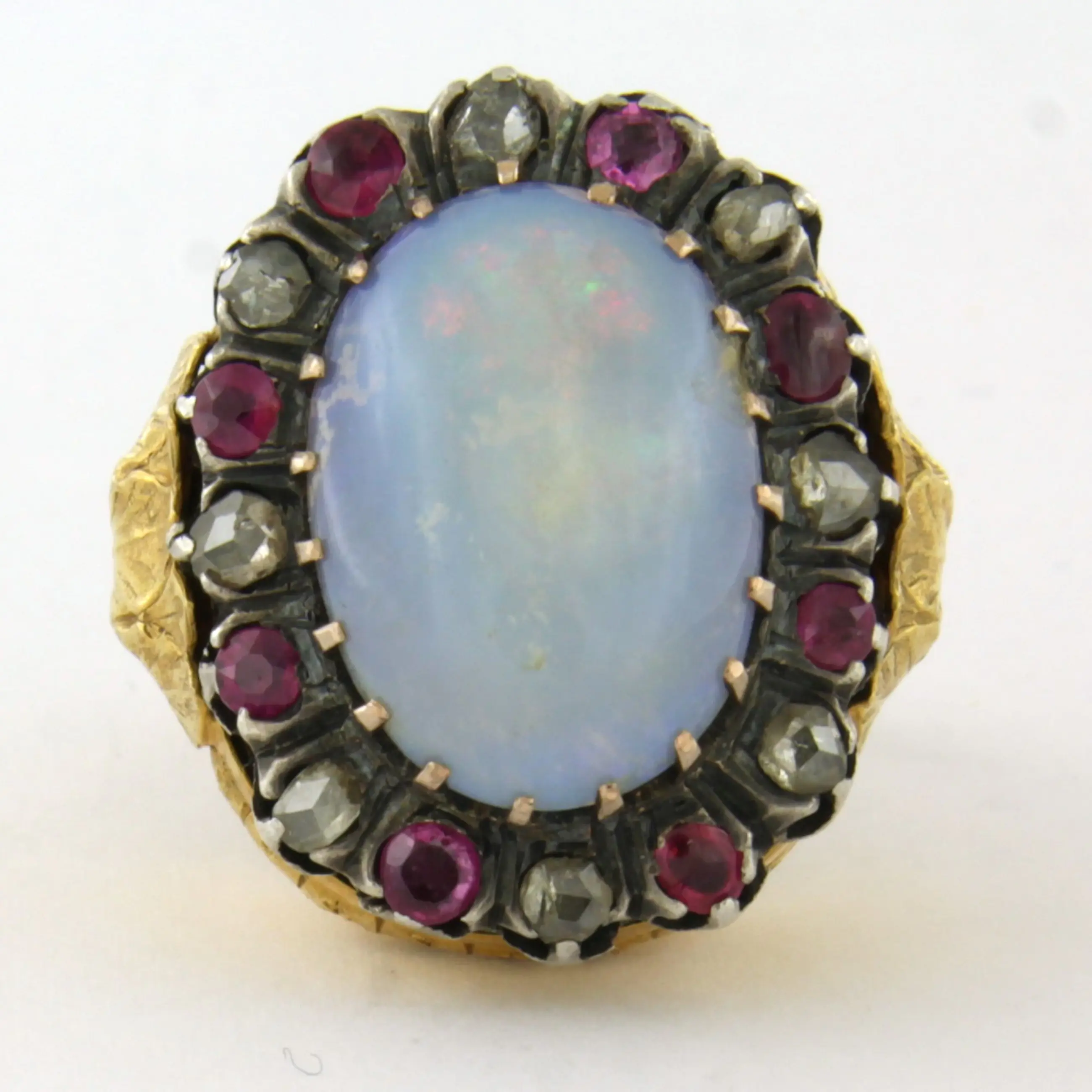 14k geel gouden en zilver ring bezet met centraal een opaal en erom heen robijn en roos geslepen diamant tot. 0.10ct – G/H - SI - ringmaat 18.25(57)