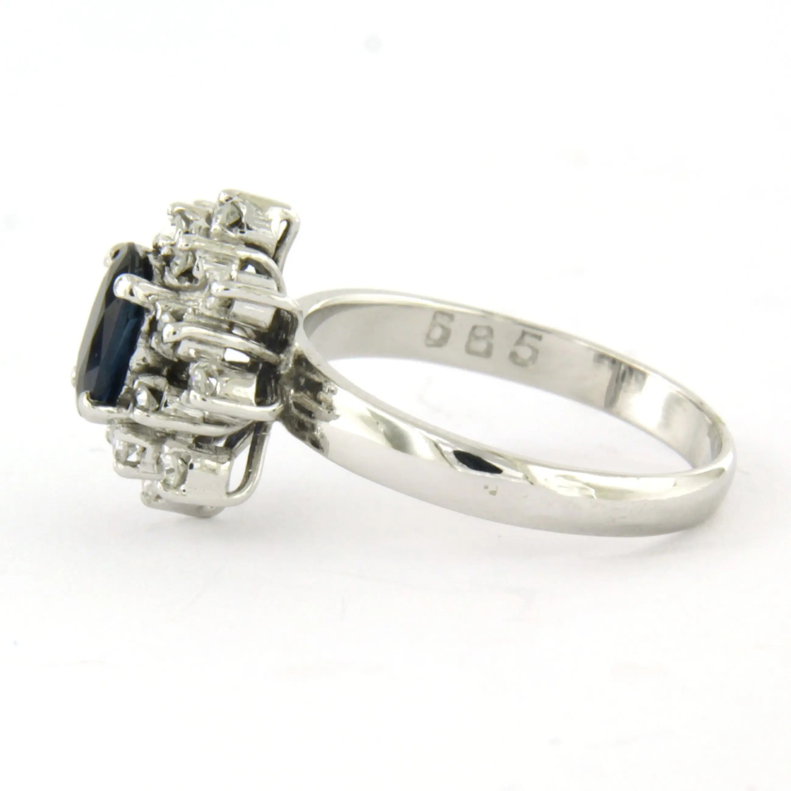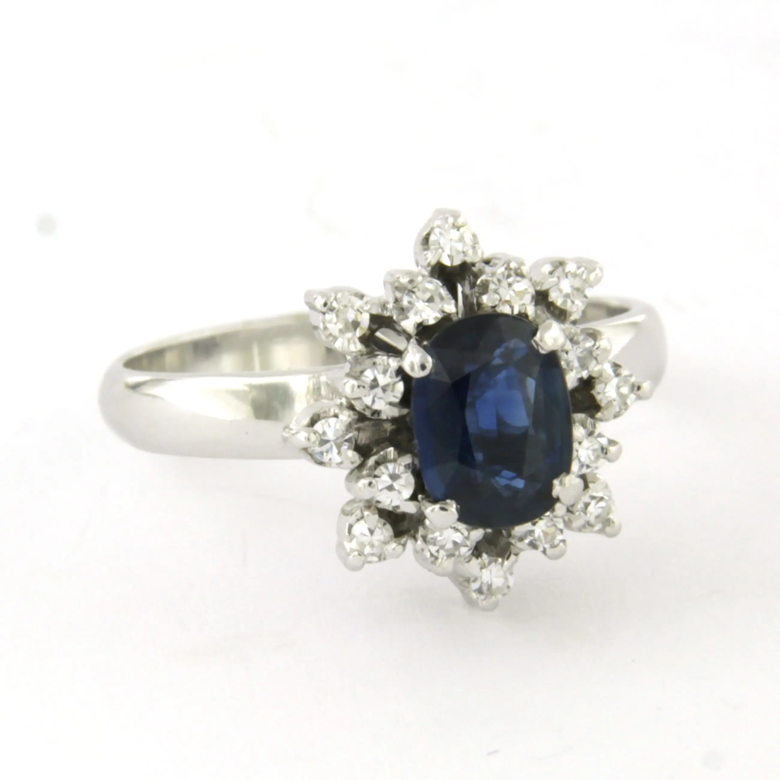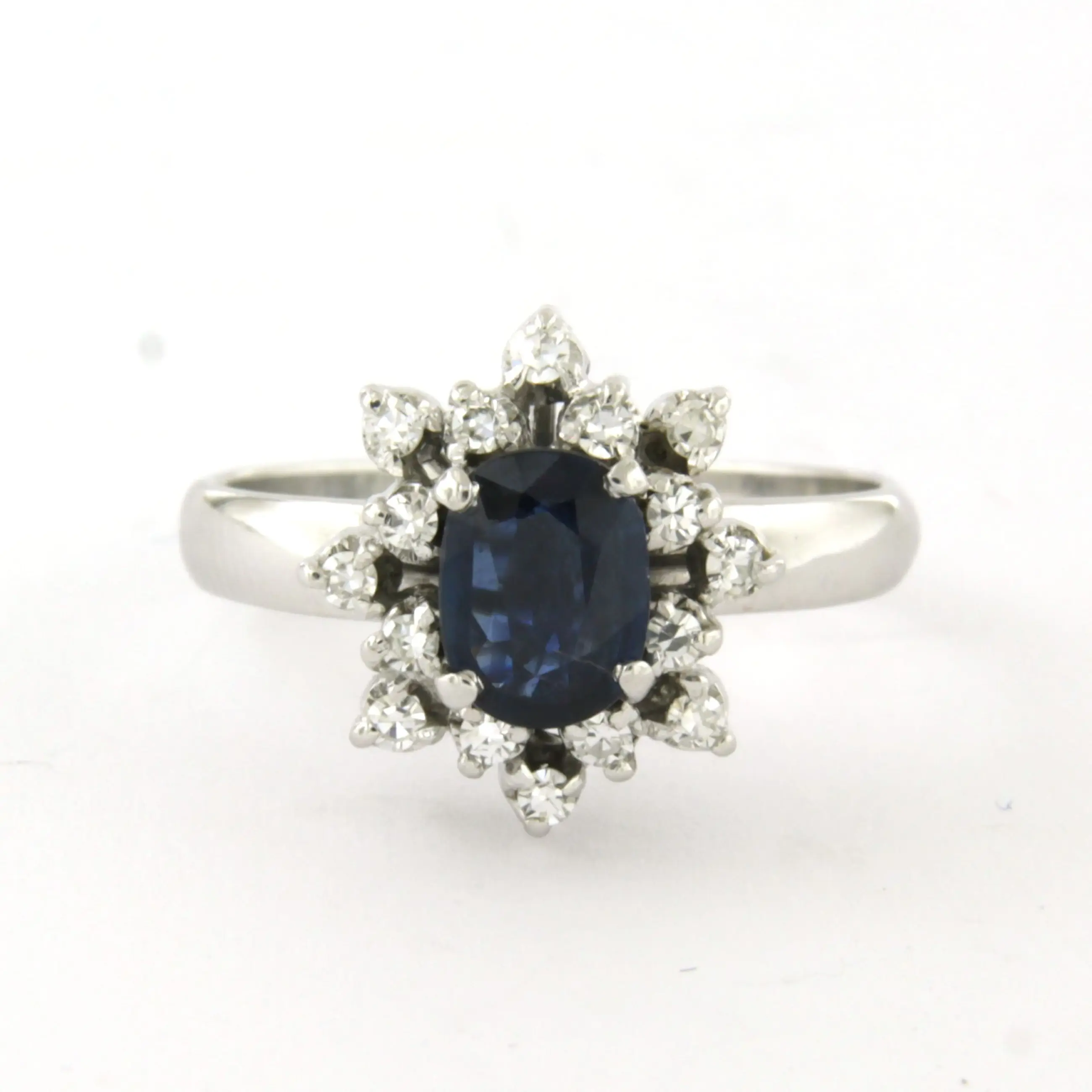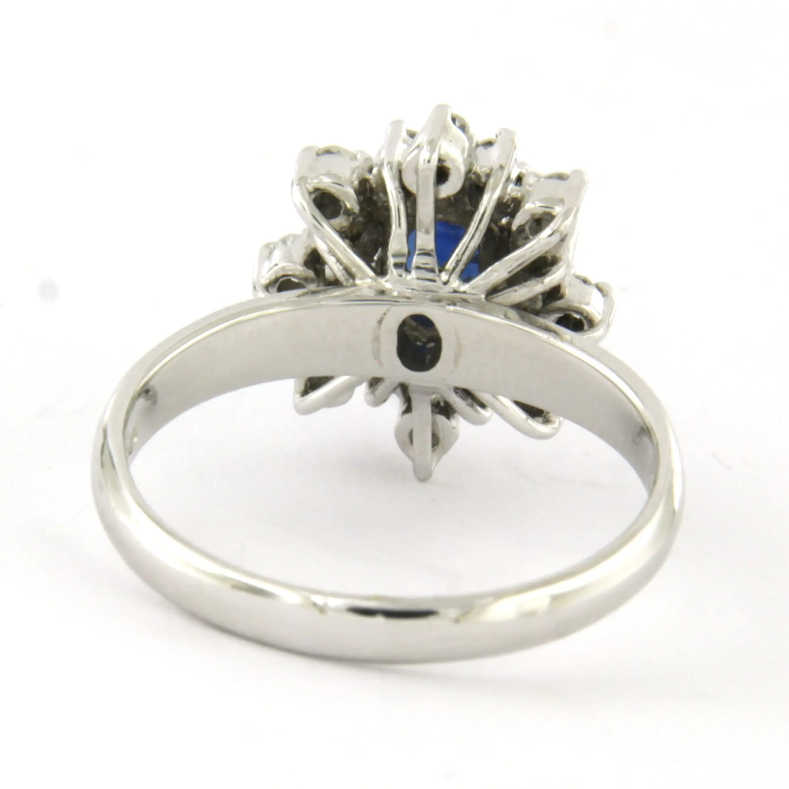 14k wit gouden ring bezet met centraal een saffier tot. 0.65ct en erom heen single cut geslepen diamant tot. 0.25ct - F/G - VS/SI - ringmaat 16.5(52)