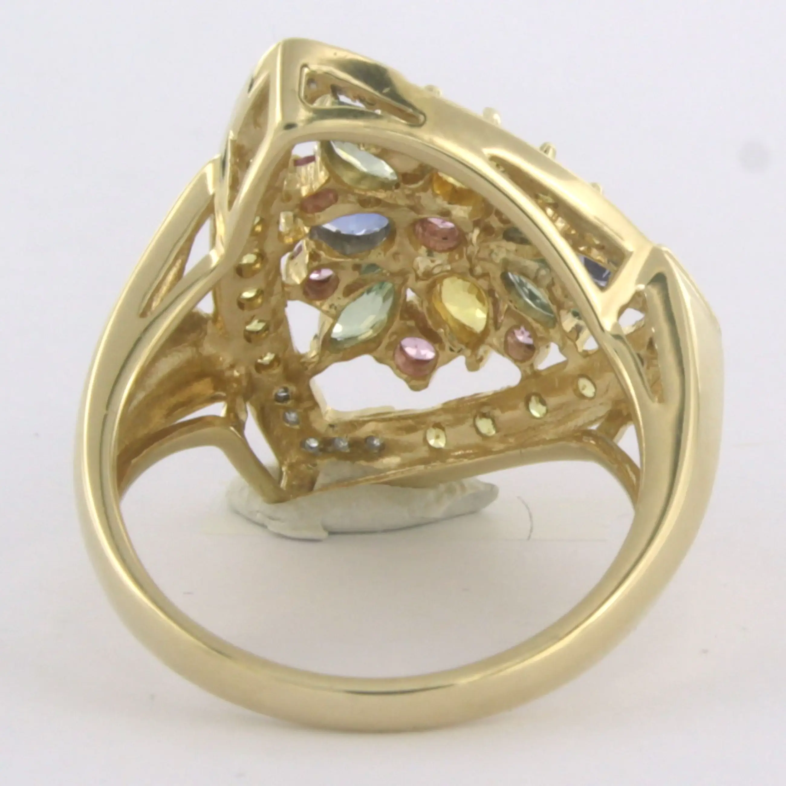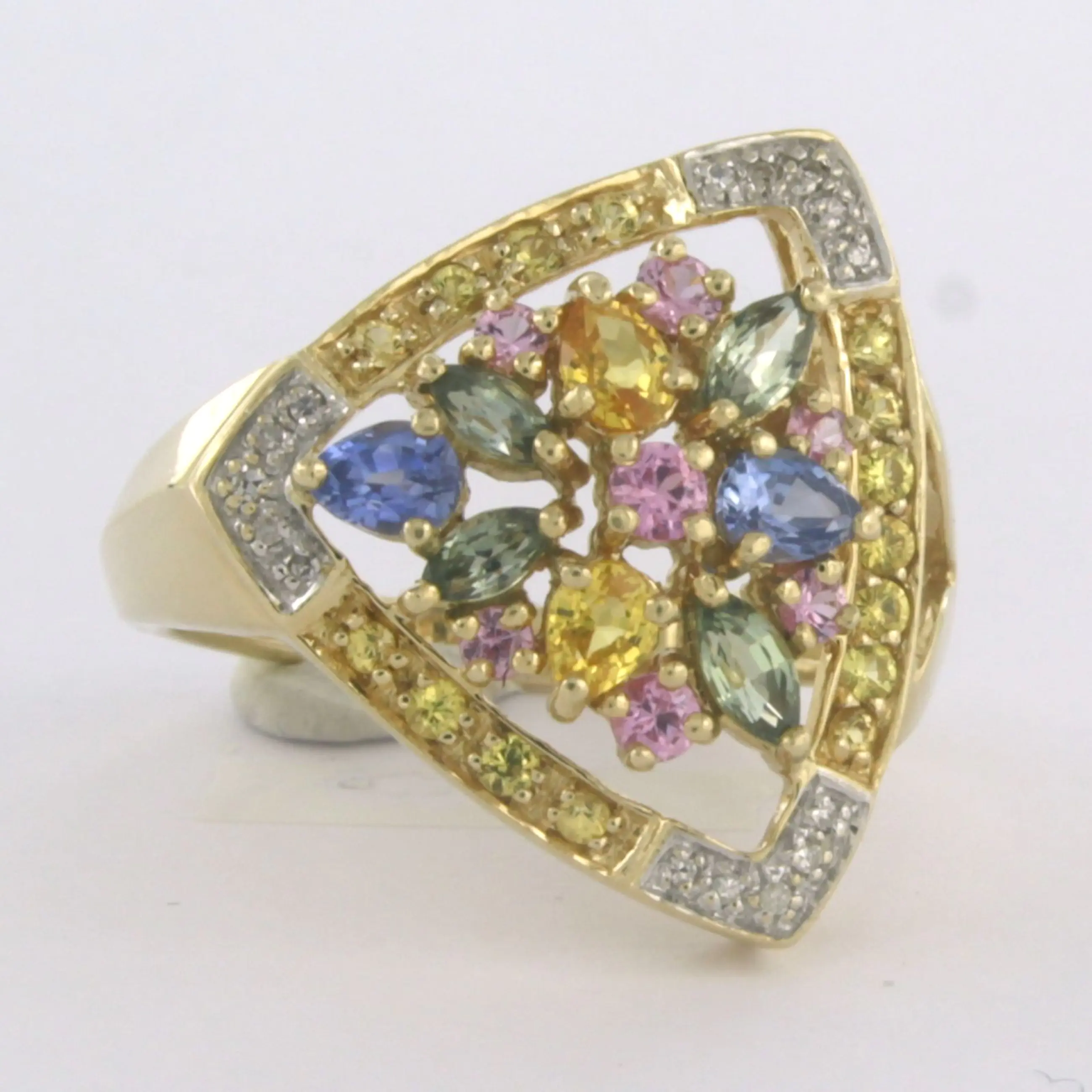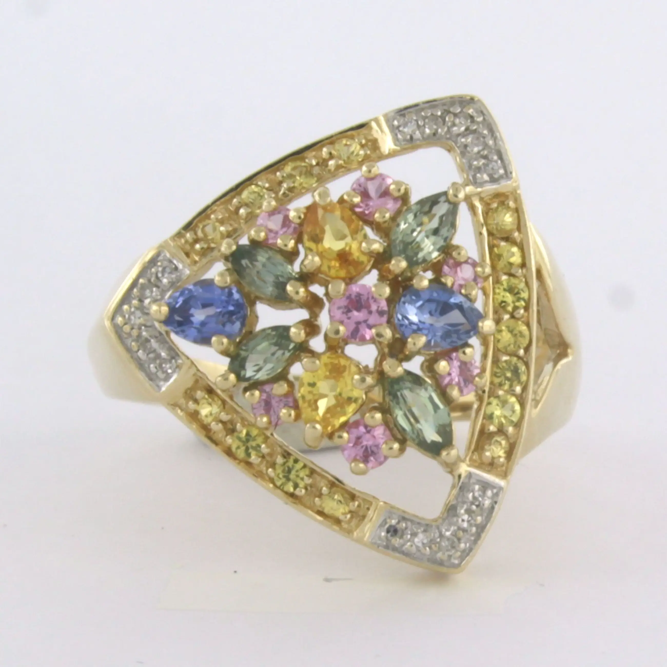 14k geel gouden ring bezet met verschillende kleuren saffier en single cut geslepen diamant 0.03ct - F/G - VS/SI - ringmaat 18.75 (59)