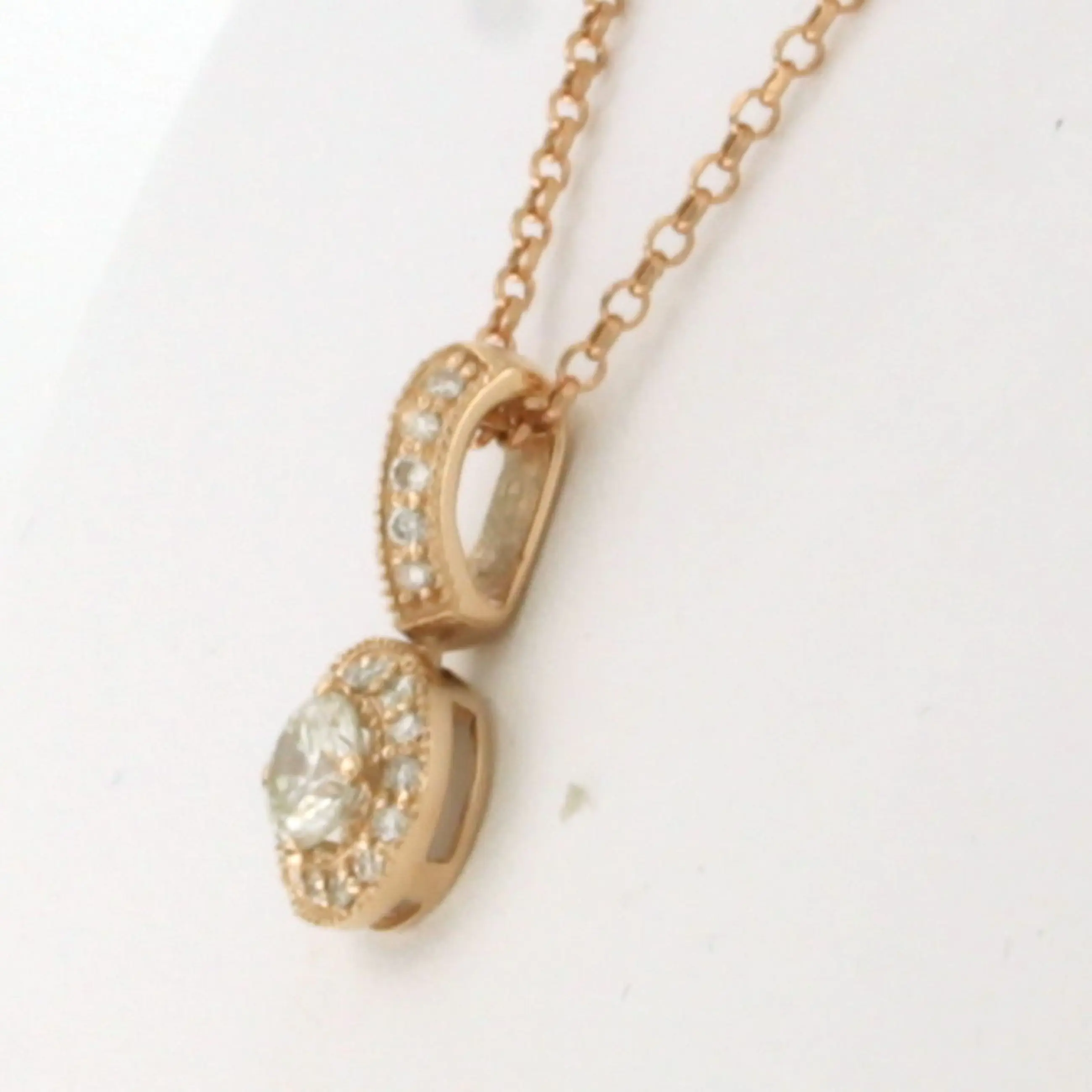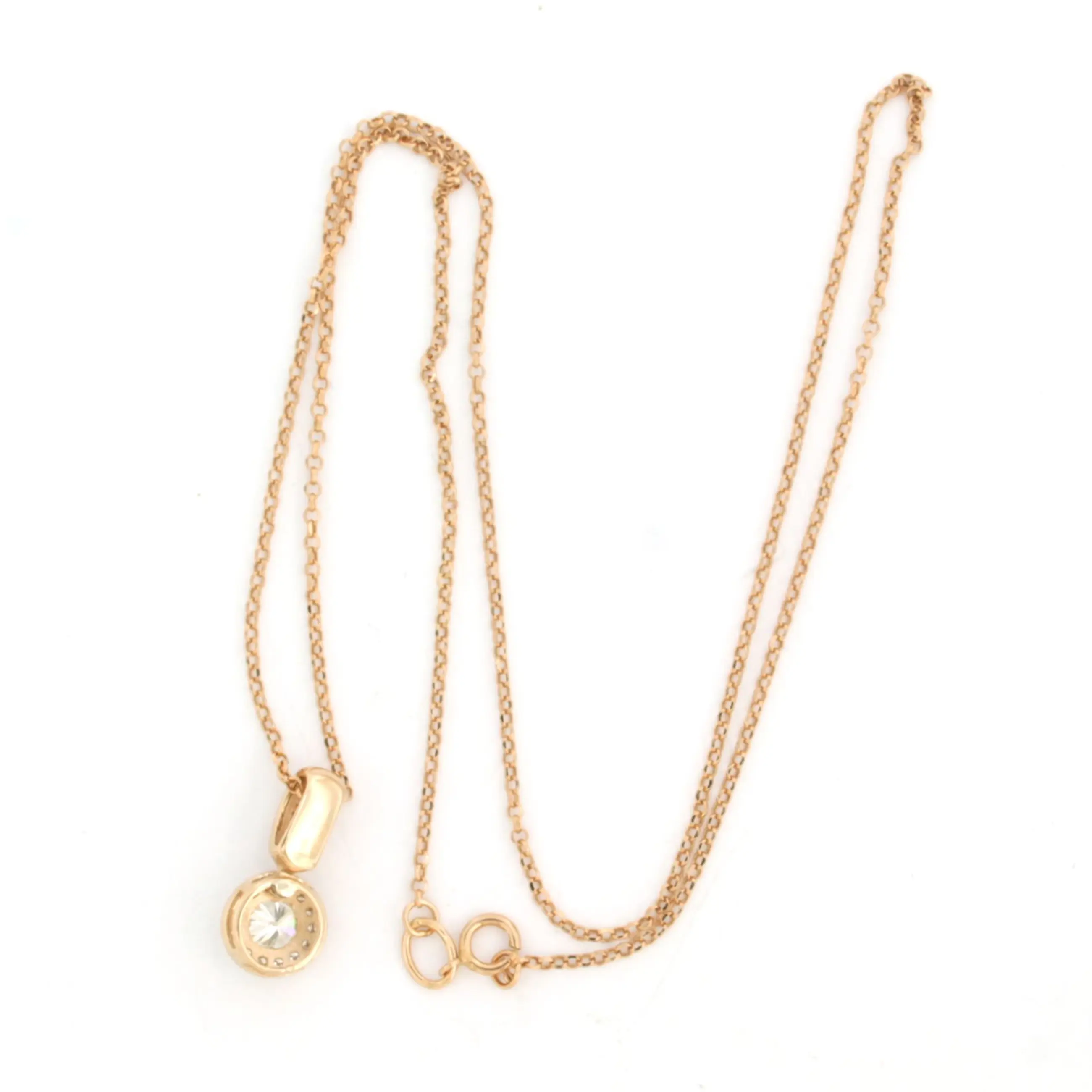 14k rosé gouden collier met een entourage hanger bezet met centraal een briljant geslepen diamant tot. 0.35ct – H/I – pique - en erom heen briljant geslepen diamanten tot. 0,17ct - F/G - VS/SI - 45 cm lang