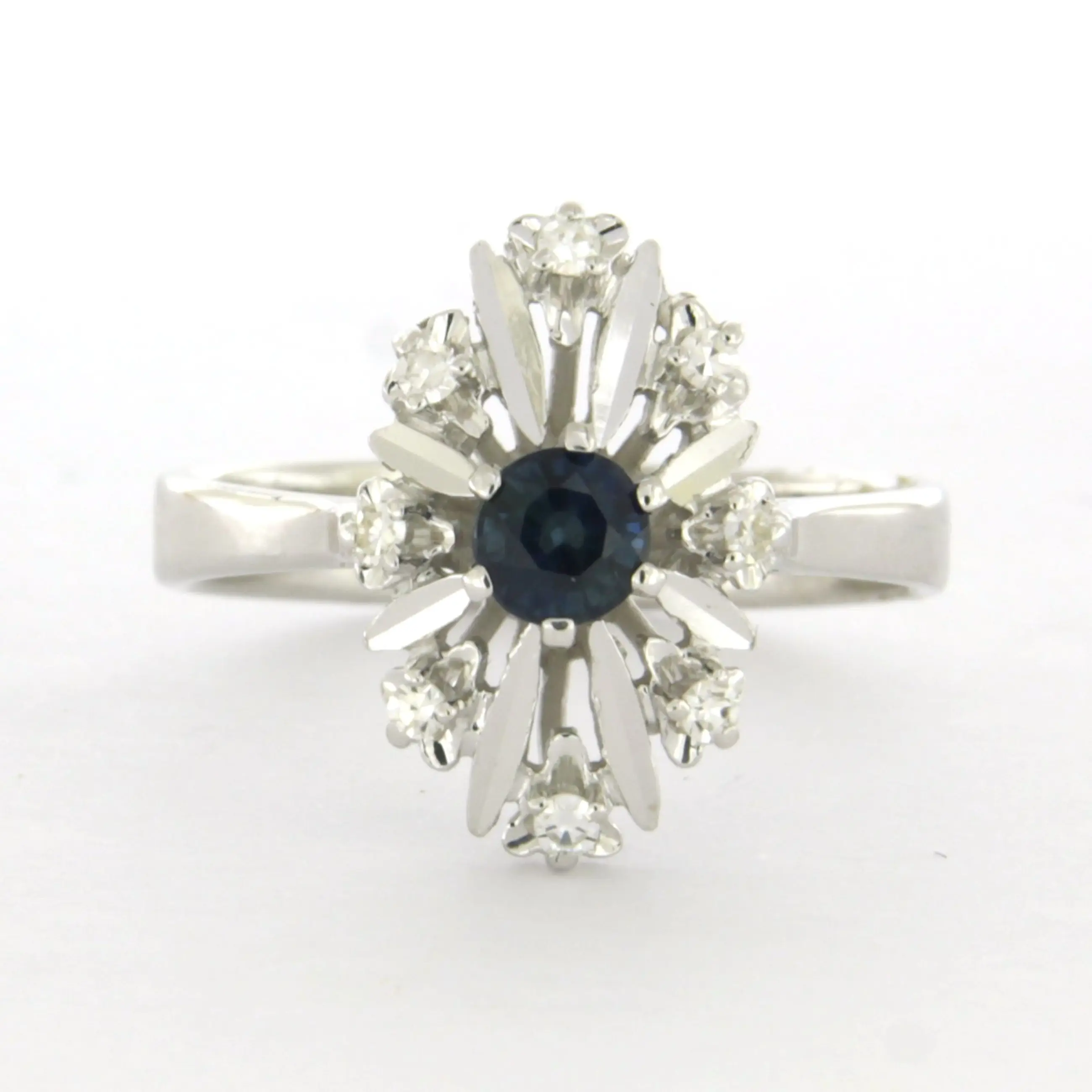 14k wit gouden ring bezet met saffier en single cut geslepen diamant tot. 0.11ct – F/G – VS/SI – ringmaat 17.5(55)
