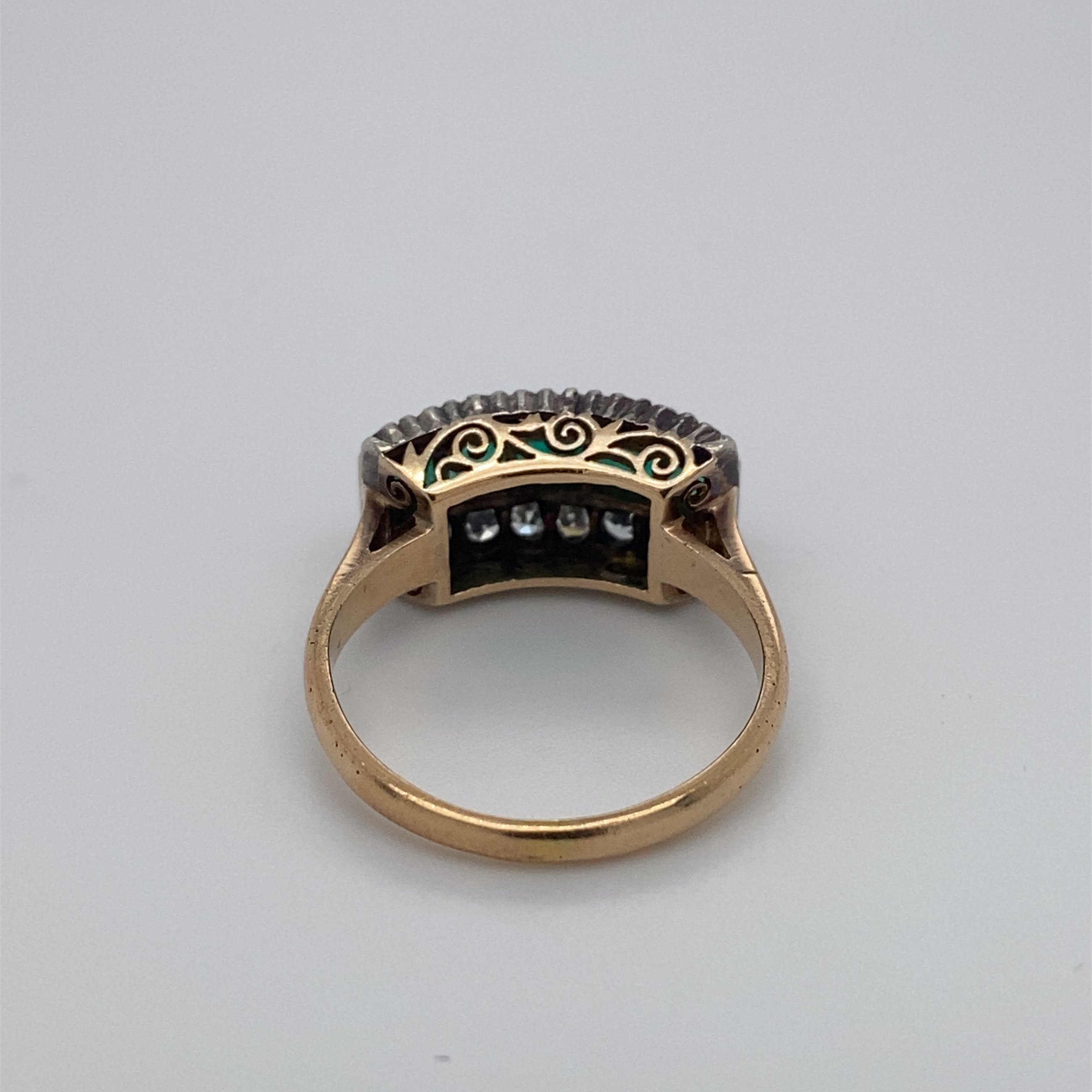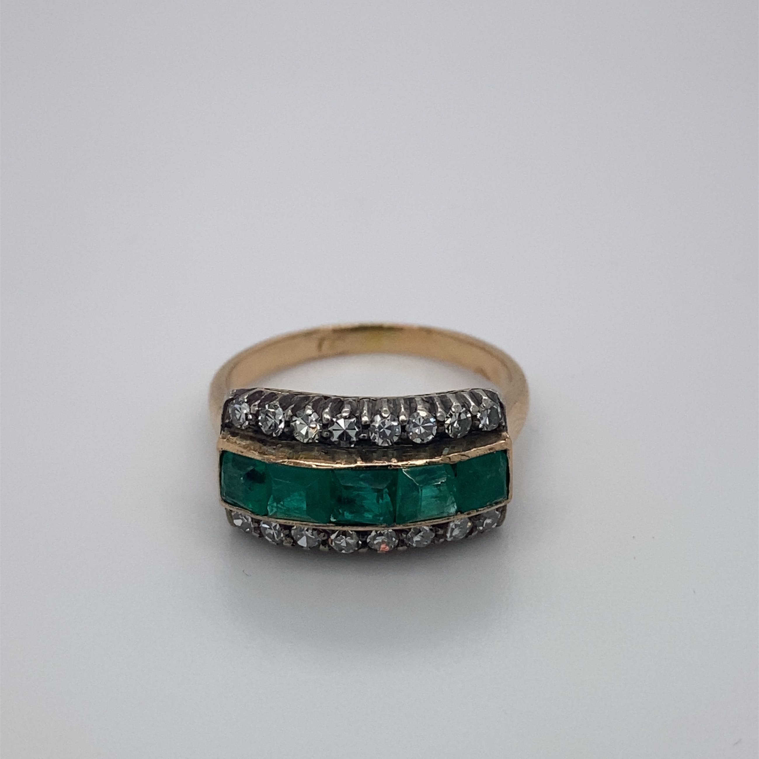 bezet met 5 x 3mm vierkant smaragd en 16 x 8kantjes diamant