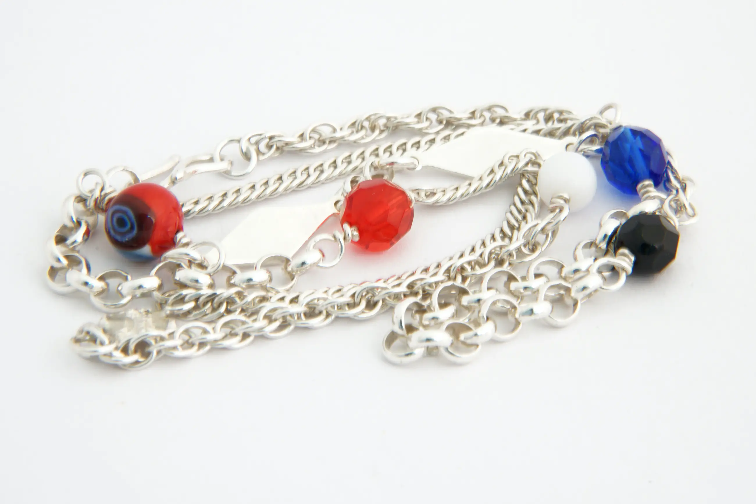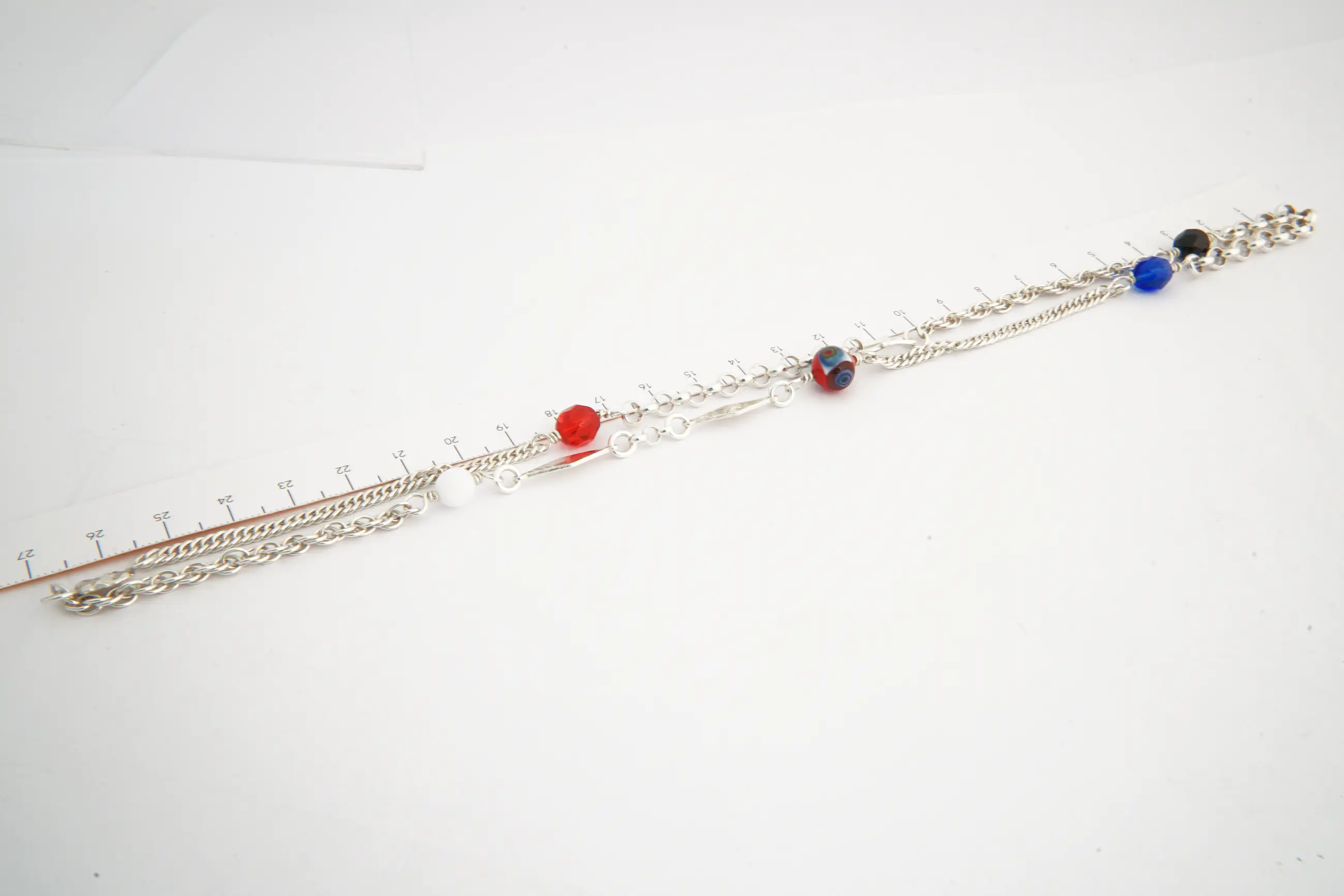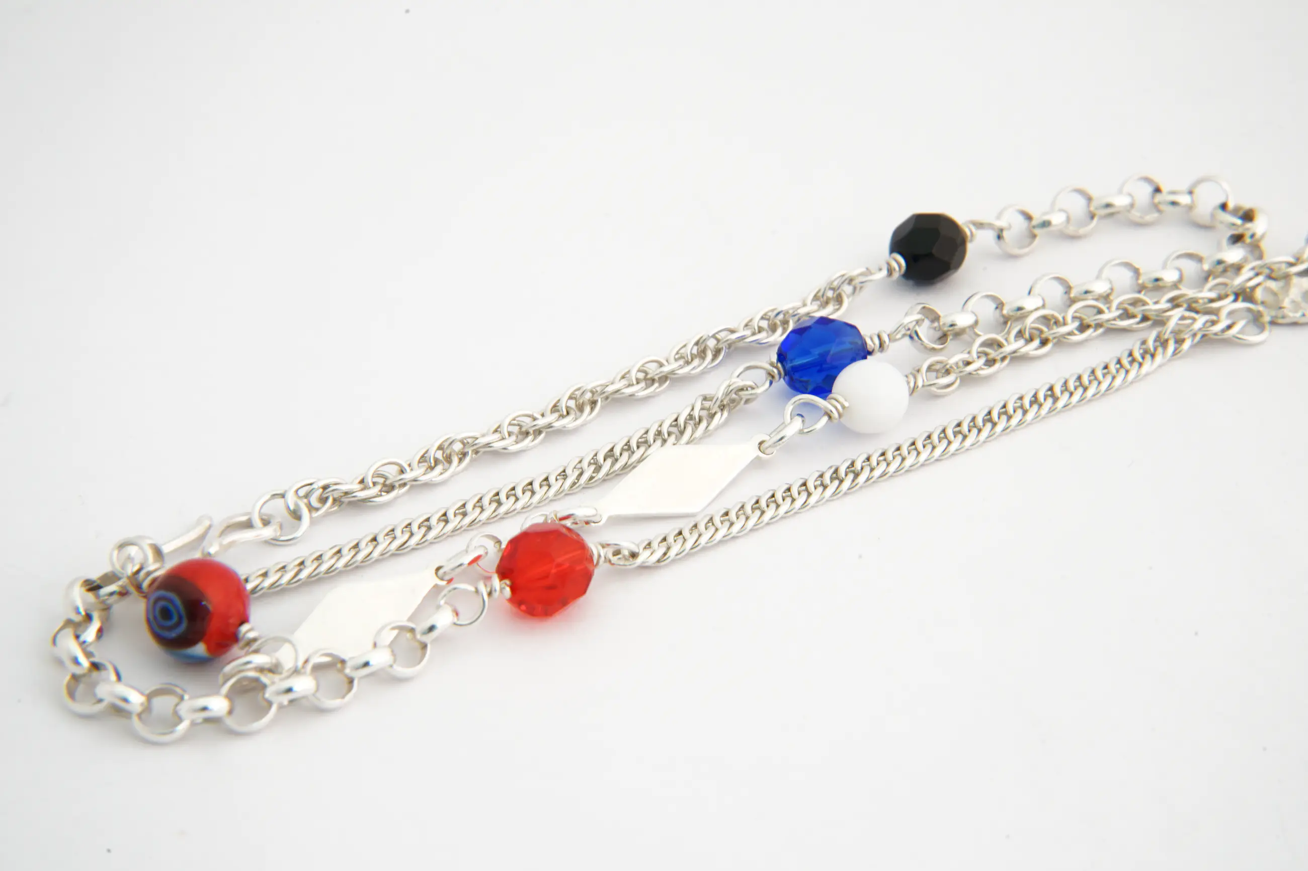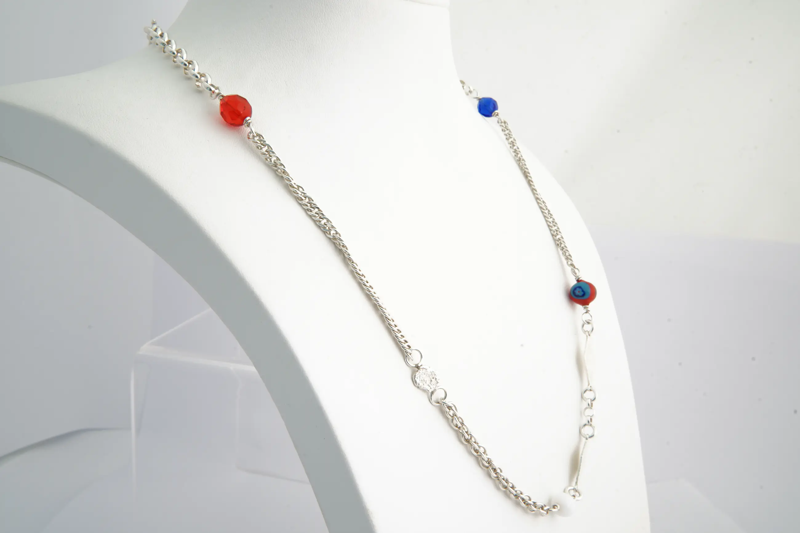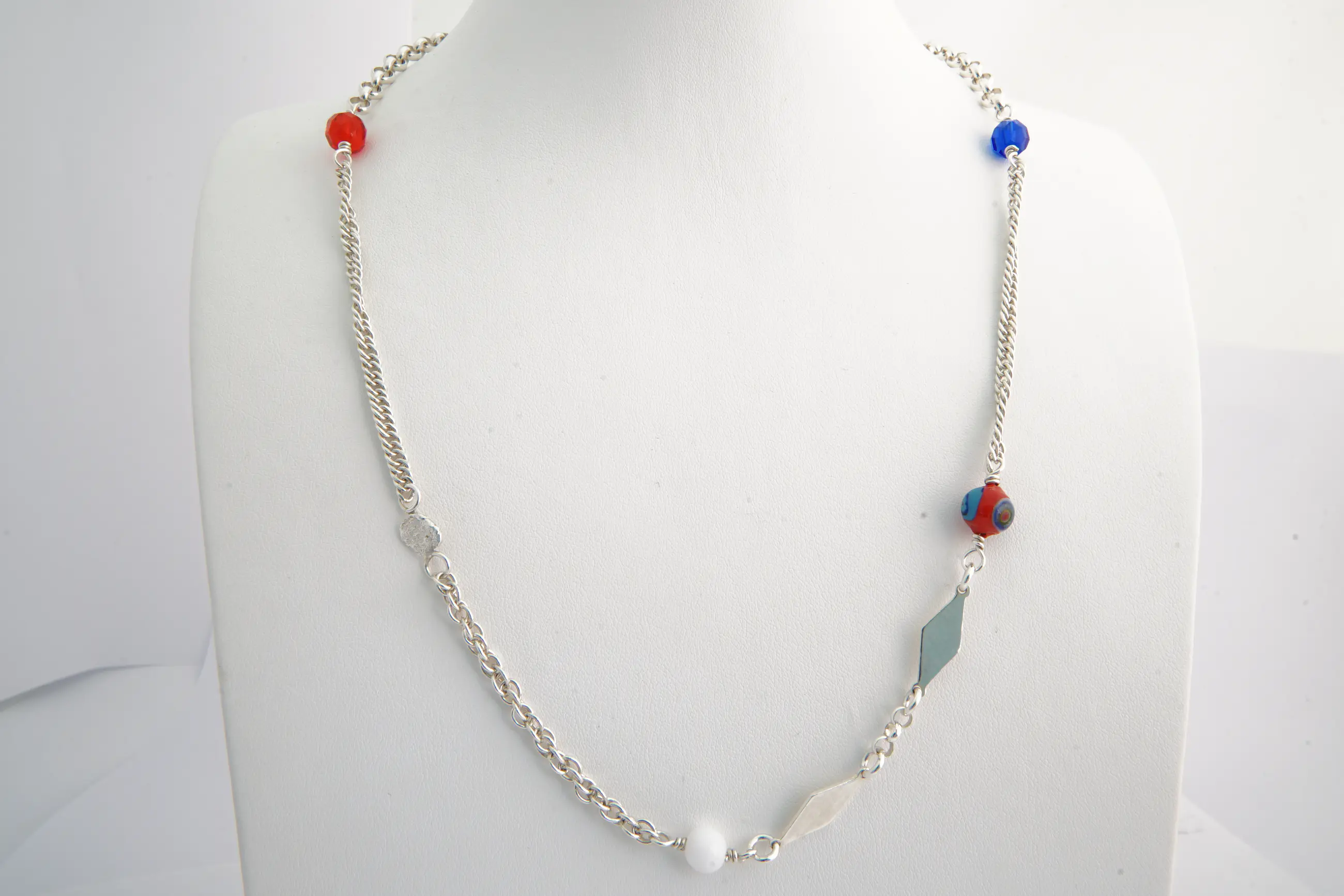 • U biedt op een 1e gehalte (925/1000) Zilveren zogenaamd "Alla kondre" collier met blauwe, zwarte, rode en 1 bont-gekleurde kraal.  Daarnaast een piet-piet of nugget en diverse andere tussenstukken. Verschillende schakels w.o. Jasseronschakel en prince of wales schakel.