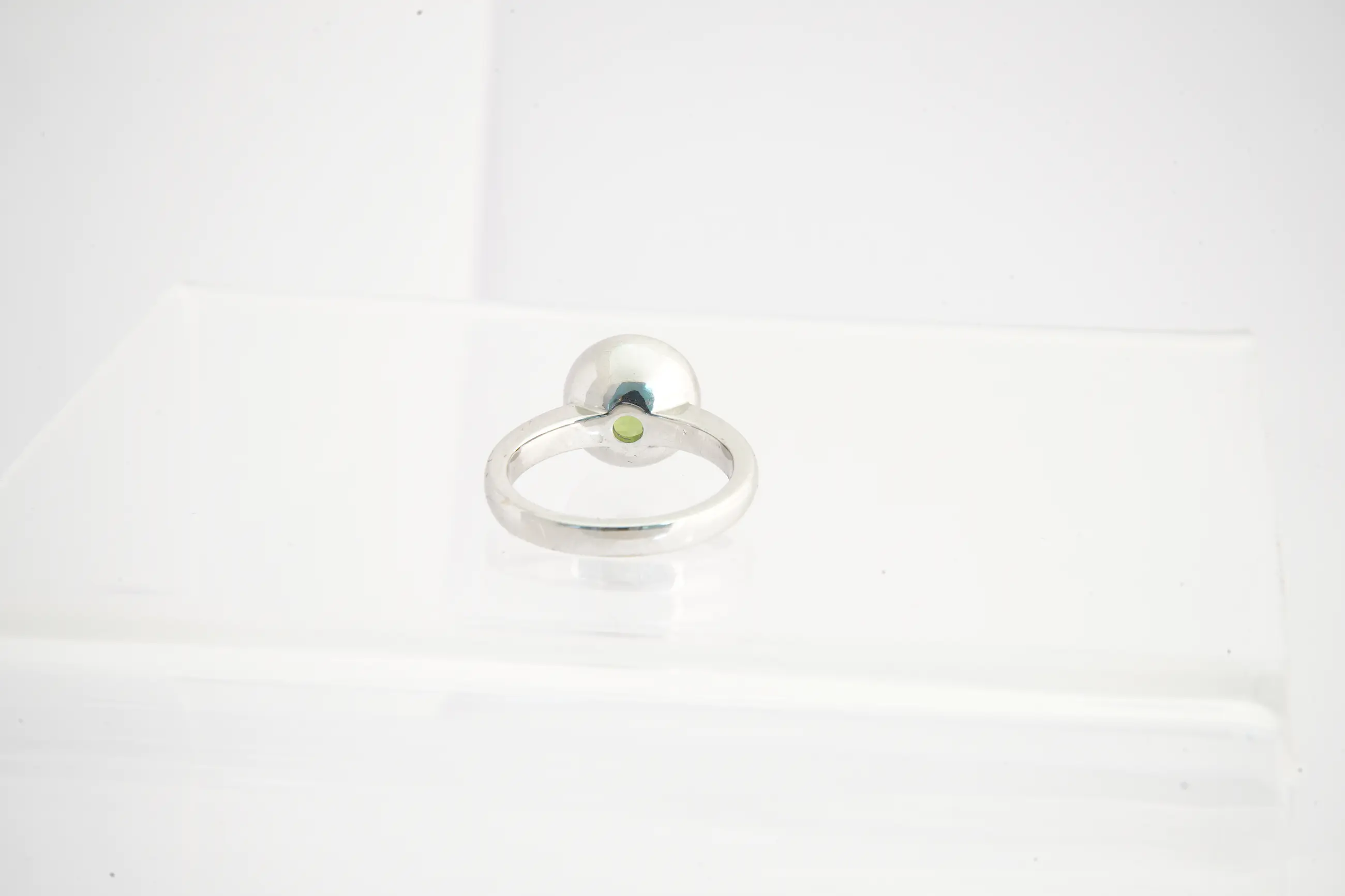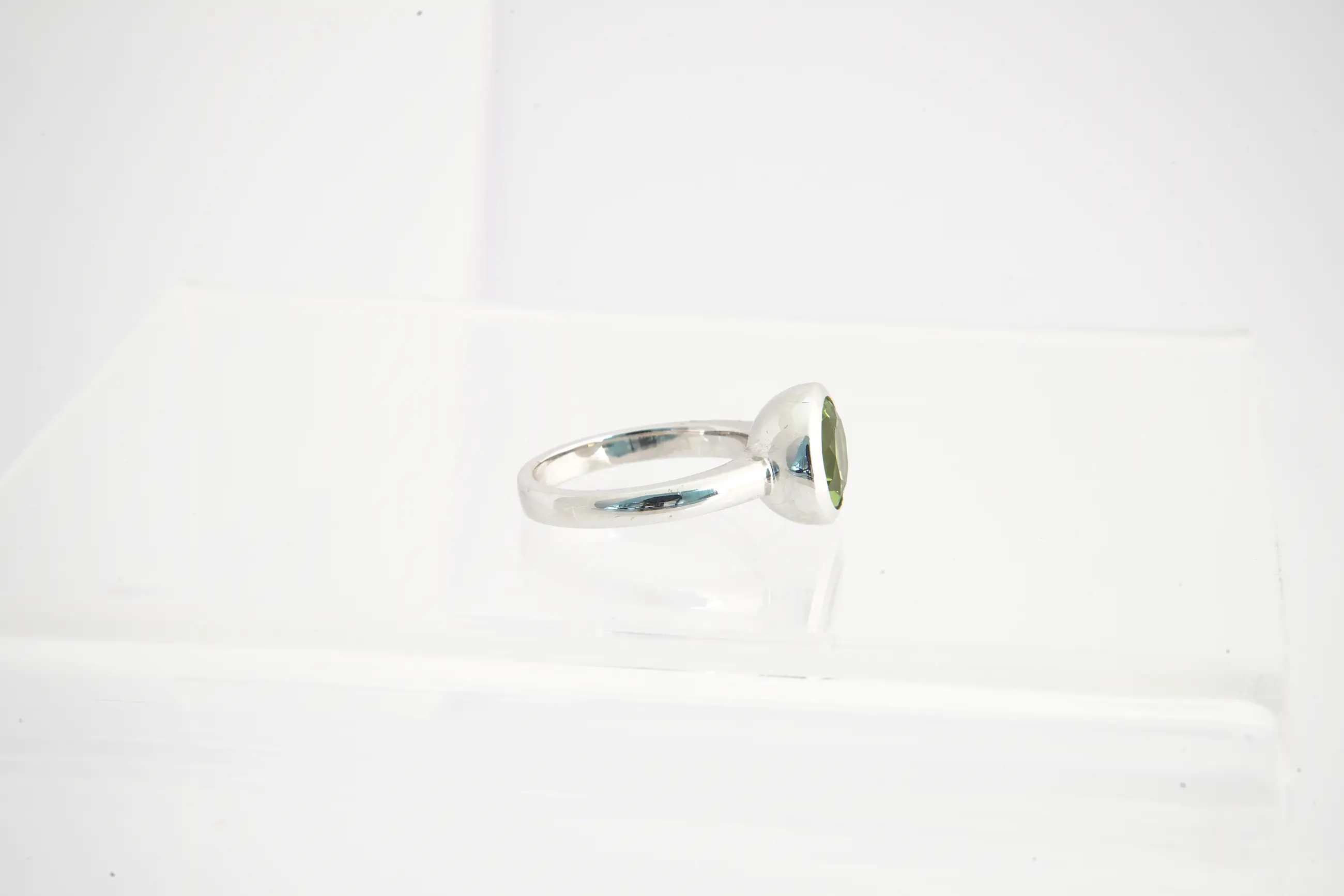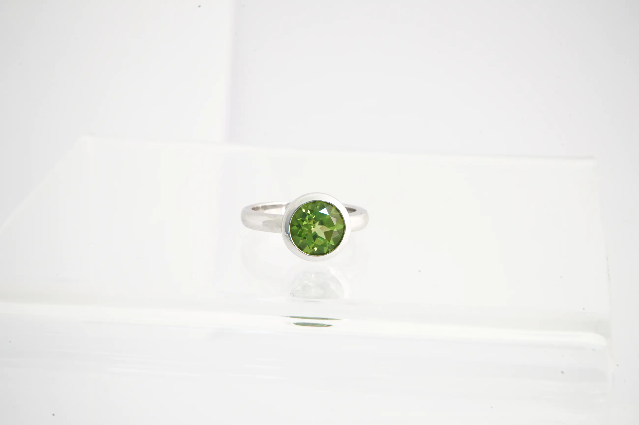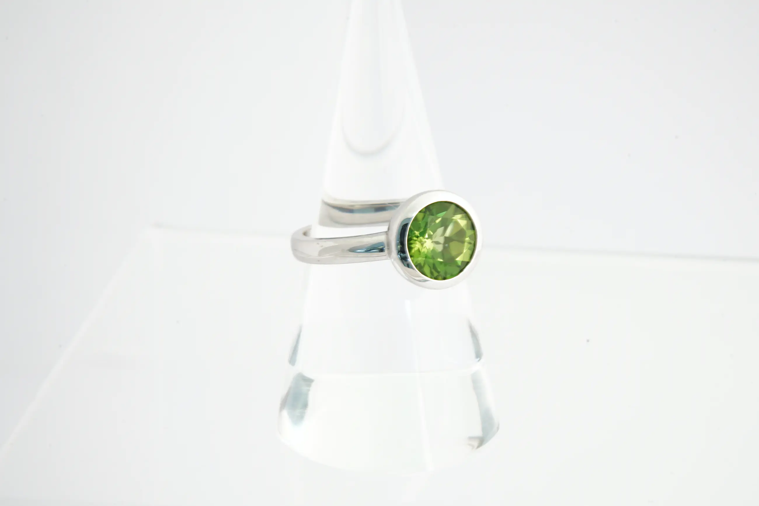 • U biedt op fraaie, massief 14 Krt wit- gouden ring met centraal een lichtgroene, facetgeslepen lichtgroene edelsteen. De ring verkeert in goede conditie. De steen vertoont lichte beschadigingen op de facetranden.