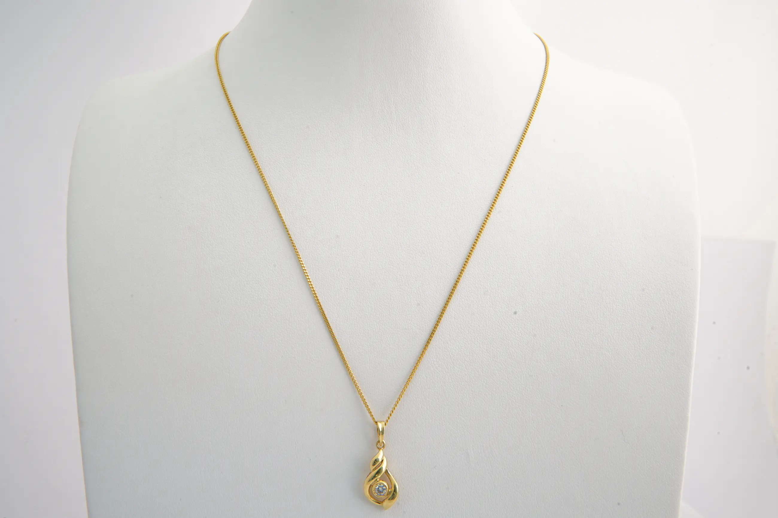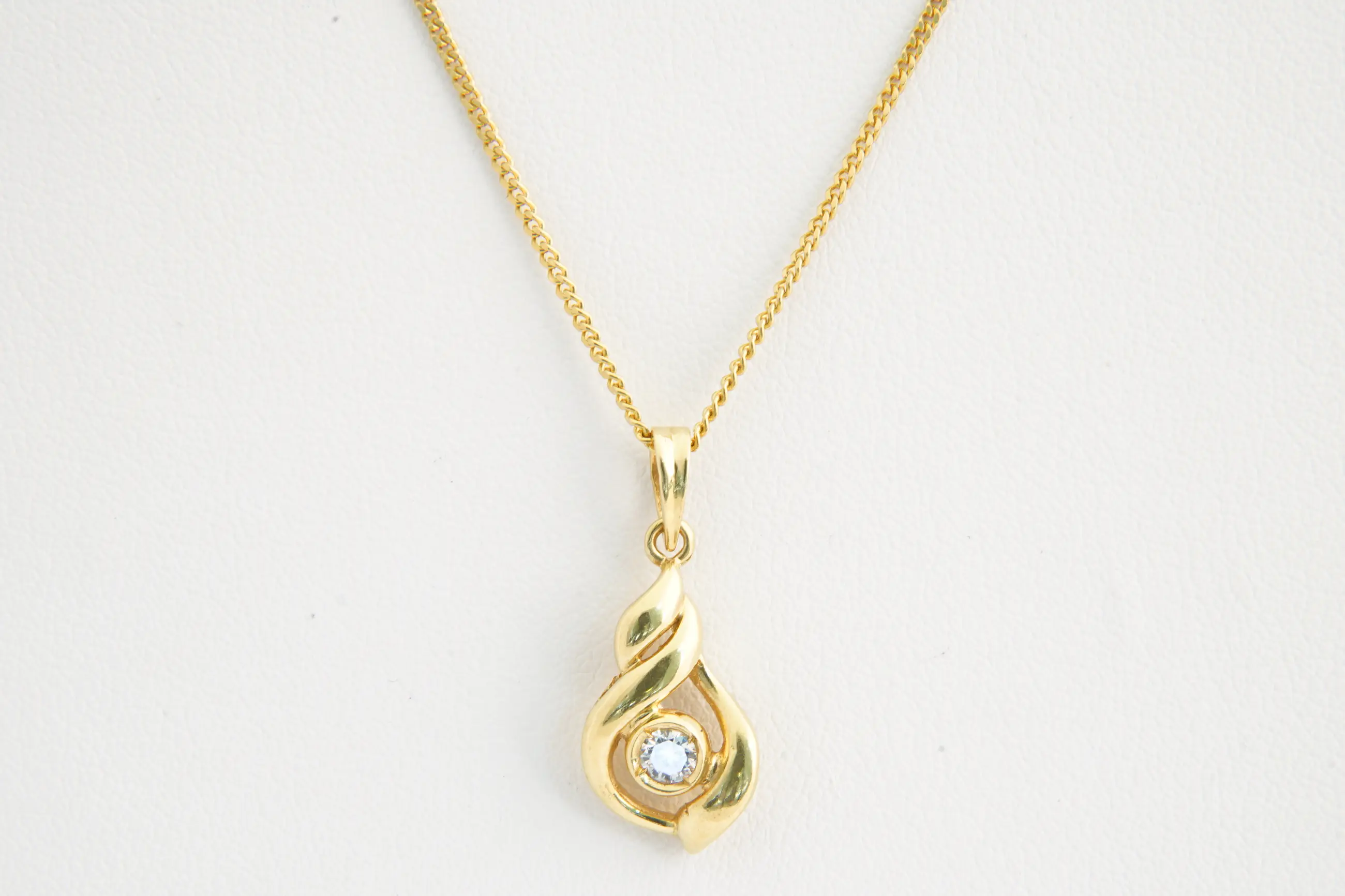 • U biedt op een fijn 18 karaats gouden gourmette collier met daaraan een fraaie traanvormige diamanten hanger gezet met een ca 0.10 crt. briljant geslepen (G/vs) diamant. Het halssieraad verkeert in goede conditie.