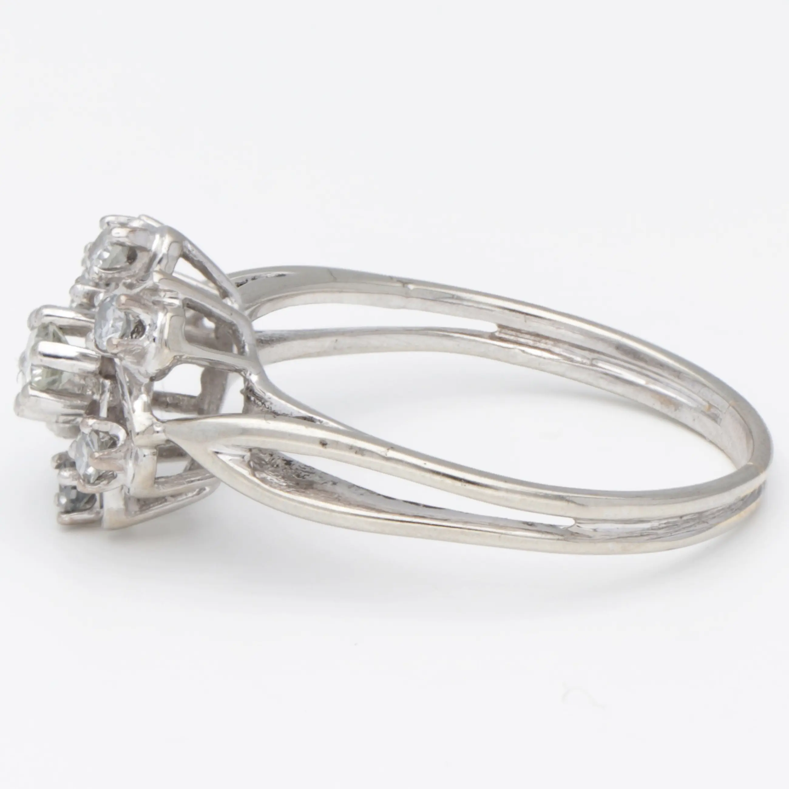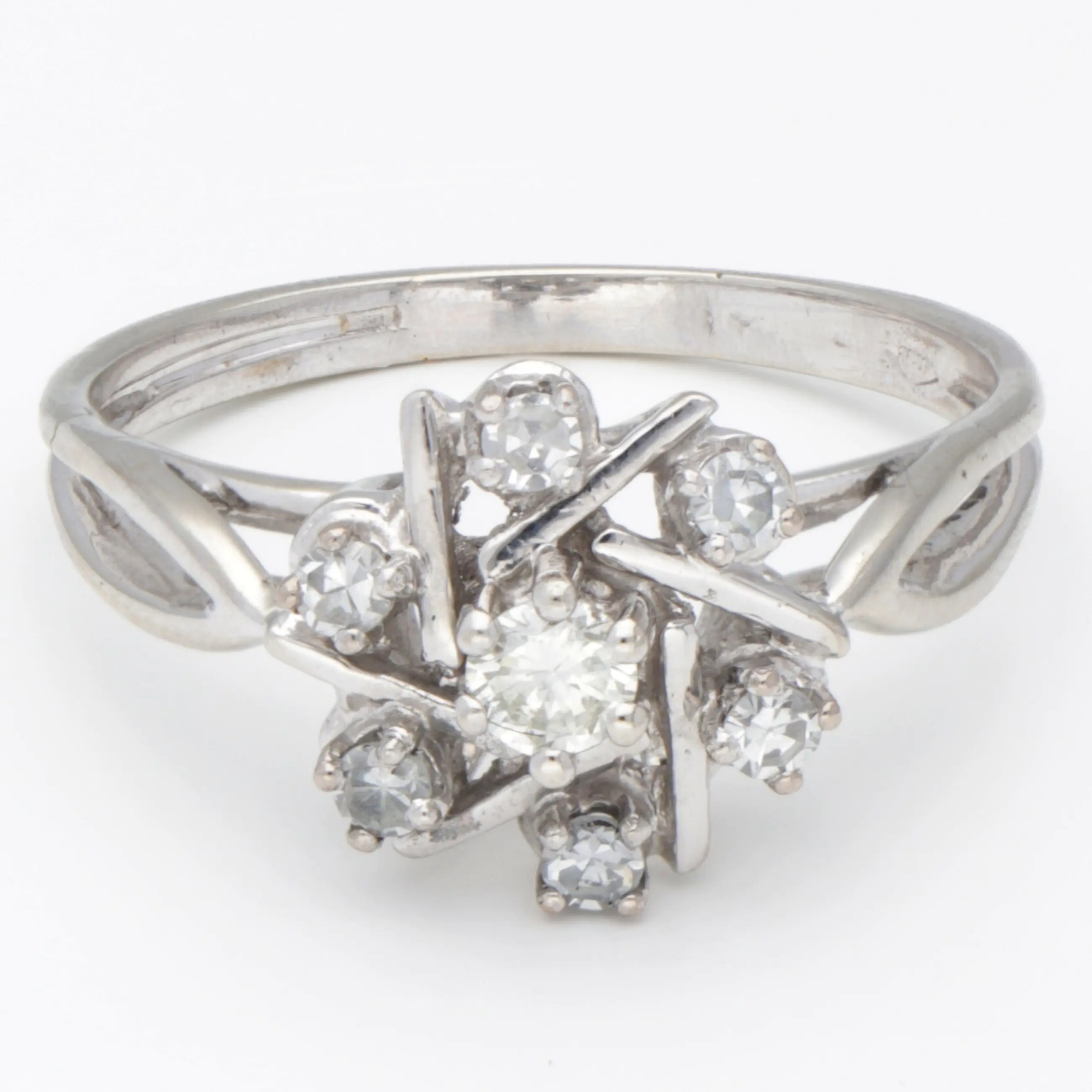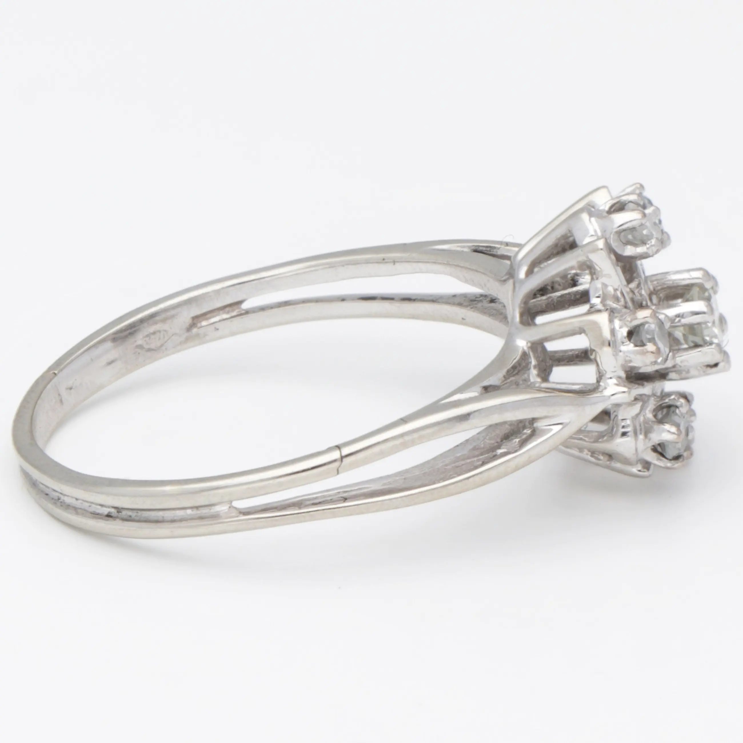 Witgouden ring bezet met een briljant geslepen diamant van ca. 0.17 ct. Tevens is de ring bezet met 6 single cut diamanten van totaal ca. 0.24 ct. De diamanten zijn in een chaton zetting gezet.