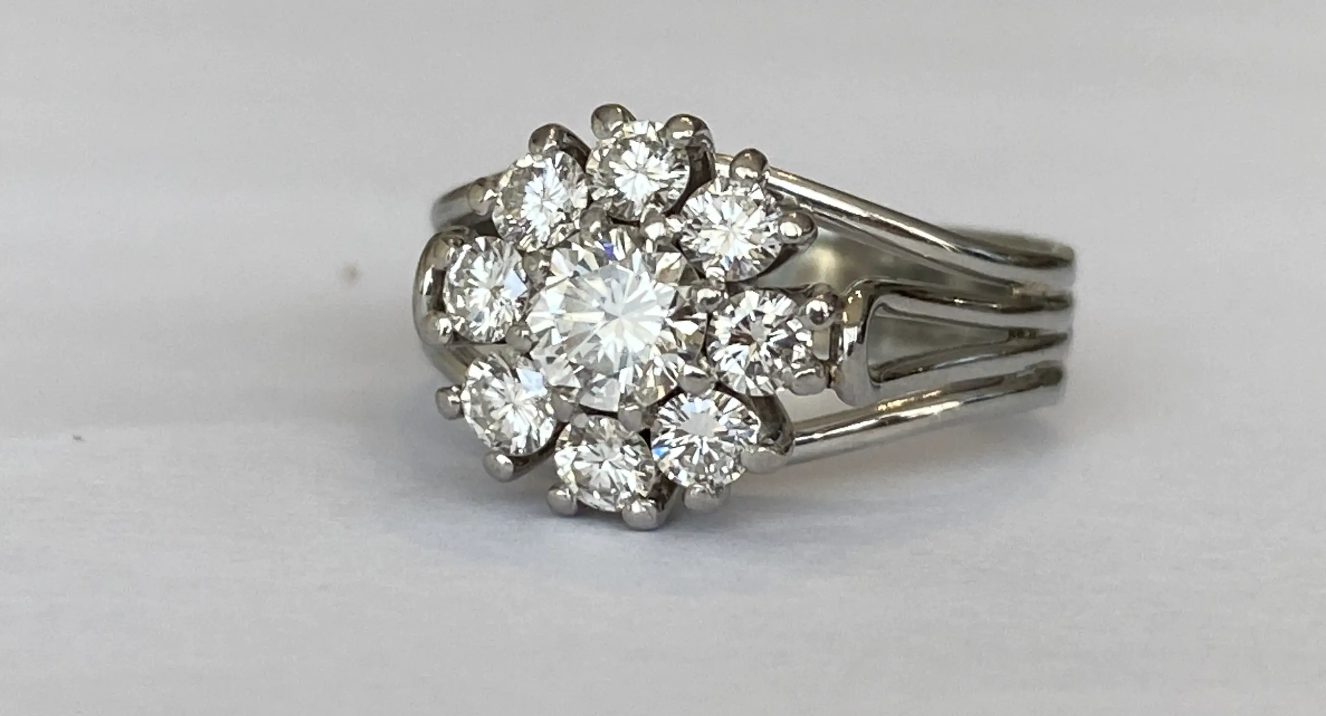 In goede staat aangeboden rozet ring in 18 kt witgoud, met in het midden een briljant geslepen diamant van ca 0,35 crt van kwaliteit H/VS. De steen is omringd door entourage van 8 stuks briljant geslepen diamanten totaal ca 0.56 crt van kwaliteit G/VS.