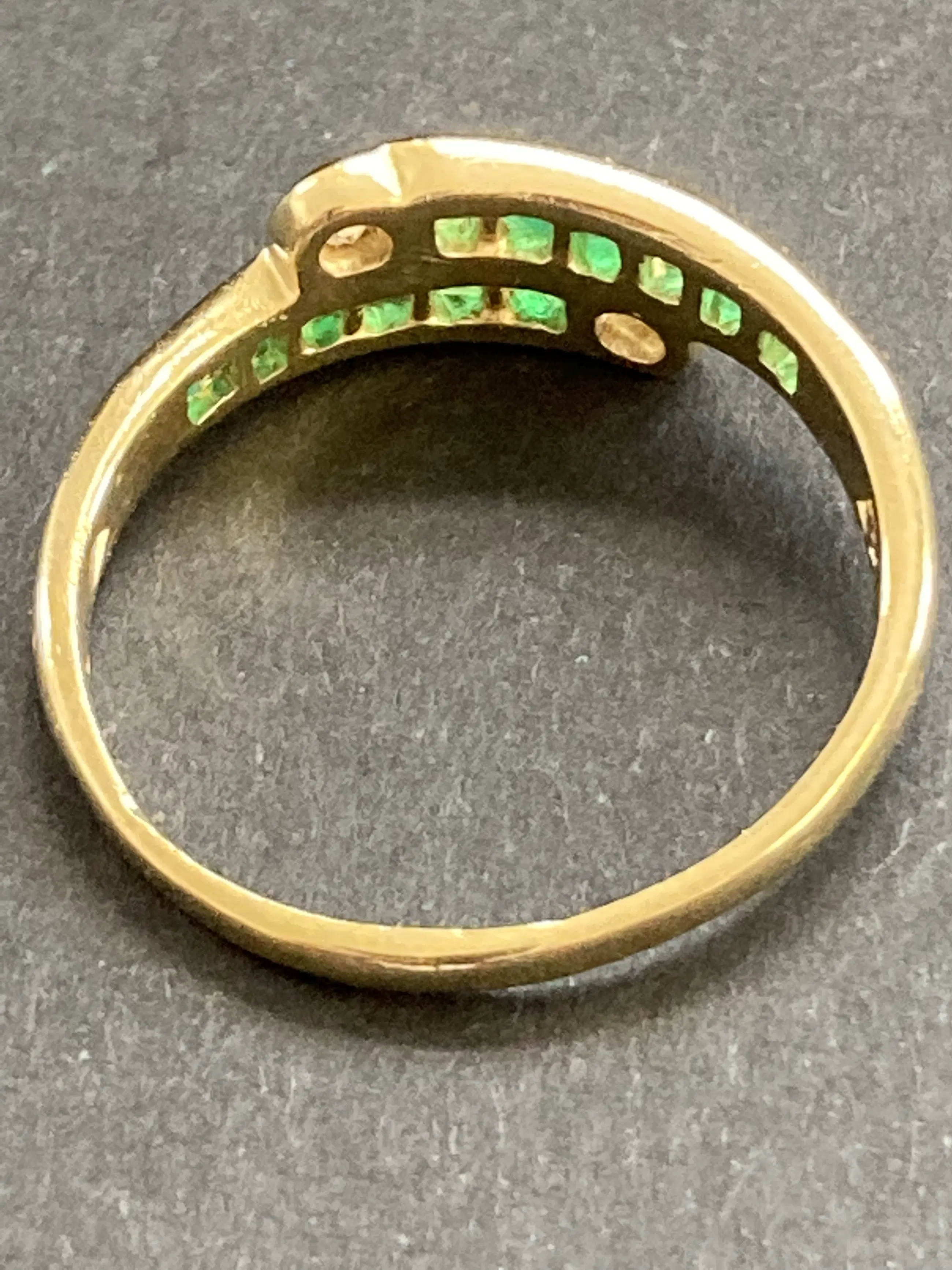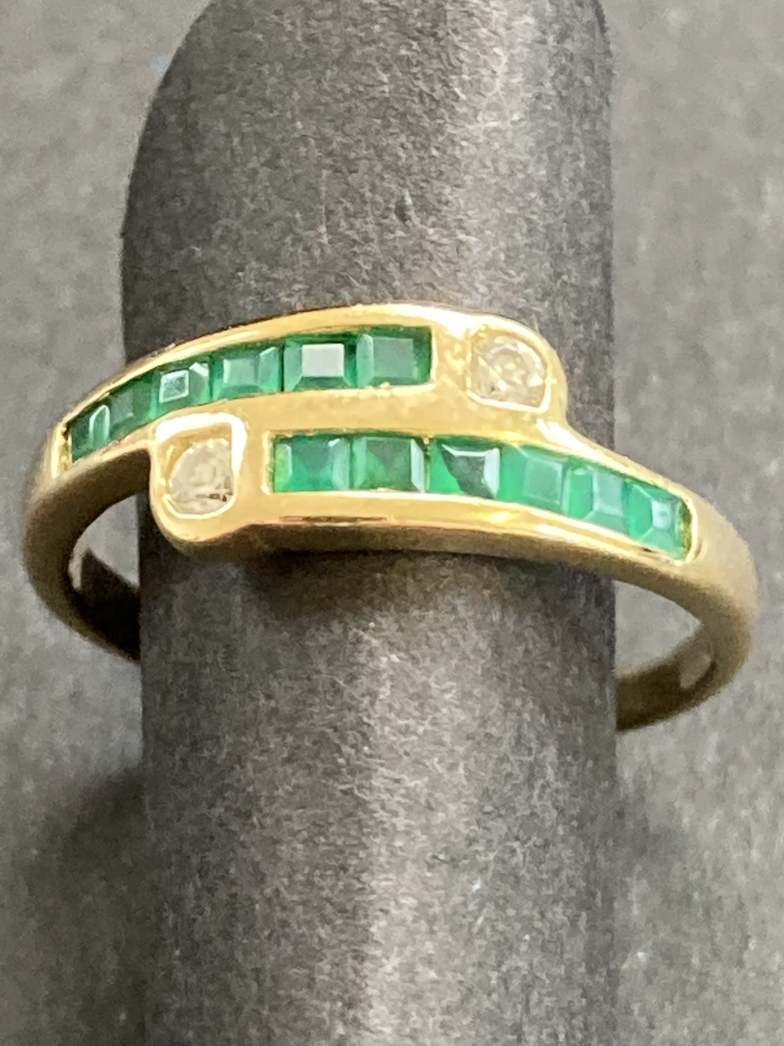 18 karaats geelgouden ring bezet met smaragd en zirkonia.