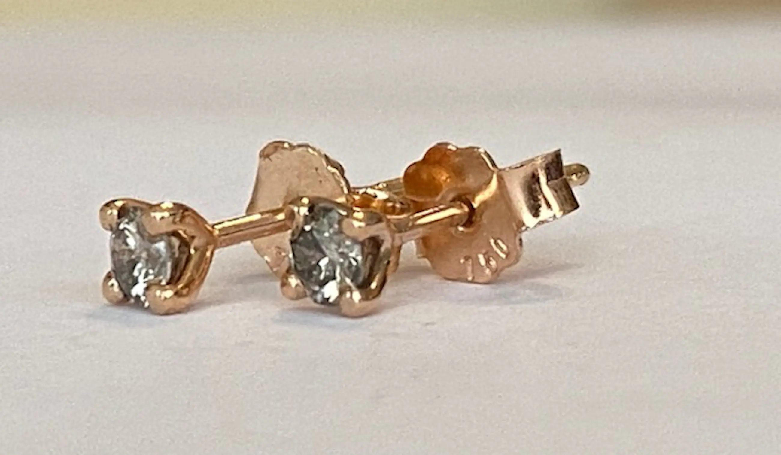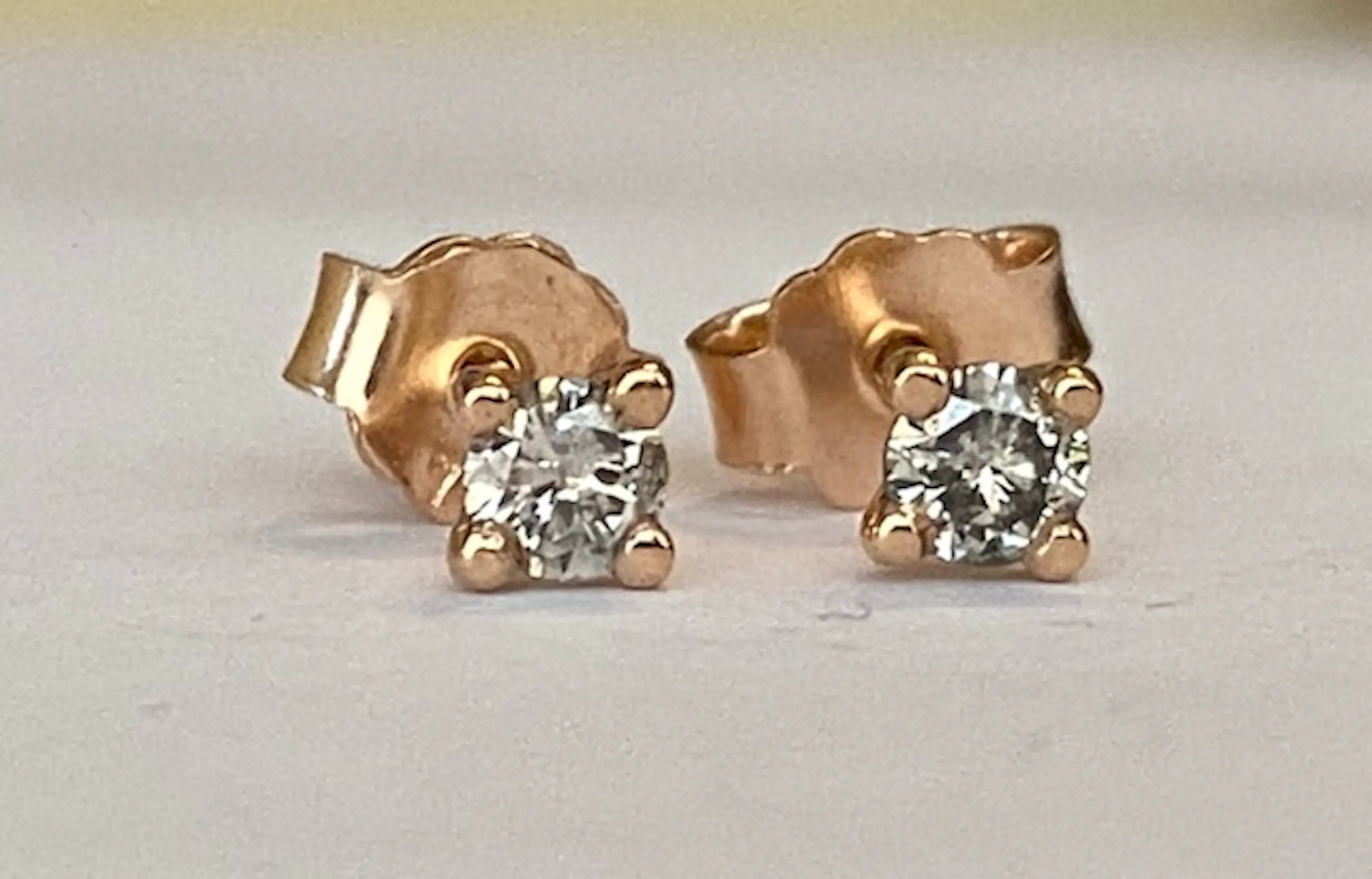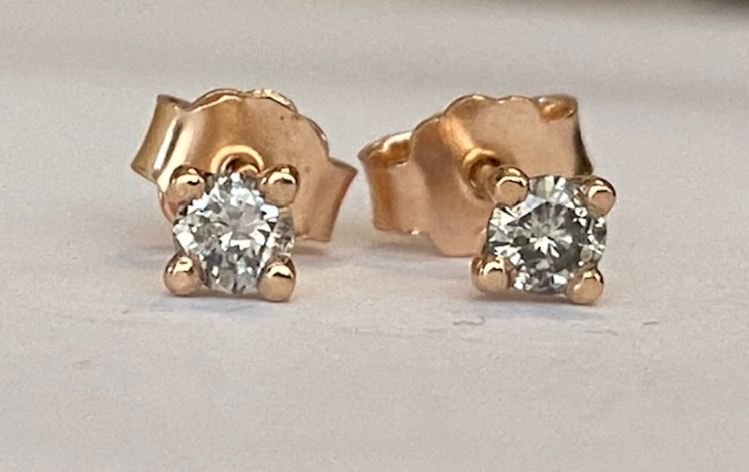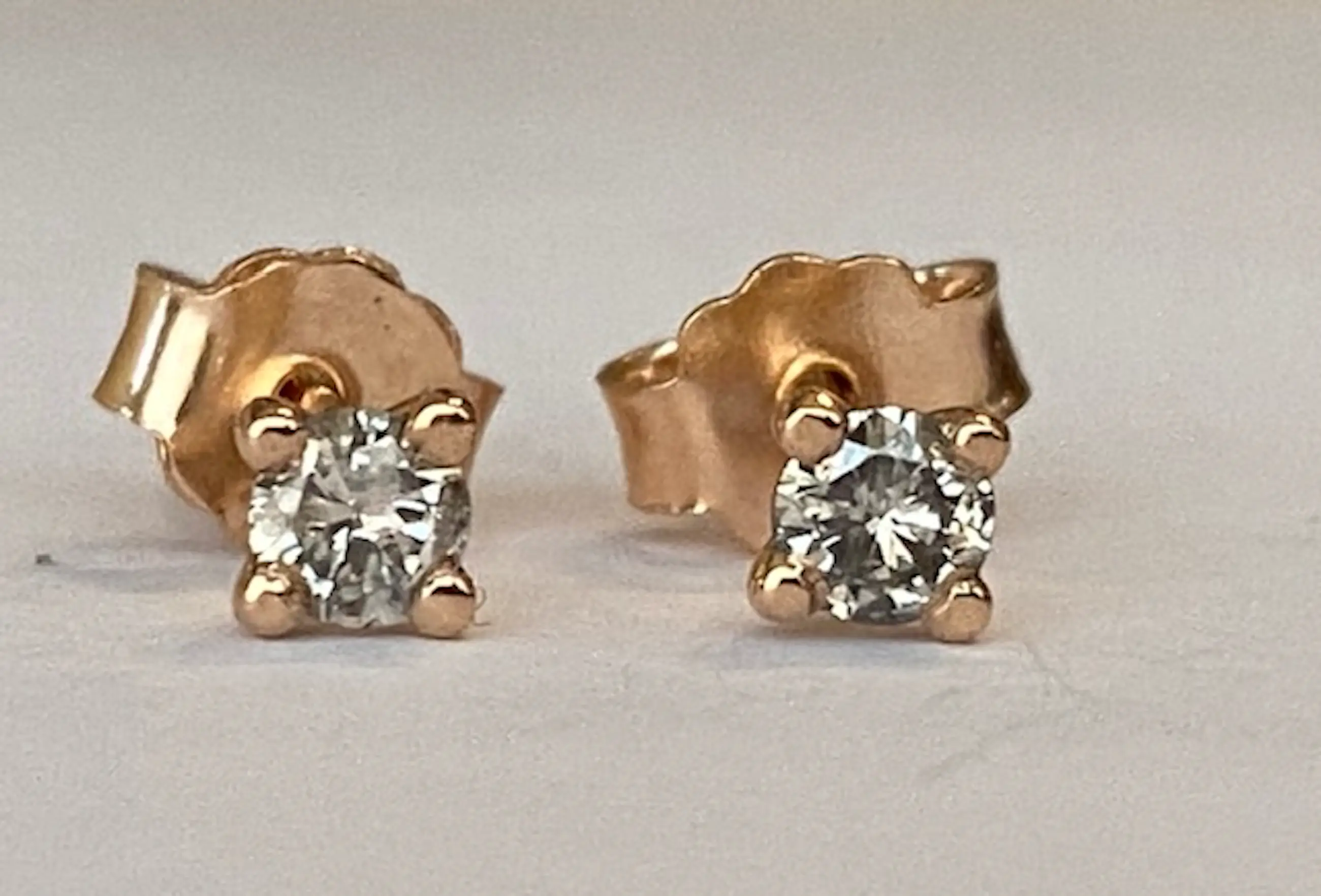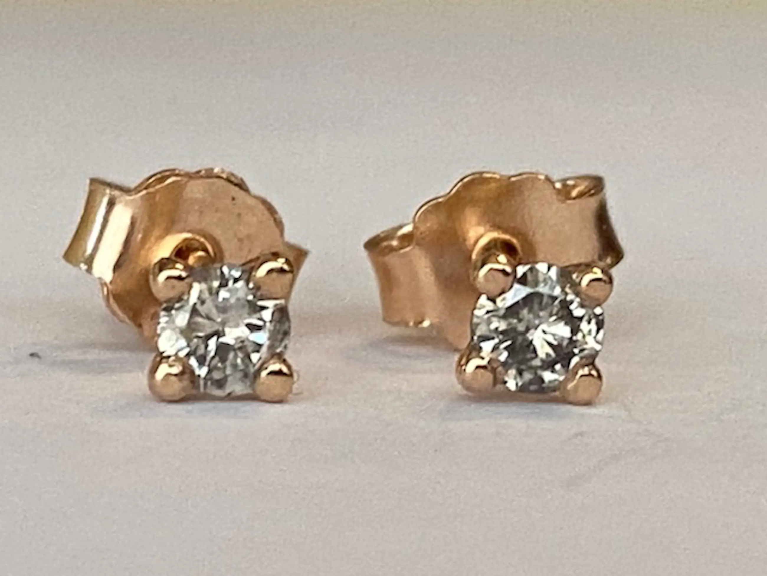 Aangeboden in uitstekende staat paar rosegouden rozet oorstekers met 2 stuks briljant geslepen diamanten in totaal ca 0.23crt van kwaliteit K/P2. Gehalte: 18KT (gekeurd 750)