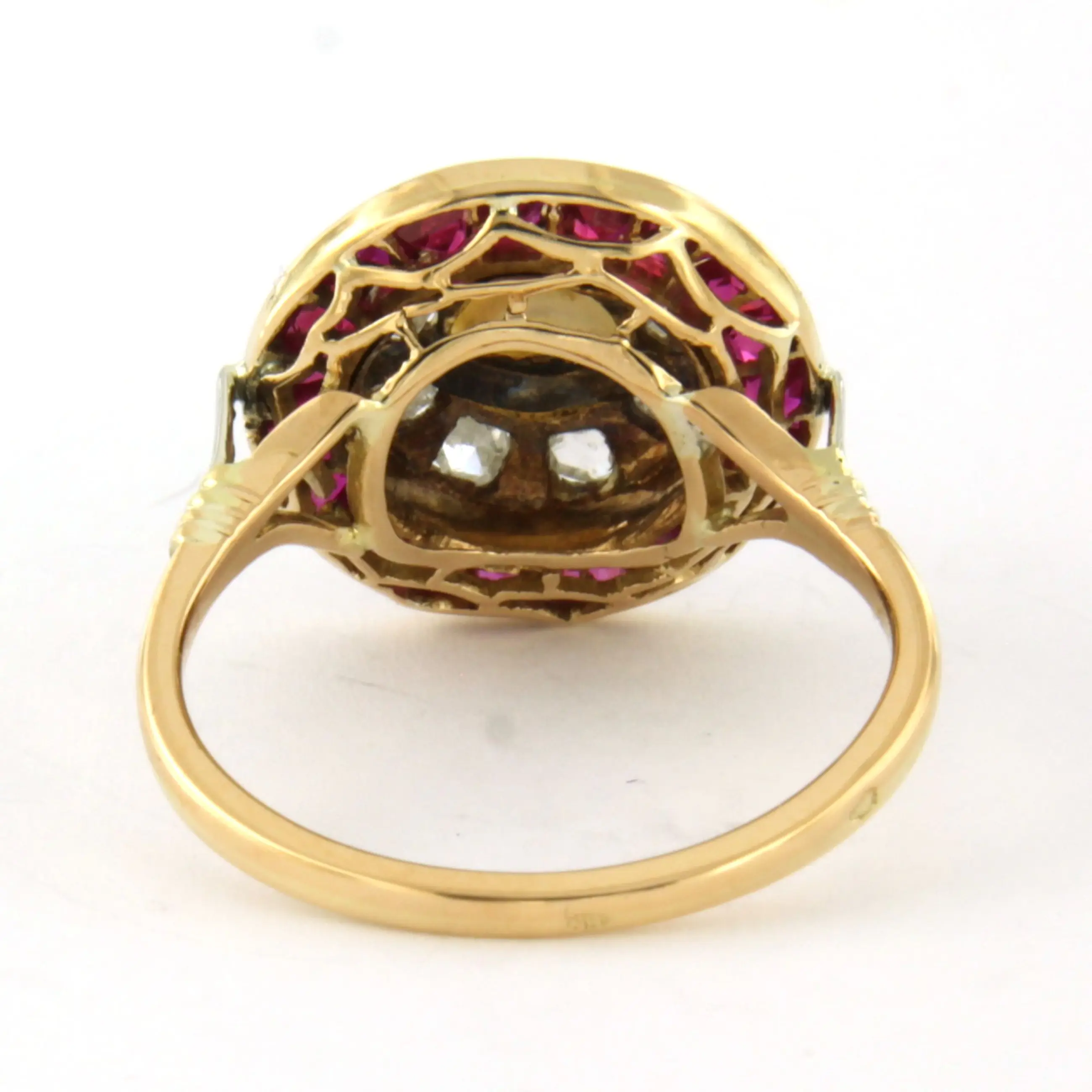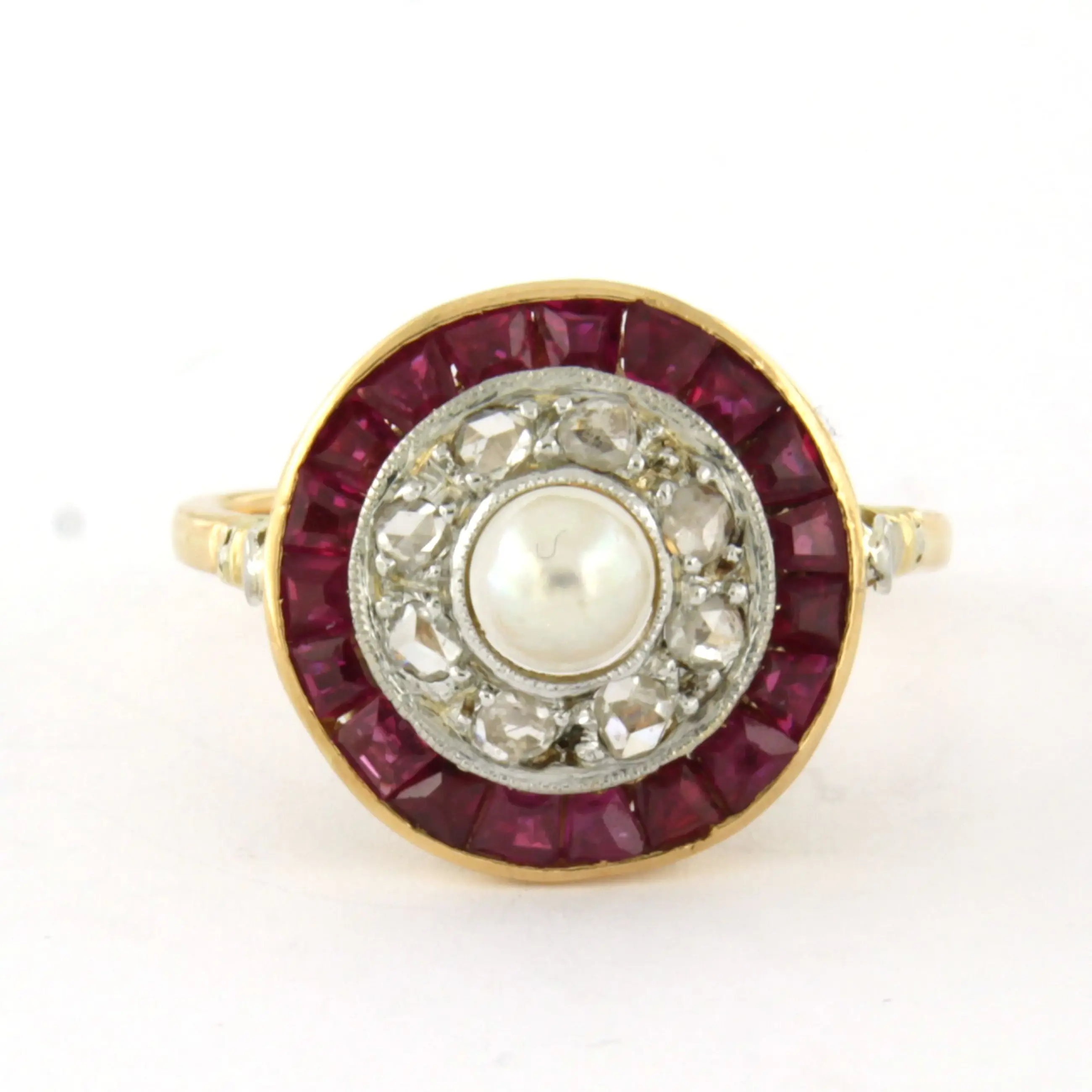 18k bicolour gouden ring met parel en erom heen robijn en roos diamanten