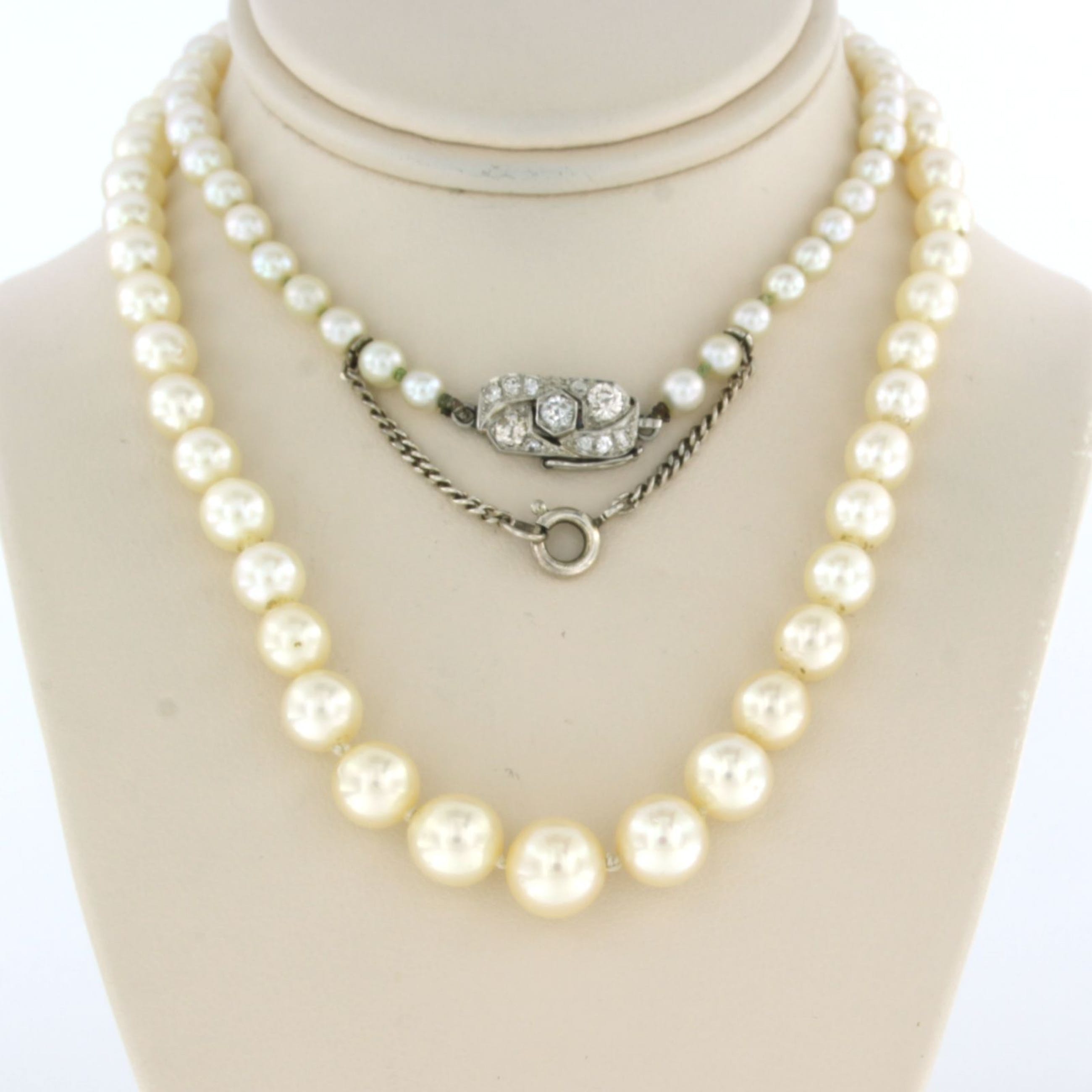 18k gouden art deco slot bezet met oud slijsel diamanten tot. 0.30ct aan een parelcollier - 50 cm lang