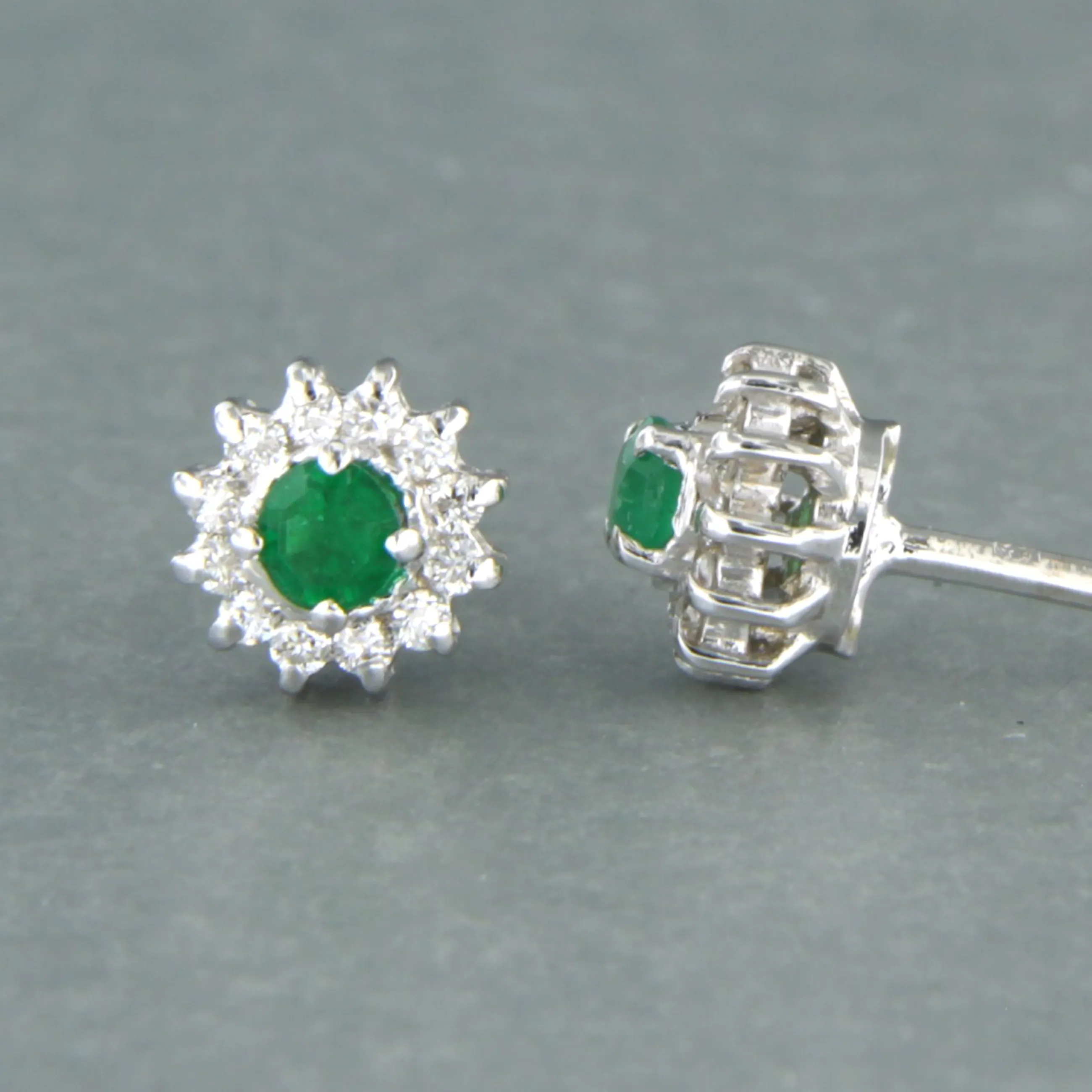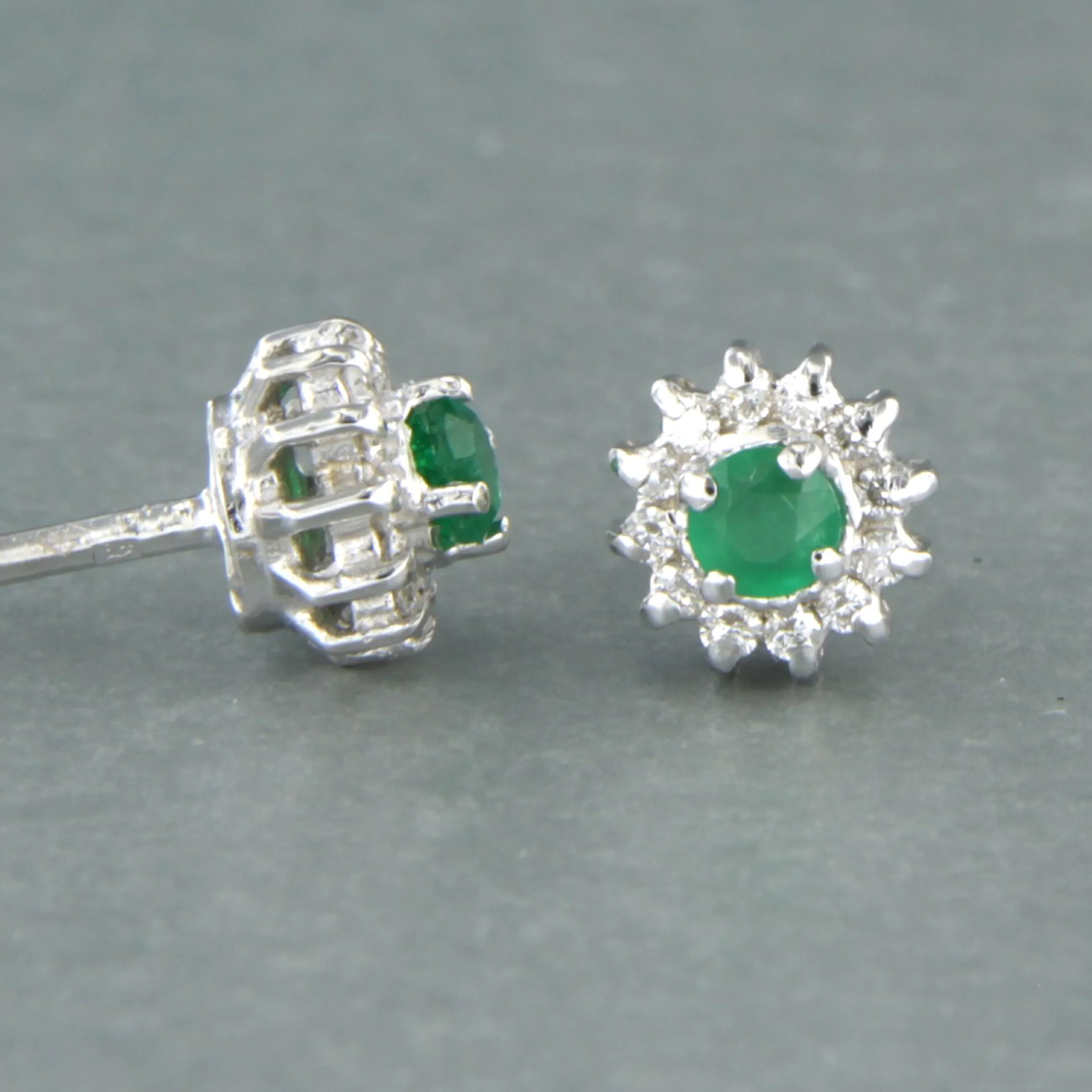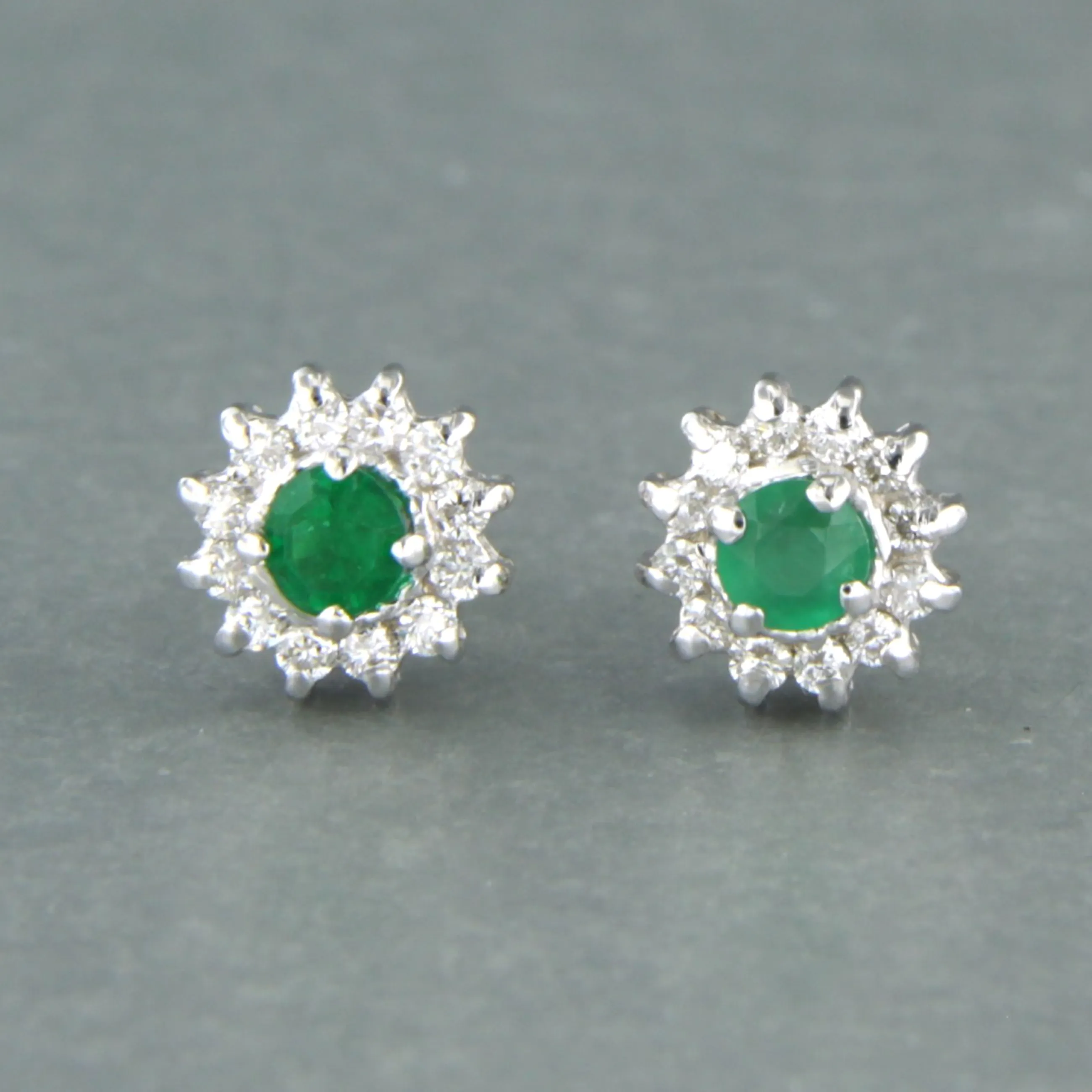 18k witgouden entourage oorknoppen bezet met smaragd tot. 0,24ct en aan entourage briljant geslepen diamant tot. 0.20ct - F/G - VS/SI