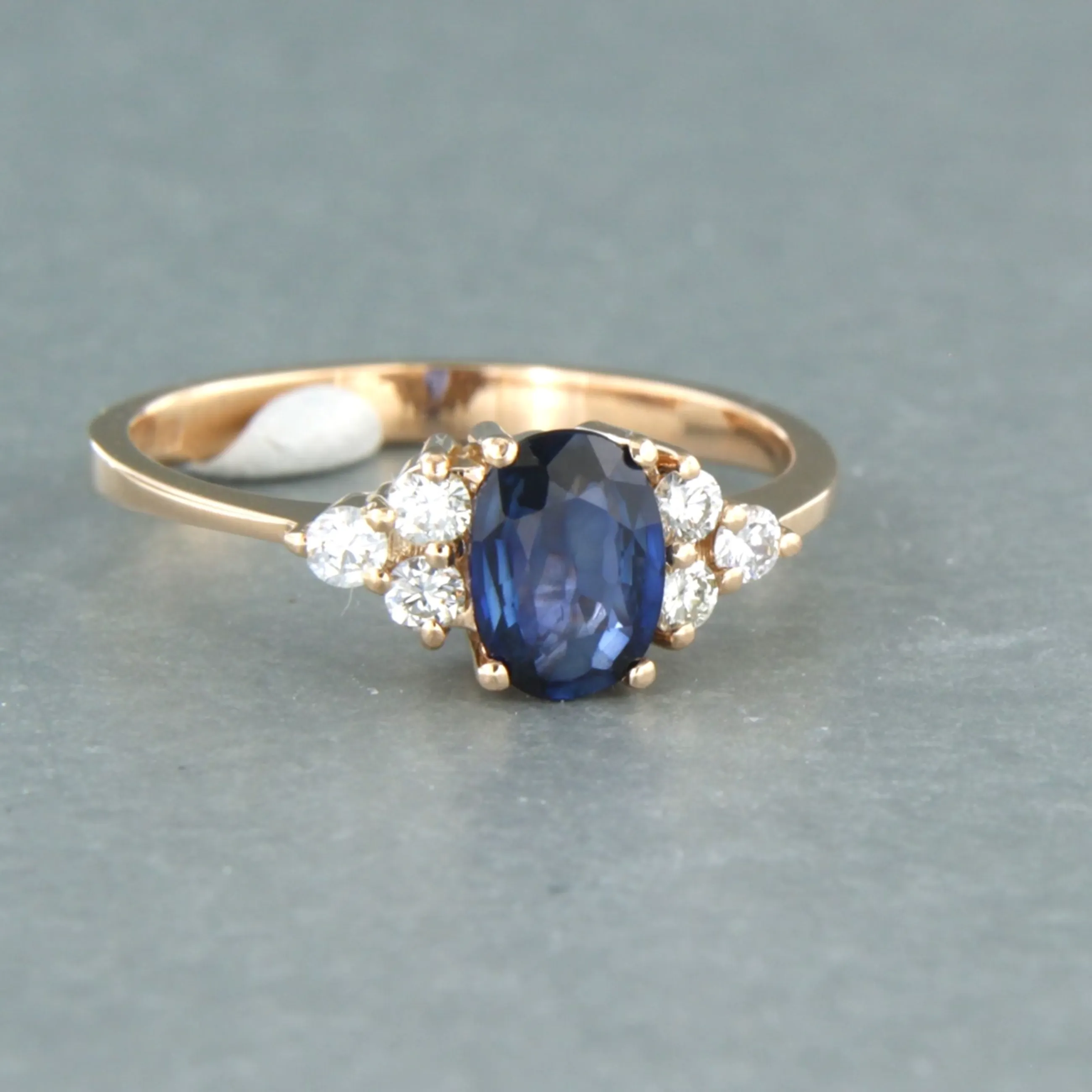 18k rosé gouden ring bezet met centraal een saffier tot. 0,90ct en briljant geslepen diamanten tot. 0,20ct - F/G - VS/SI - ringmaat 17.5(55)