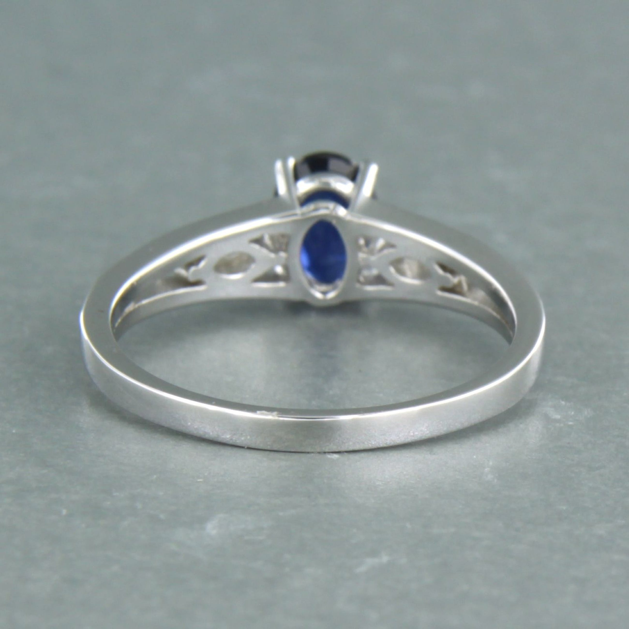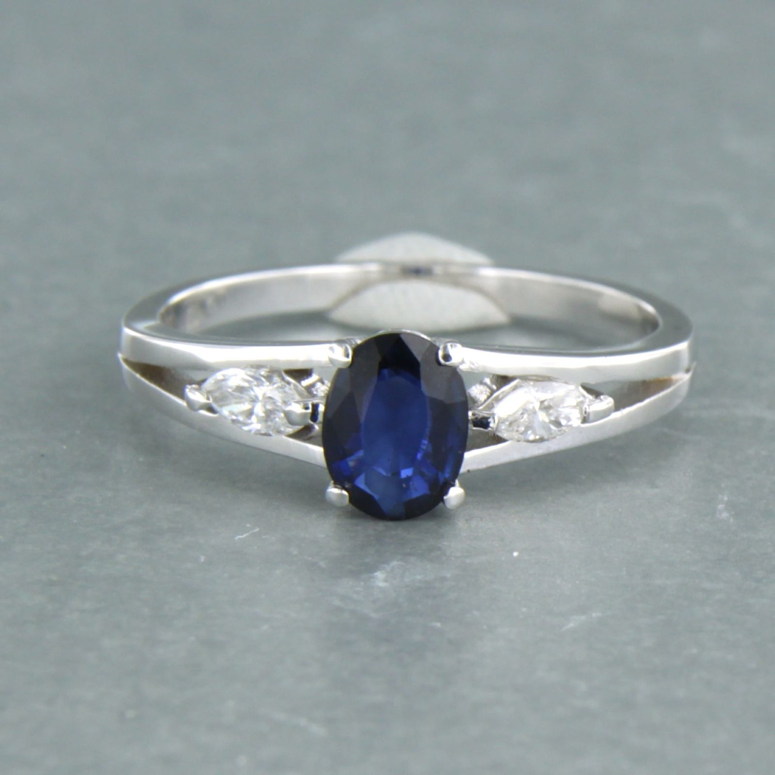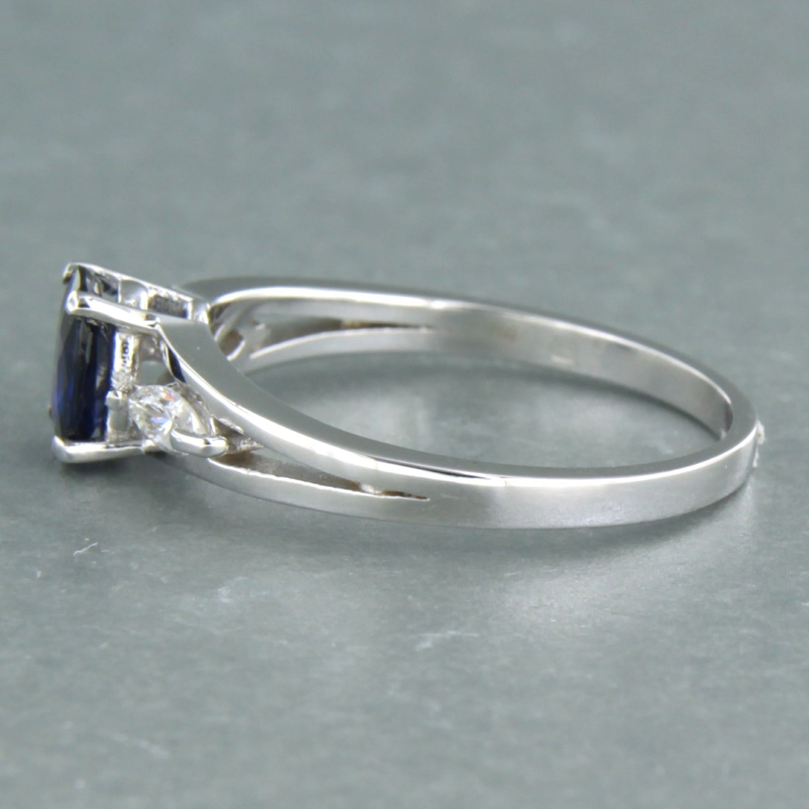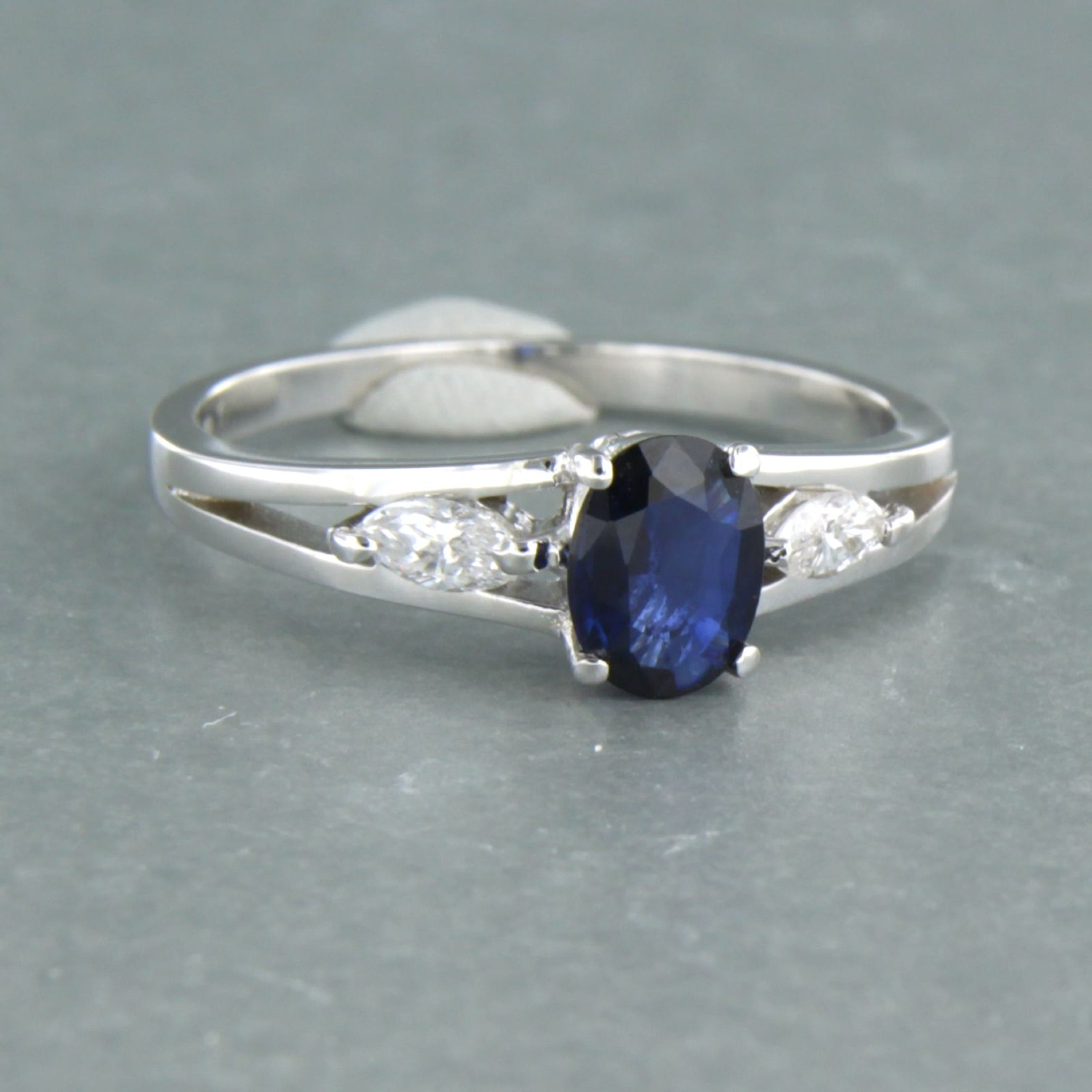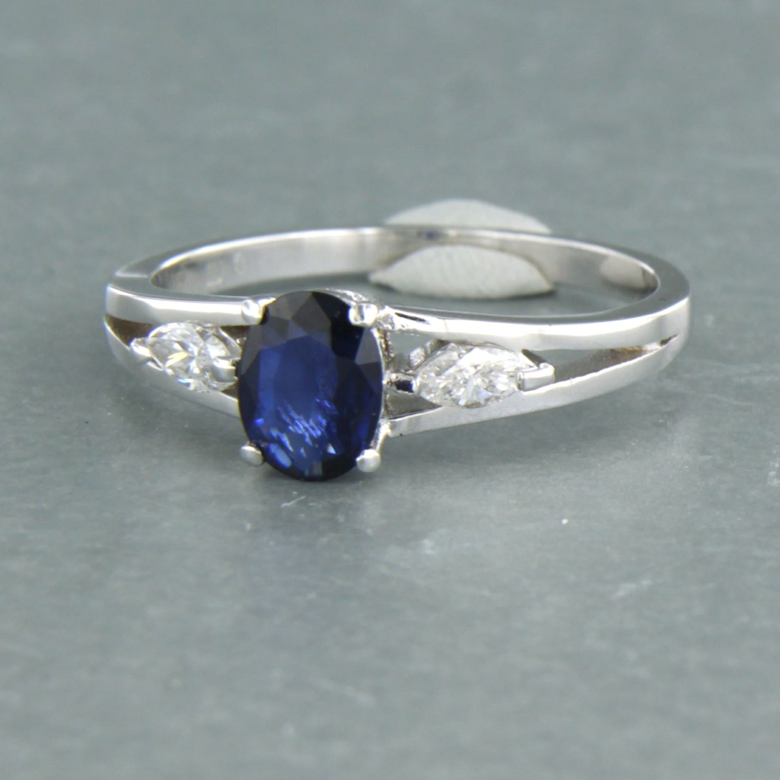18k wit gouden ring bezet met saffier tot. 0,70ct en markies geslepen diamant tot. 0,20ct - F/G - VS/SI - ringmaat 17.5 (55)
