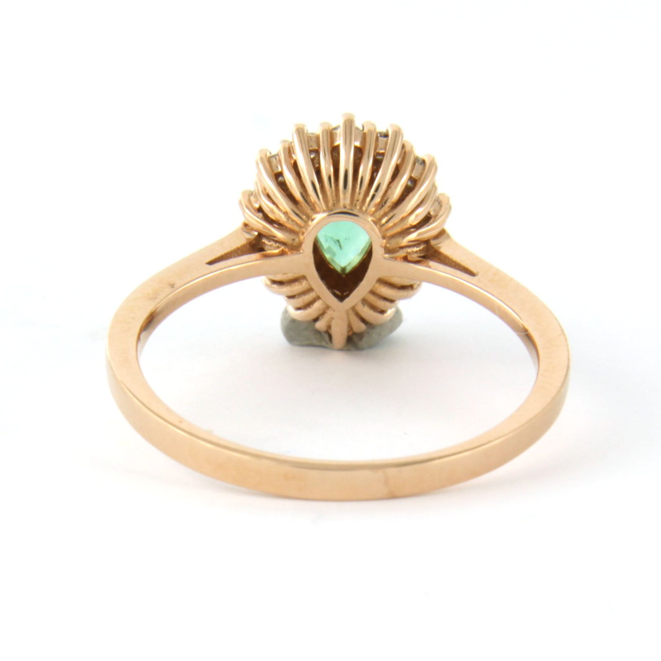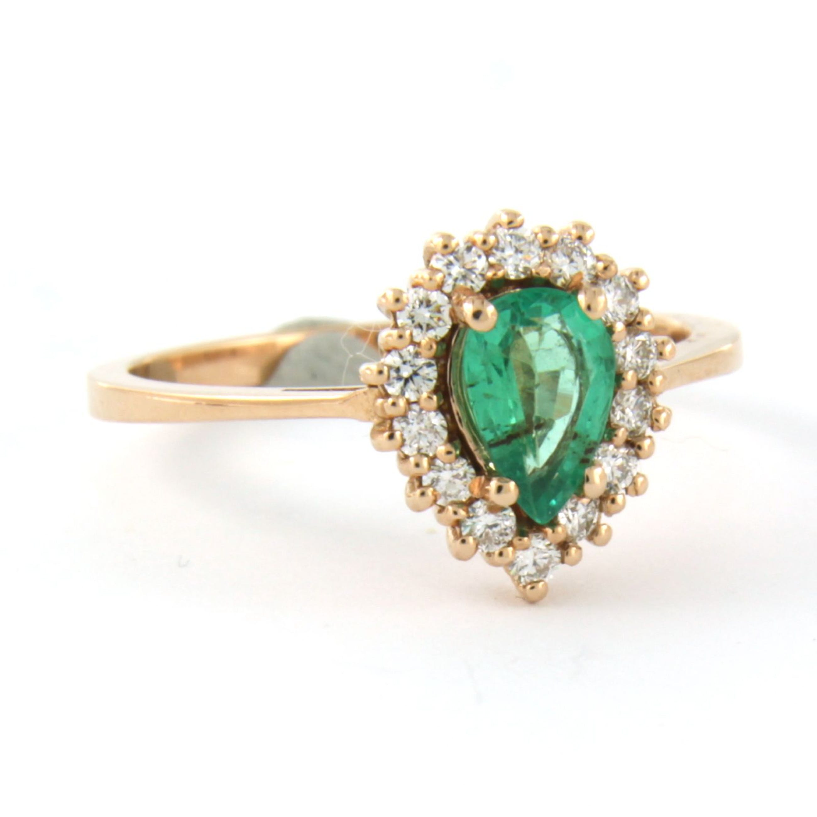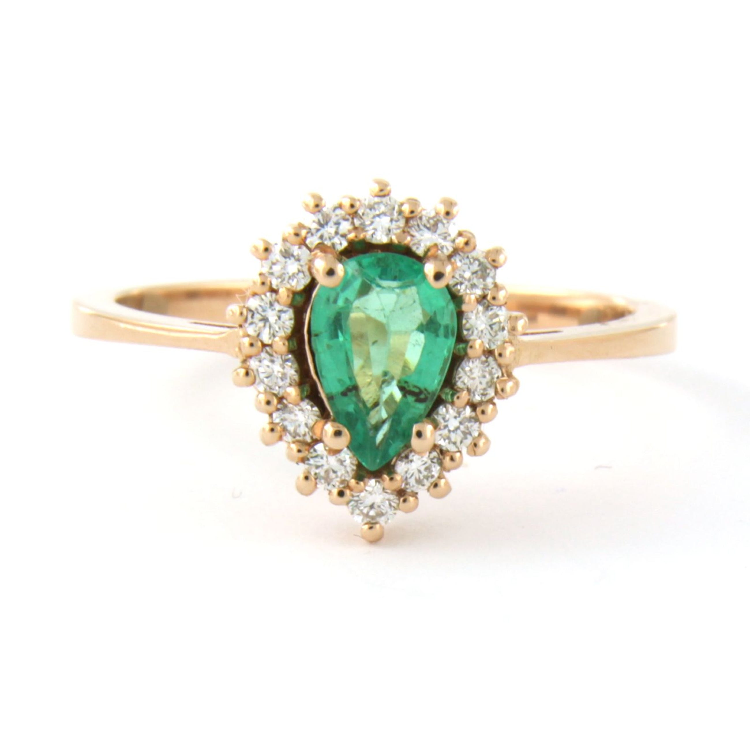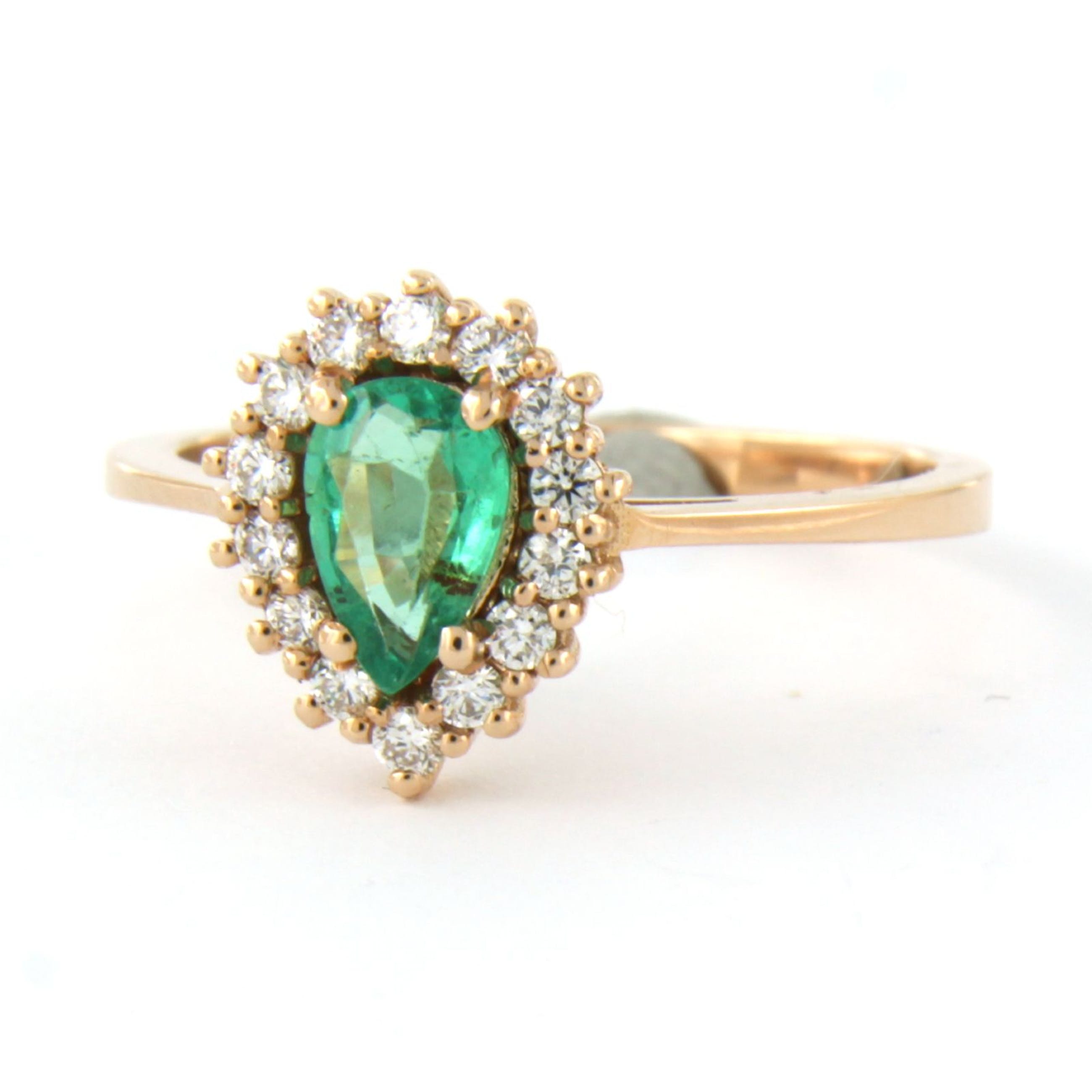 18k rosé gouden entourage ring bezet met centraal een druppel vorm smaragd tot. 0,70ct en aan entourage briljant geslepen diamant tot. 0,26t - F/G - VS/SI - rïngmaat 17,5(55)